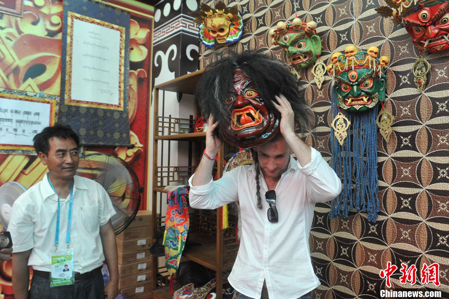 9月3日,上海世博會西藏活動周進(jìn)入第3天。土耳其姑娘Esmeralda Sinani來到上海世博會寶鋼大舞臺,體驗藏族文化。圖為Esmeralda Sinani在喝酥油茶,并向藏族人吉吉了解酥油茶相關(guān)的文化。 中新社記者 蔣雪林 攝