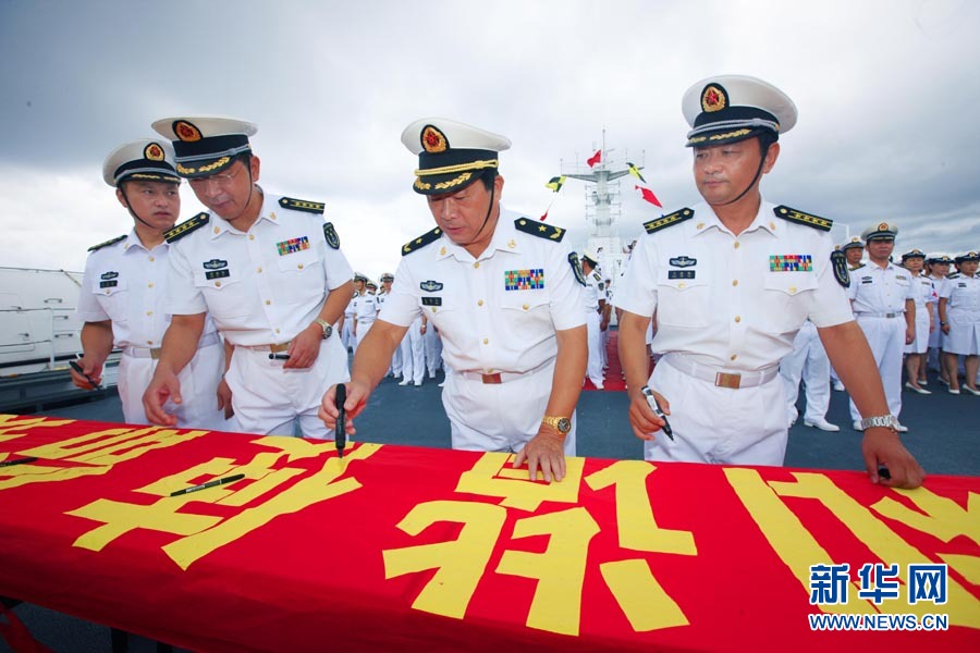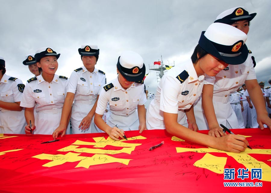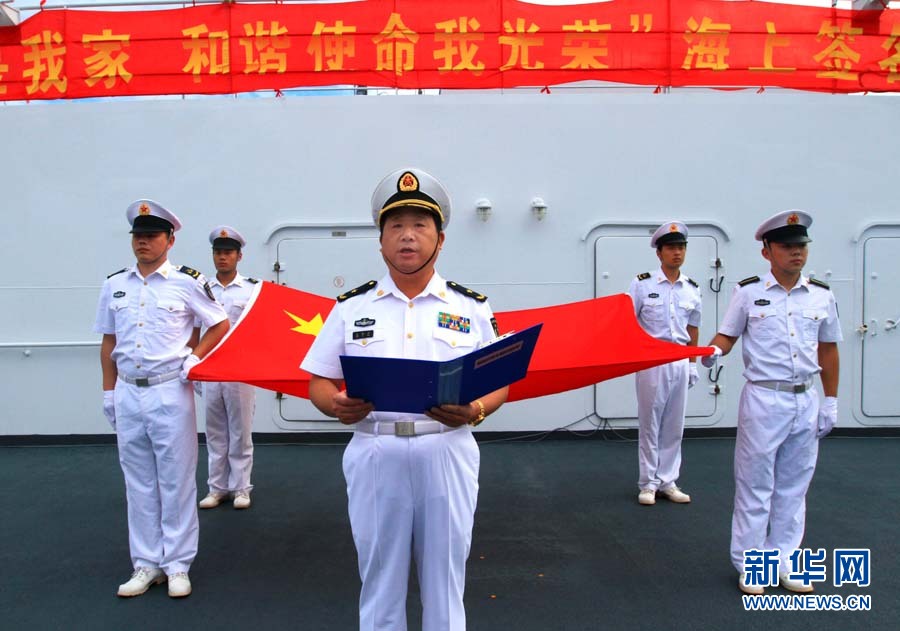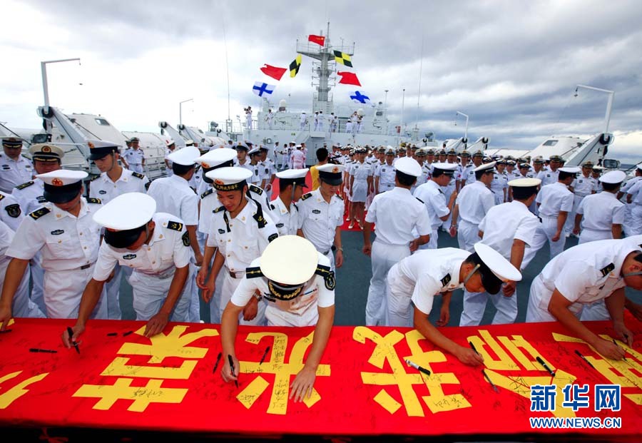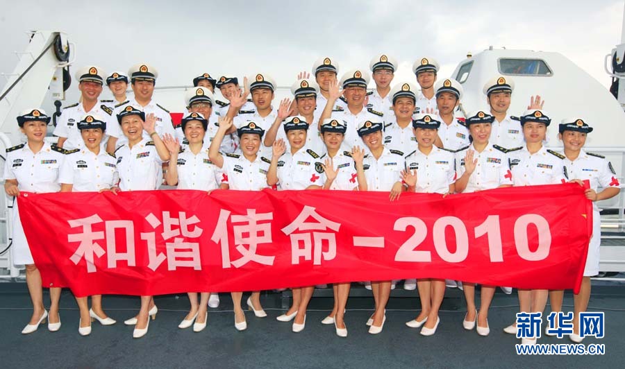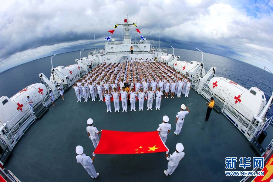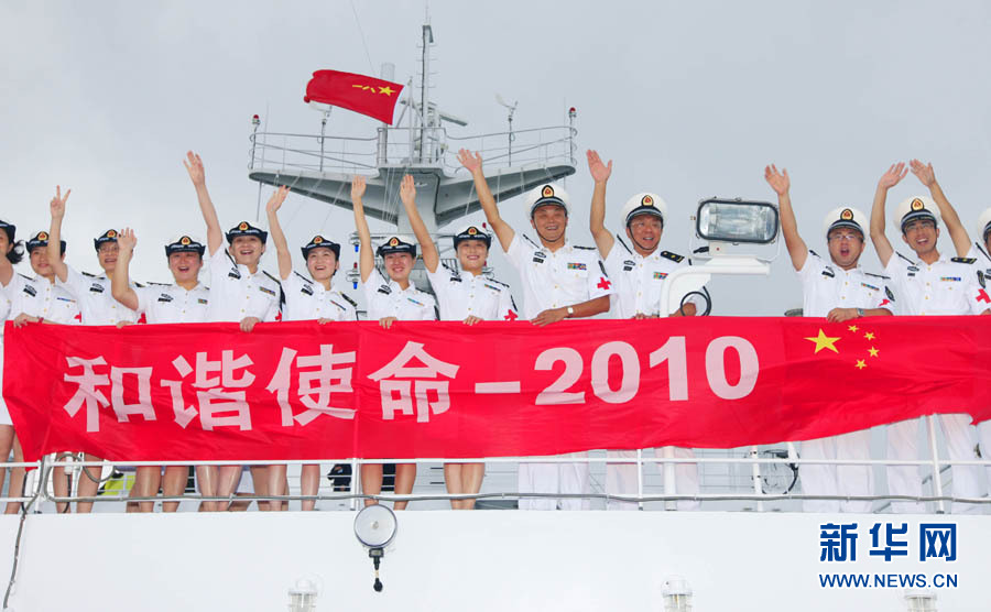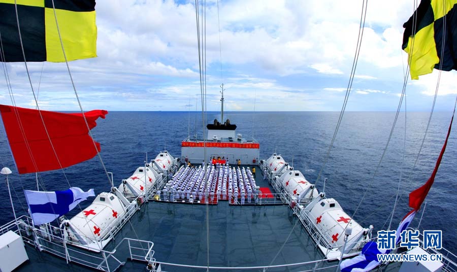9月6日,“和平方舟”號醫院船舉行宣誓儀式。當日,經過連續多天的航行,前往亞丁灣海域及吉布提等亞非五國執行“和諧使命—2010”任務的中國“和平方舟”號醫院船駛出國門。這是“和平方舟”號醫院船首次穿越南海駛向大洋。428名官兵及醫務人員全程參加這次為期87天的任務,總航程將達1.5萬多海里。自8月31日駛離舟山碼頭后,醫院船經受了“獅子山”“圓規”“南川”臺風的考驗,穿越臺灣海峽、西沙群島和南沙群島,順利抵達南海。查春明 攝 圖片來源:新華網