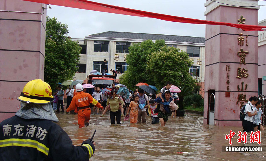 9月9日,四川省南充市突降暴雨,造成該市的高坪、嘉陵、順慶等主城區部分低洼地帶積水嚴重。高坪區第八小學、第六小學,嘉陵區光彩實驗小學被洪水圍困,南充消防官兵緊急出動,及時將被洪水圍困900多名小學生轉移至安全地帶。圖為消防、老師正在轉移受困學生。中新社發 南消萱 攝