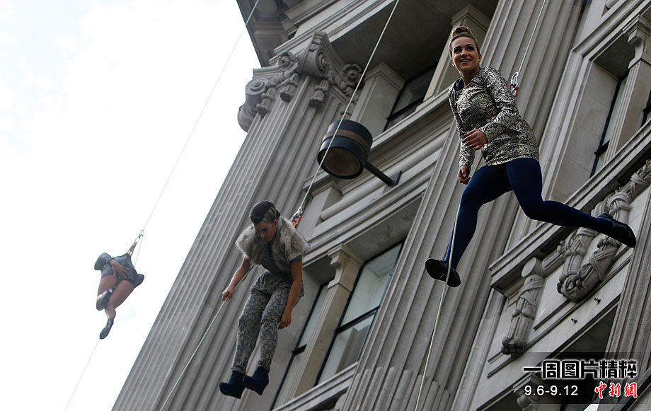 當地時間9月6日,一批模特在英國倫敦掛上鋼絲,在大樓外上演了一場精險刺激的空中時裝秀。這場時裝秀是為了宣傳即將到來的英國時裝周而特別設計的。
