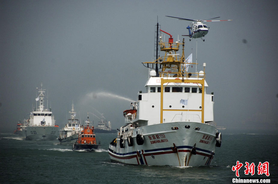 9月16日上午,2010年海峽兩岸海上聯合搜救演練在臺灣海峽的廈門、金門附近海域舉行。海峽兩岸海上搜救單位參演人數400多人,共動用搜救船舶14艘、救助飛機3架。其中大陸方面主要參演船舶9艘、救助直升機2架;臺灣方面主要參演船舶5艘、救助直升機1架。這是自2008年12月15日兩岸海上直航正式啟動以來,海峽兩岸海上搜救力量首次共同進行的大規模海陸空聯合搜救演練。圖為演練現場。中新社發 王東明 攝