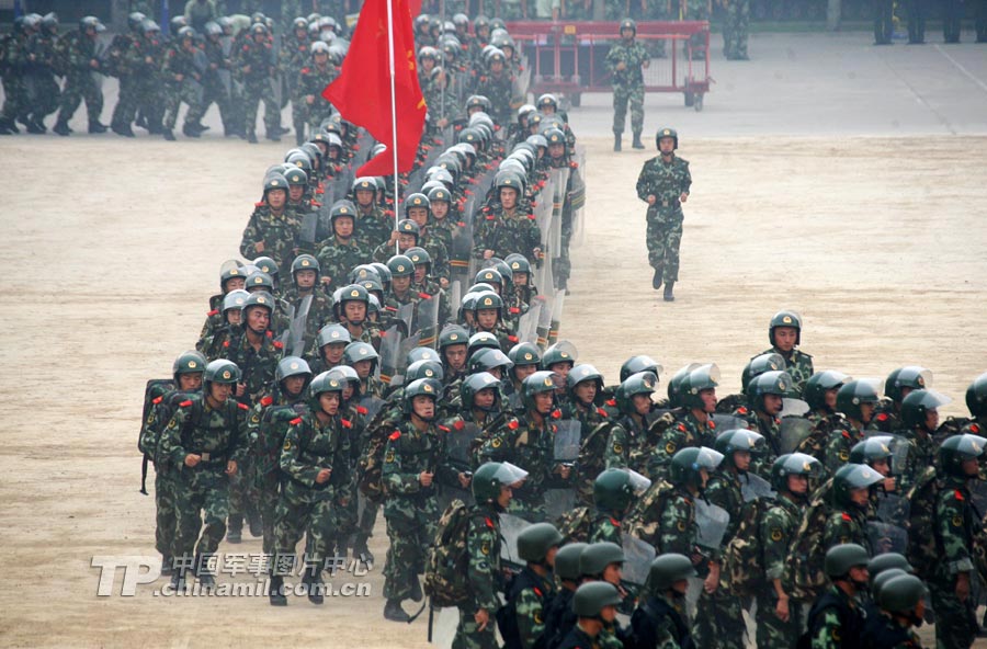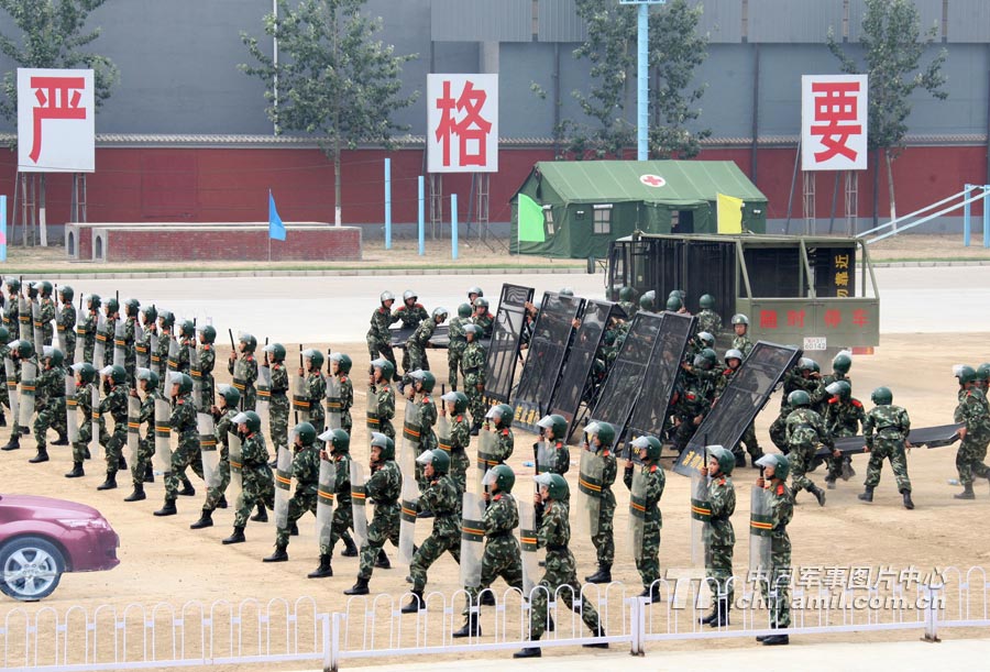 訓練場內,面對各種突發情況,官兵手持盾牌、警棍,排成各種陣型,疾進如風,徐推如林……