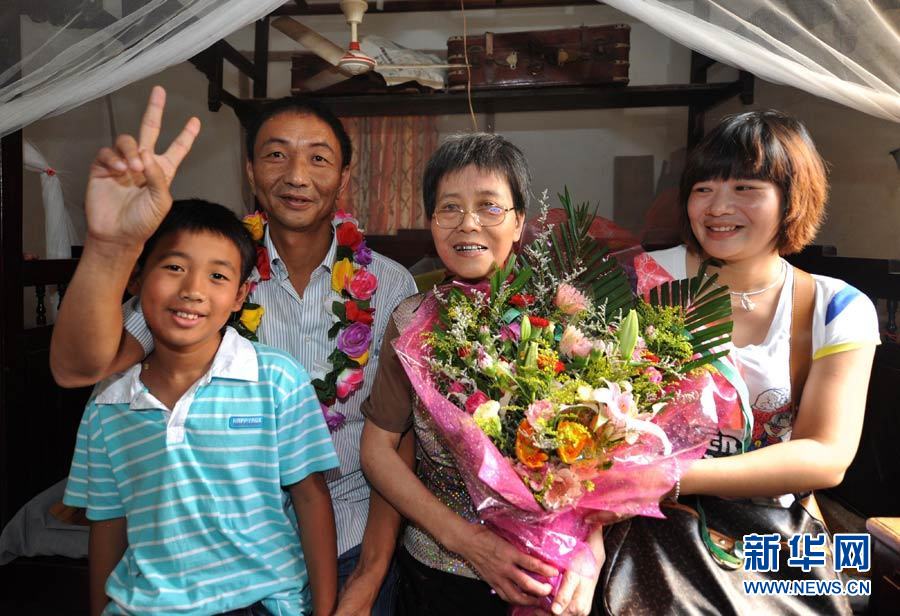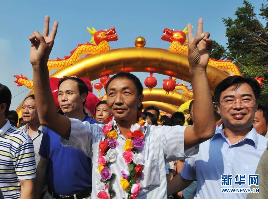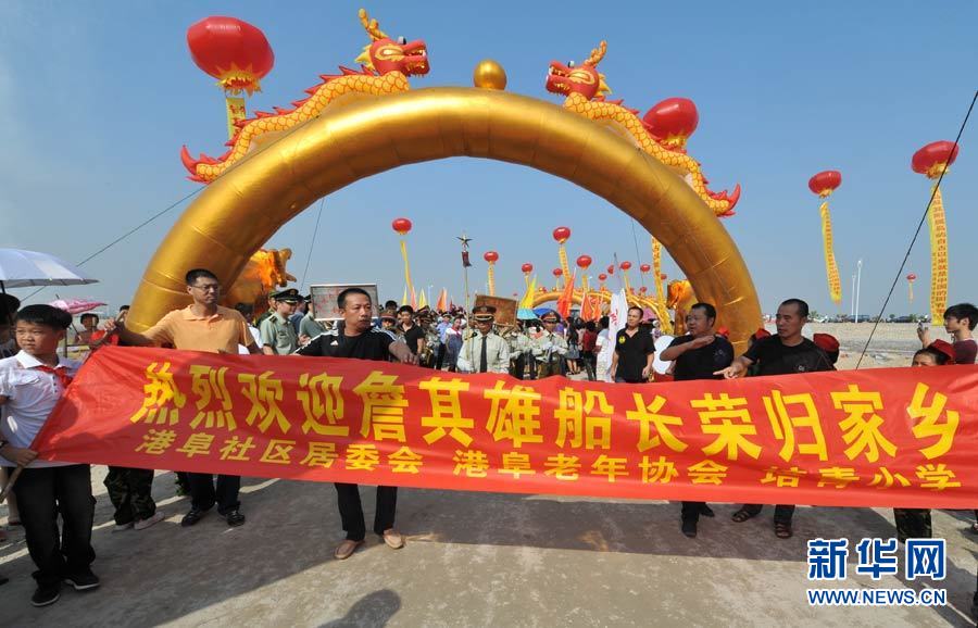 9月27日,被日方非法抓扣的中國漁船船長詹其雄返回家鄉--福建晉江市深滬鎮港滬村。當地鄉親熱情迎接他歸來。圖為詹其雄(圖中)下車后笑容滿面,受到了當地民眾的熱烈歡迎。中新社發 孫虹 攝