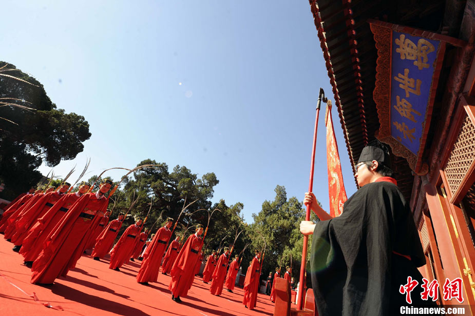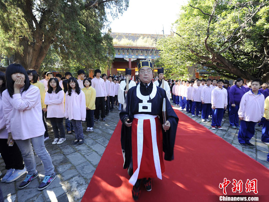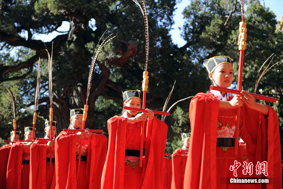 9月28日上午,兩岸師生聯合祭孔大典儀式在北京孔廟舉行。來自臺灣和北京的兩岸師生共計500人,共同祭奠孔子,弘揚中華傳統文化。中新社記者 劉震 攝