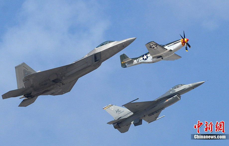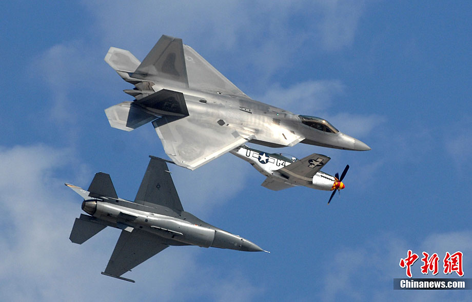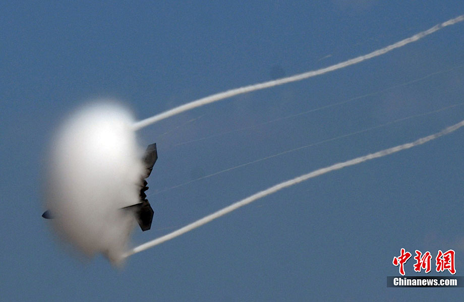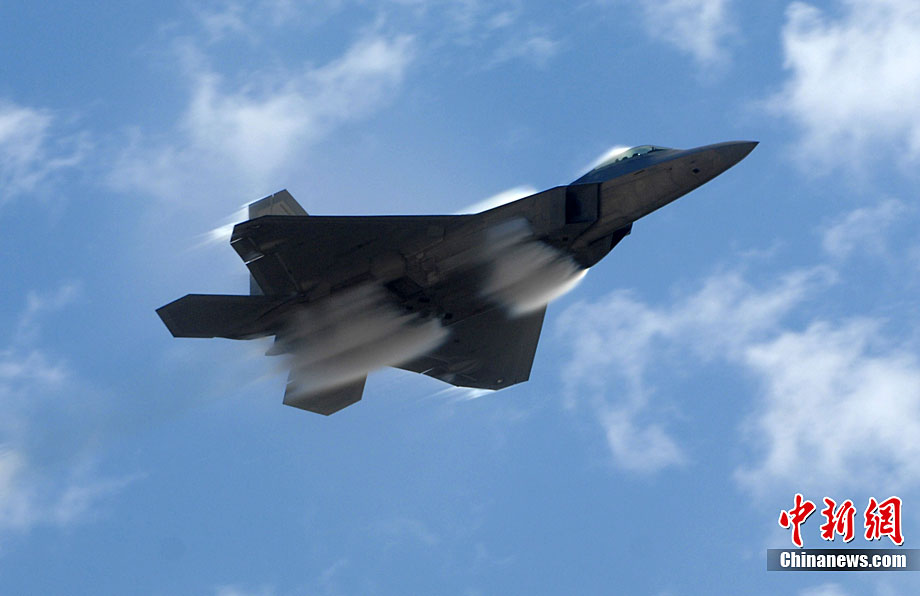 當地時間10月3日,美國著名的密拉瑪航空展在加州密拉瑪海軍陸戰隊航空基地舉行。三天的航空展示和飛行表演吸引了近70萬人次參觀。圖為美軍最先進的F-22猛禽戰機空中英姿。中新社發 張煒 攝