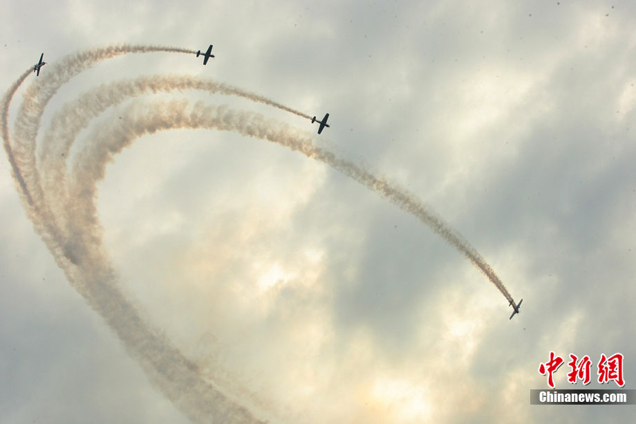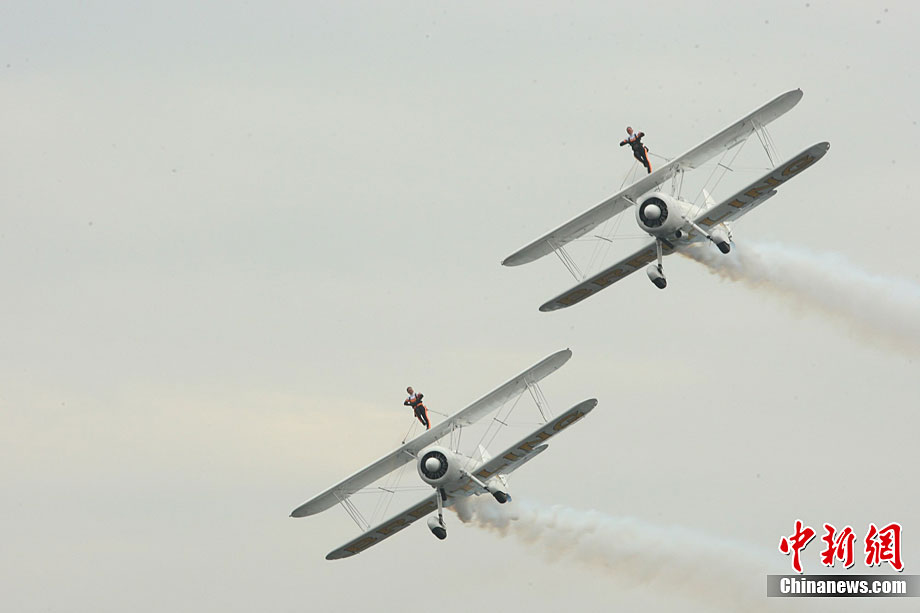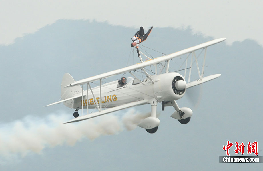 中新網大足10月4日電 (連肖 杜遠)4日下午,重慶大足首屆國際航空體育旅游節開幕,空軍“八一”跳傘隊和英國兩支特技飛行隊在大足龍水湖上空上演了多項空中特技。其中,兩名英國女郎站在時速高達240公里的飛機機翼上表演各種芭蕾動作,引得觀眾大呼驚險。連肖 攝