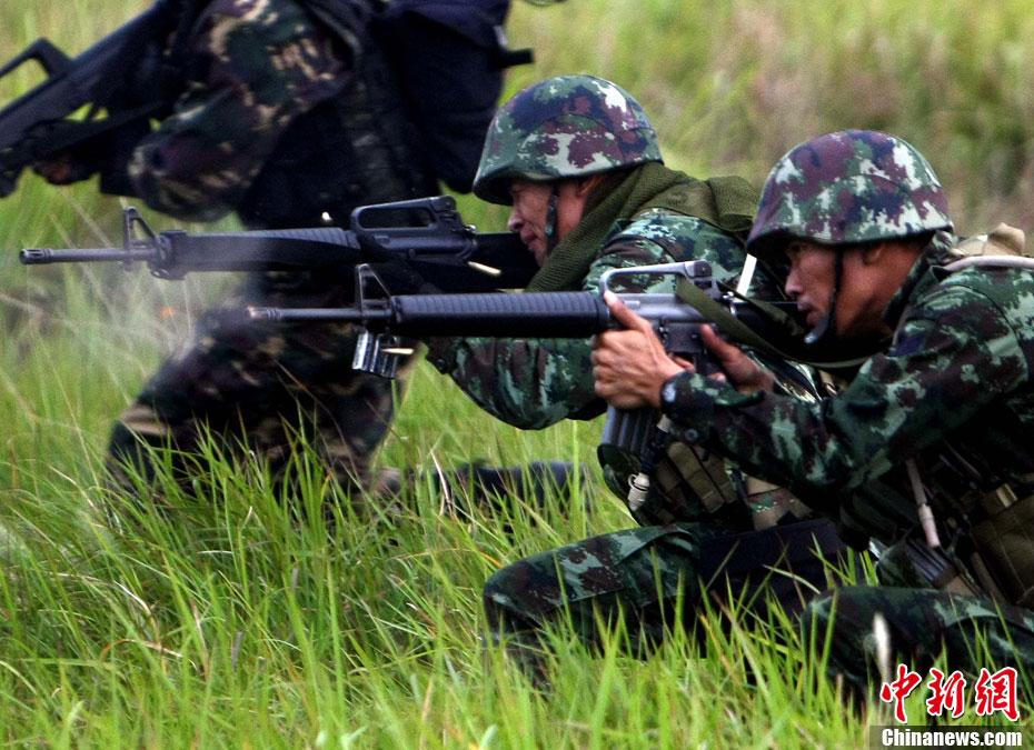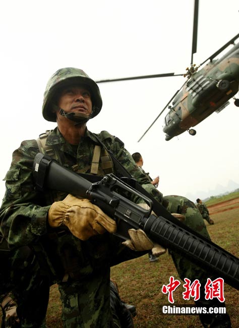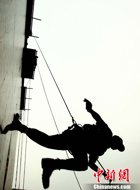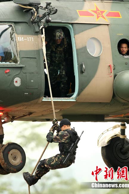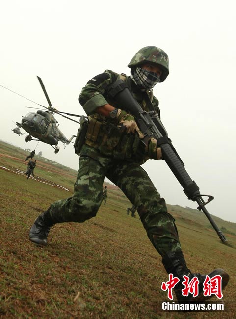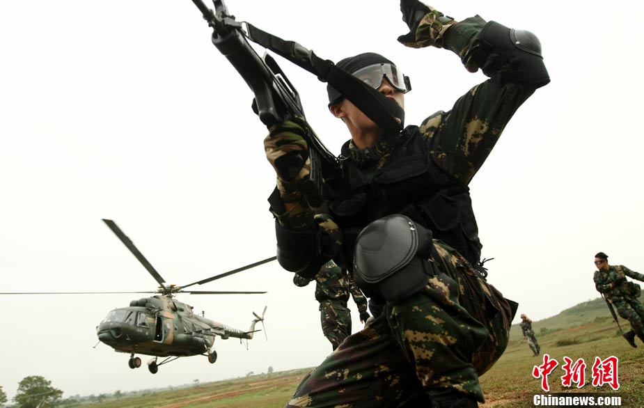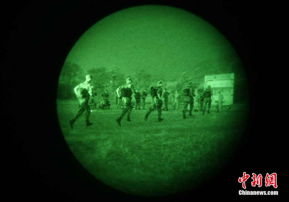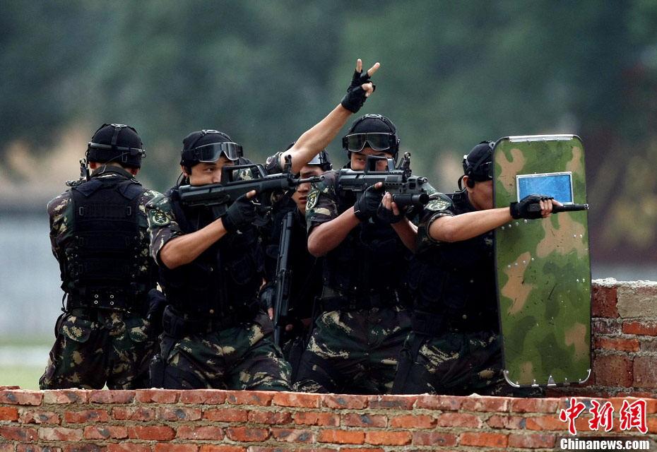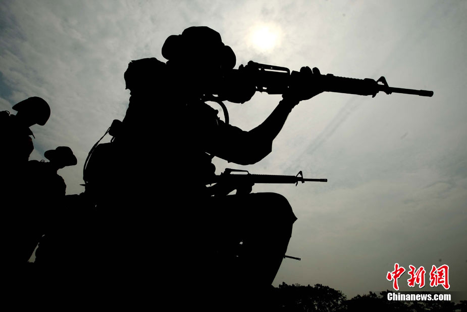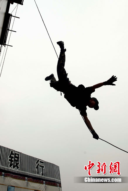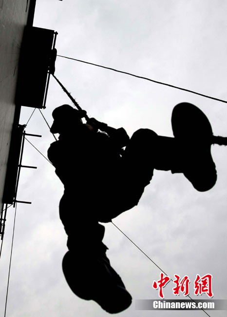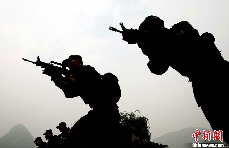 10月8日,中國、泰國兩軍特種部隊“突擊—2010”反恐聯合訓練在廣西桂林拉開帷幕,這是兩國之間舉行的第三次陸軍聯合訓練。分析人士指出,這次聯訓將進一步鞏固兩軍關系,提高聯合反恐作戰能力,利于維護地區和平穩定。此次聯訓為期15天,這是中泰兩國陸軍首次就城市反恐課題開展聯訓。圖為中國參訓部隊在開幕式上表演房屋突擊。中新社記者 杜洋 攝