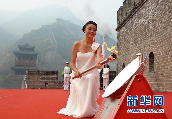 北京時間10月9日上午10時26分,2010年廣州亞運會圣火在有“天下第一雄關”的北京居庸關長城北關烽火臺成功點燃。中新社記者 王歡 攝