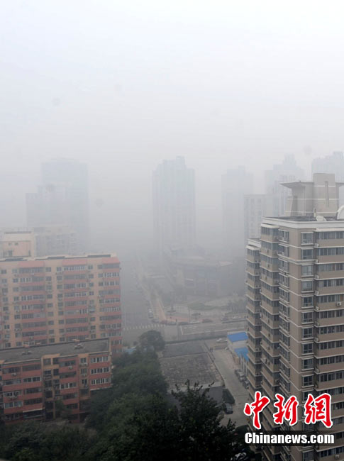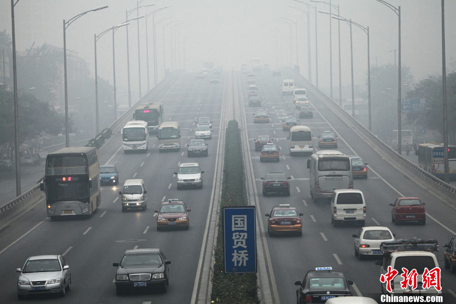 10月10日上午,北京東三環國貿橋被大霧籠罩。當日,持續的大霧再度襲擊北京城,中央氣象臺10月10日06時繼續發布大霧藍色預警。中新社發 馬毅行 攝 圖片來源:CNSPHOTO