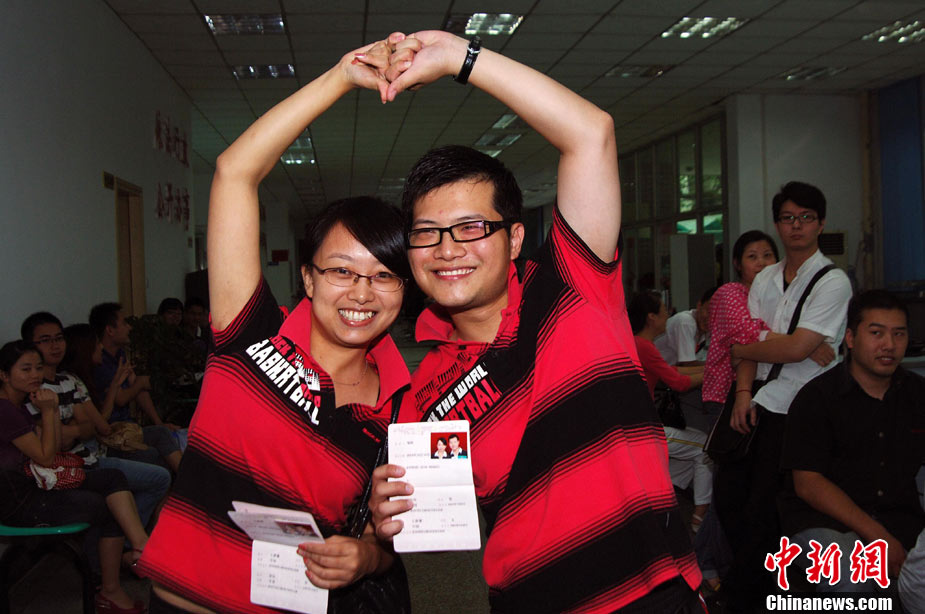 2010年10月10日,全國各地新人辦理結(jié)婚登記。很多新人選擇被寓意“十全十美”的好日子領(lǐng)結(jié)婚證。圖為鄭州出現(xiàn)結(jié)婚登記高峰,導致各區(qū)民政局婚姻登記處門前都排起長長的隊伍。一對新人在長長的隊伍中手挽手排除等候。沙浪 攝 圖片來源:CFP視覺中國