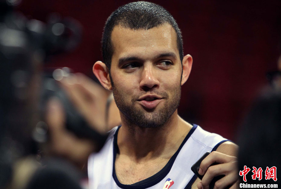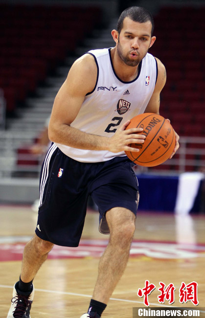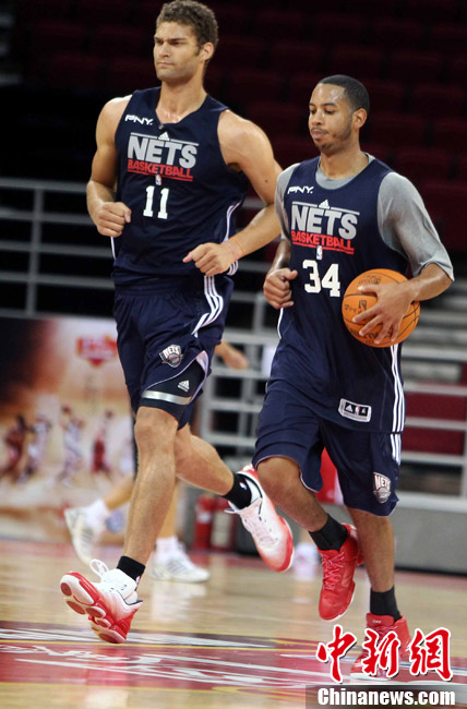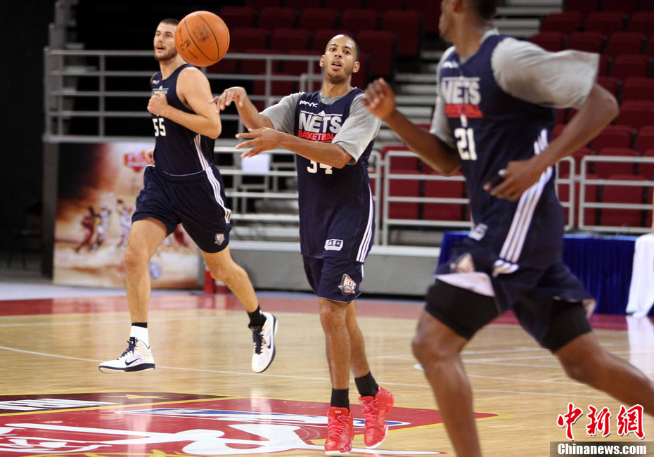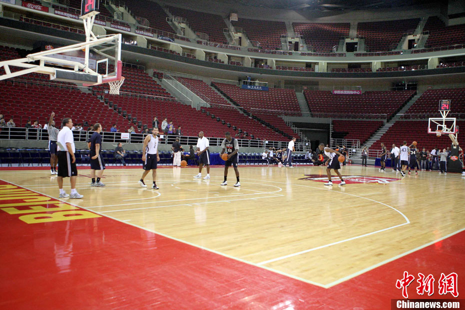 10月12日中午,新澤西網隊在北京五棵松體育館訓練并接受了媒體采訪;火箭隊則由于凌晨剛剛抵達北京而取消了訓練。據悉,兩場比賽的門票已經售罄。中新社記者 任晨鳴 攝