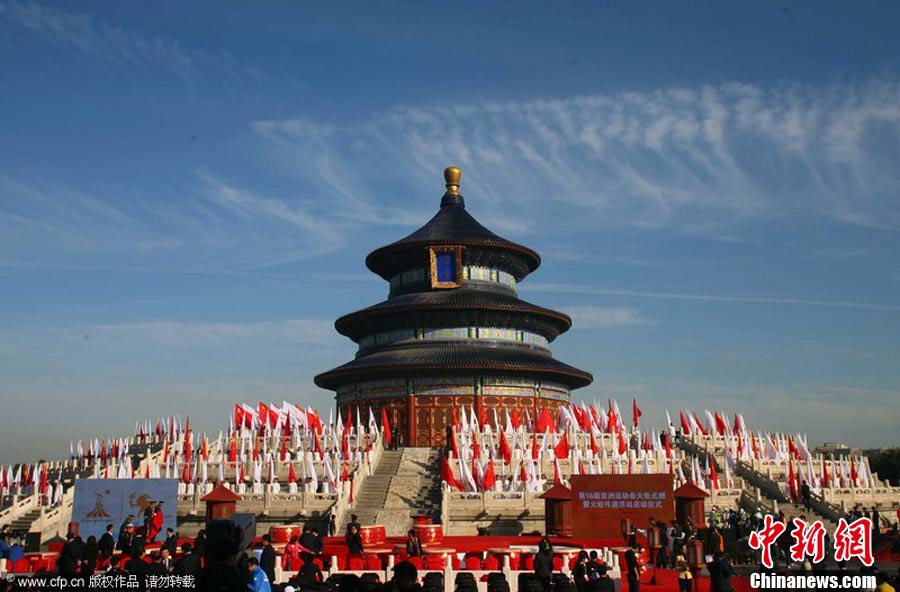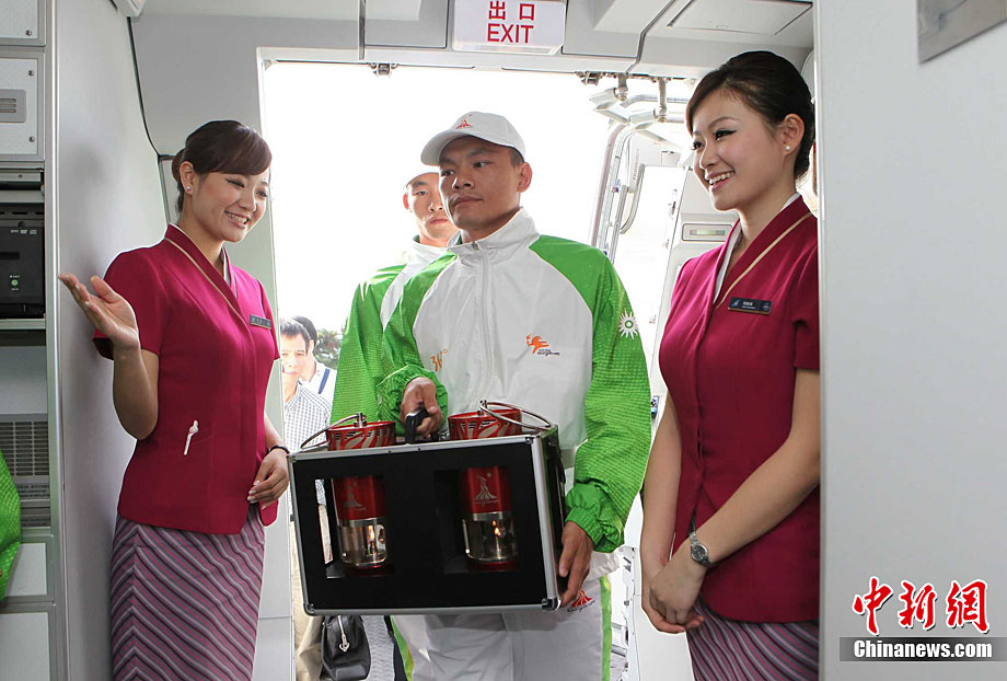 10月12日下午,第16屆亞運會圣火火種搭乘中國南方航空“亞運號”專機,從北京飛往亞運會舉辦城市廣州。中共中央政治局委員、廣東省省委書記汪洋、亞理奧事會及廣州亞組委官員、采火圣女、圣火護衛等180多人同機抵達廣州。中新社發 羅廣泰 攝