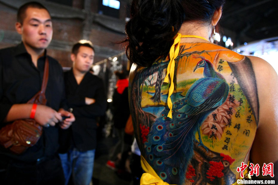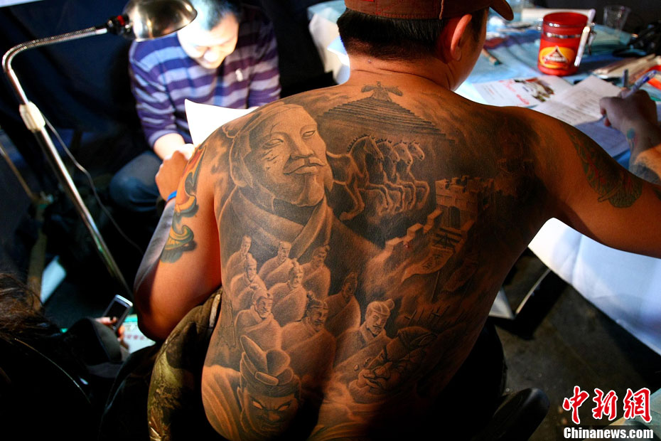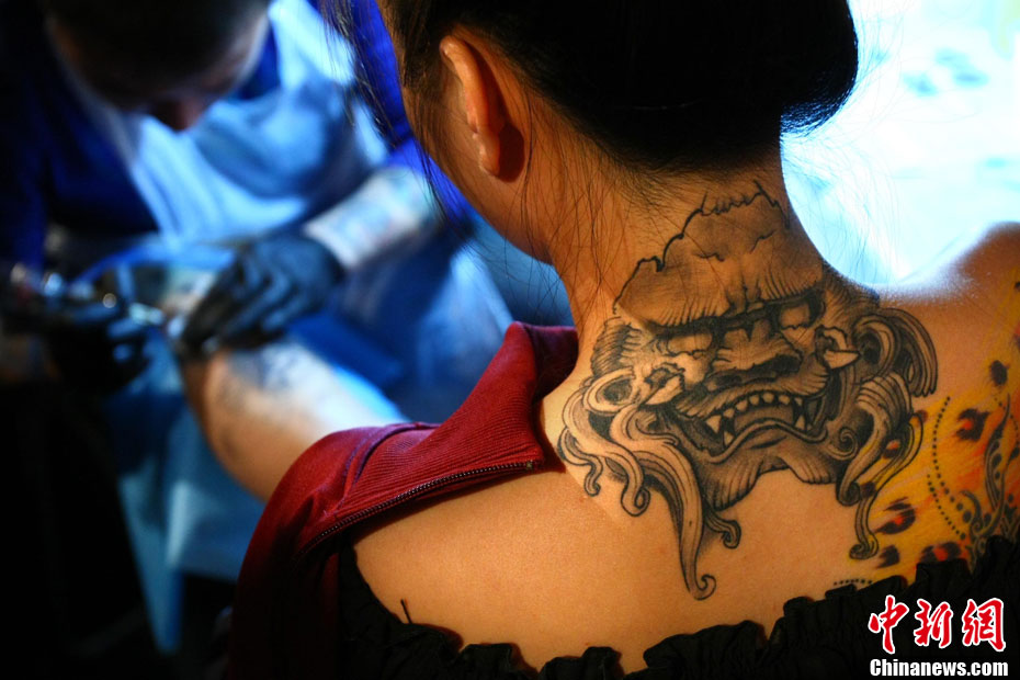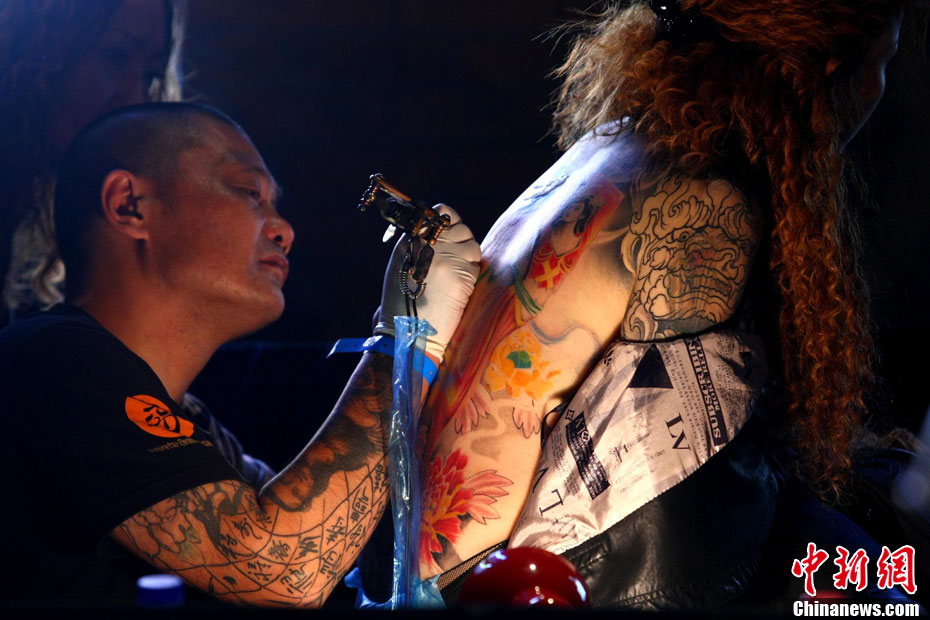10月15日,中國(國際)紋身藝術(shù)節(jié)在北京798藝術(shù)區(qū)開幕,這是國內(nèi)舉辦的首次國際性紋身藝術(shù)節(jié)。本屆紋身展會的宗旨是:“讓藝術(shù)向紋身靠攏”,為國內(nèi)外紋身師提供一個(gè)公平、公正的同臺獻(xiàn)藝和交流的平臺。來自美國、澳大利亞、新西蘭等國以及中國許多省市的紋身師現(xiàn)場展示富有個(gè)性、創(chuàng)意十足的紋身作品。藝術(shù)節(jié)將持續(xù)至17日。 中新社發(fā) 富田 攝