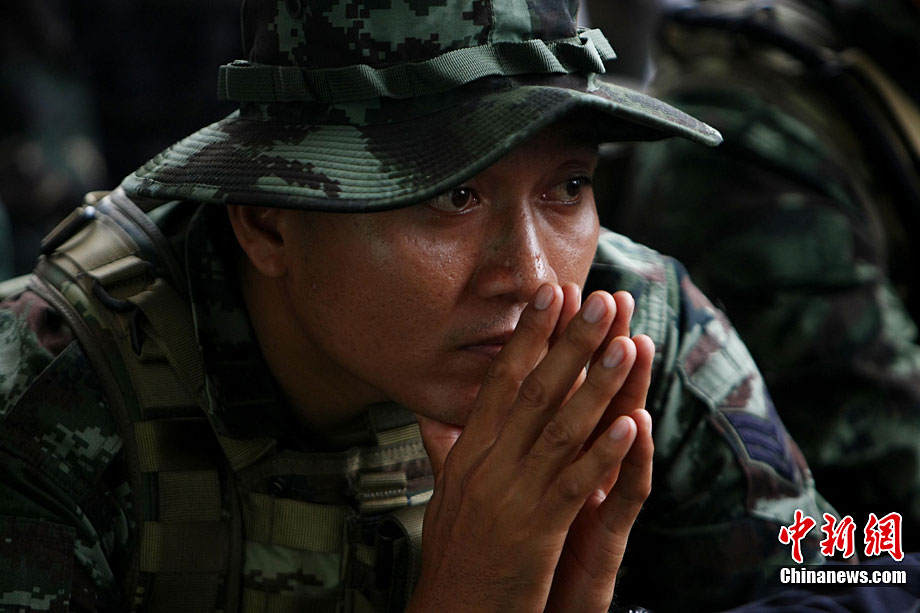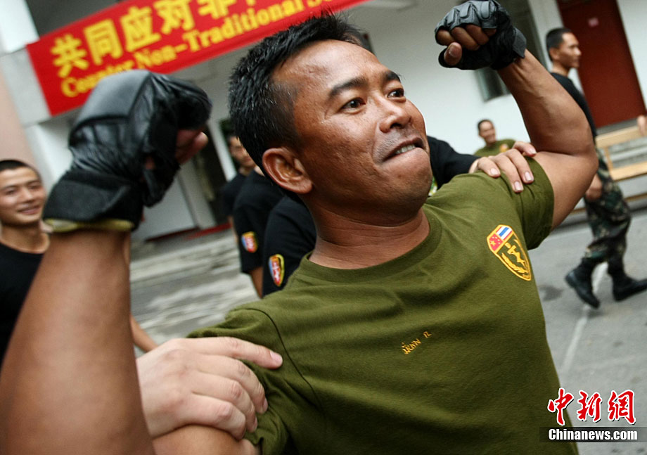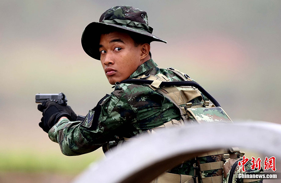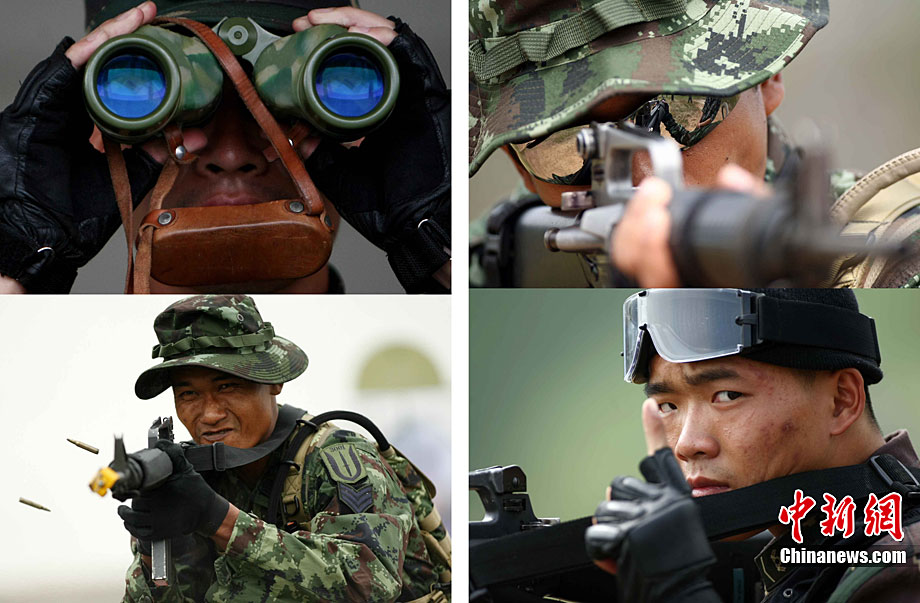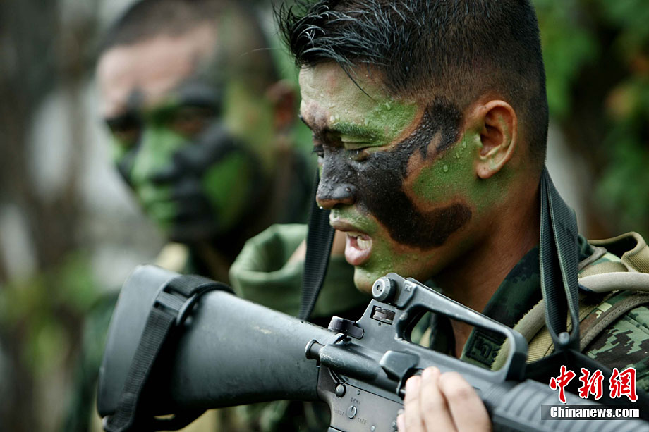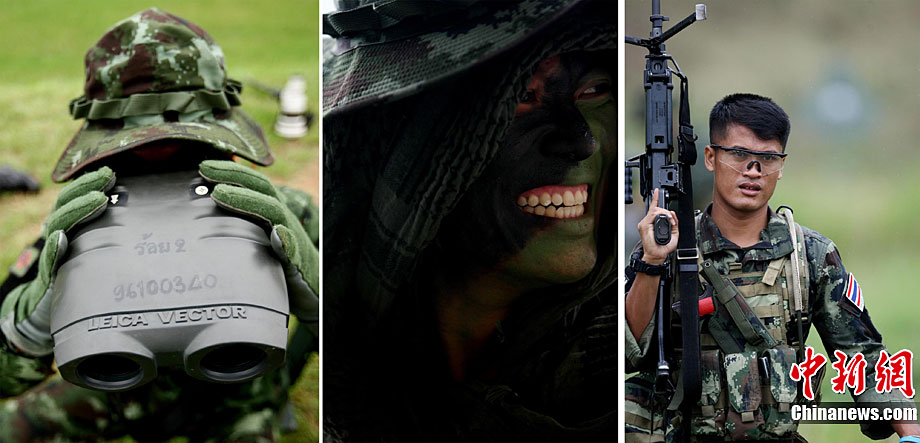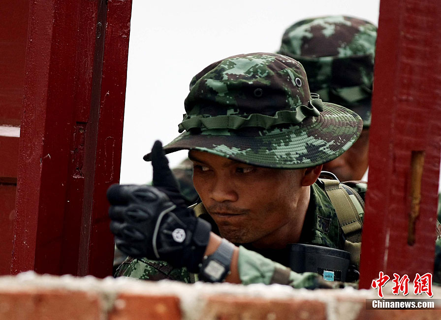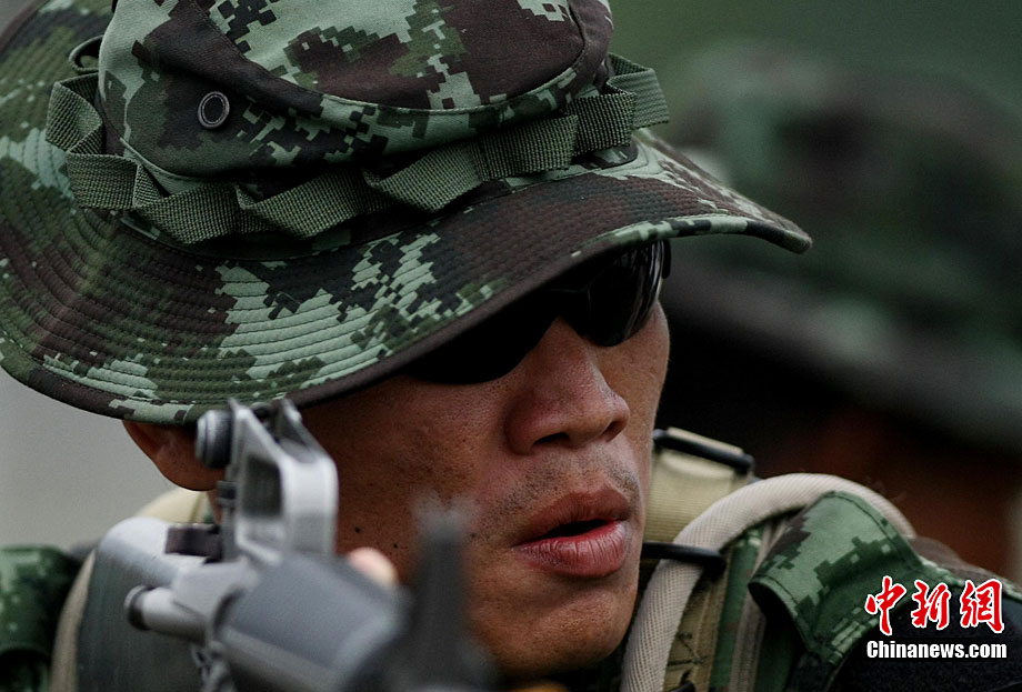 10月6日至20日,代號“突擊—2010”的中泰陸軍特種部隊聯合反恐訓練在廣西桂林舉行。參加演練的,分別是被譽為“南國利劍”的廣州軍區某特種大隊和被譽為“叢林猛虎”的泰國陸軍特戰三團派出的120名官兵。在兩周時間內,訓練內容涵蓋射擊、攀登、反制戰術等8大項、20多個小項的課目。中新社記者 杜洋 攝