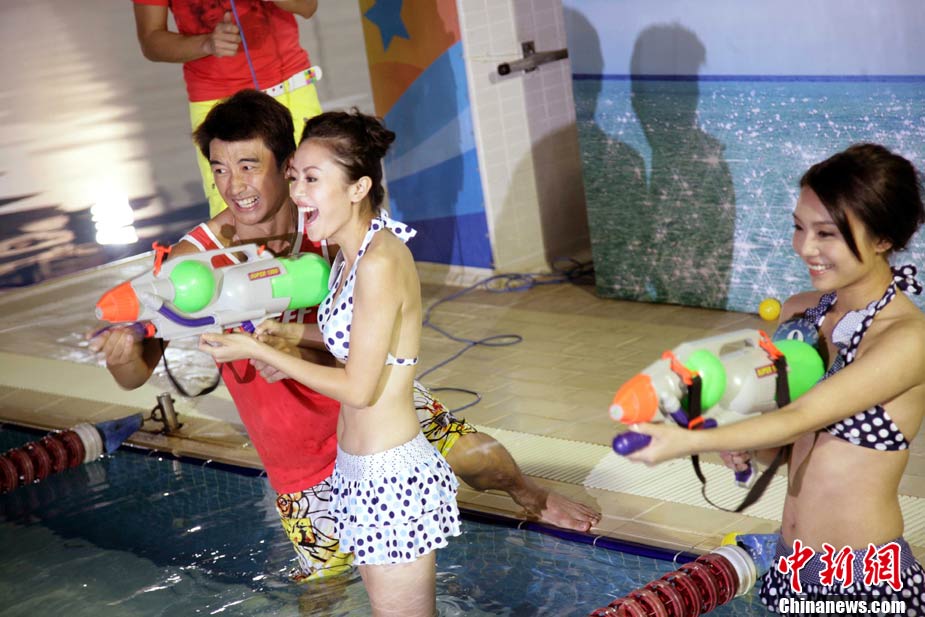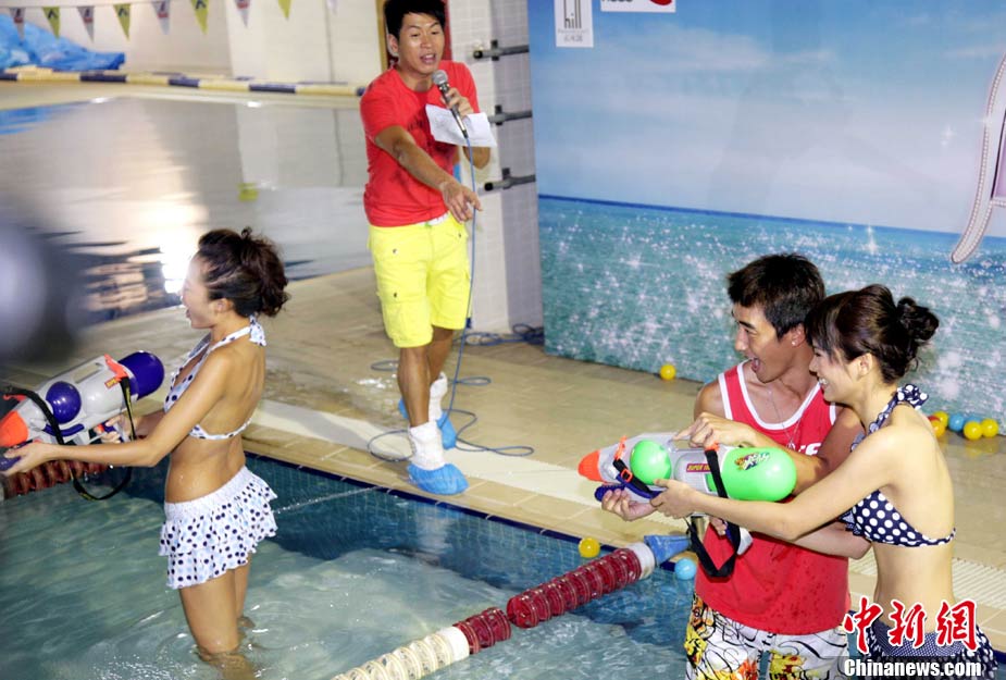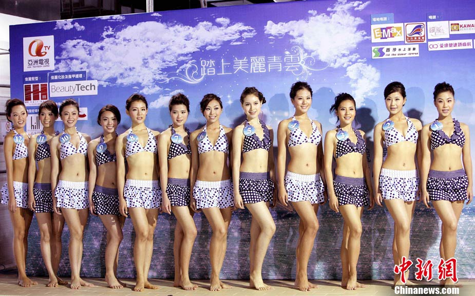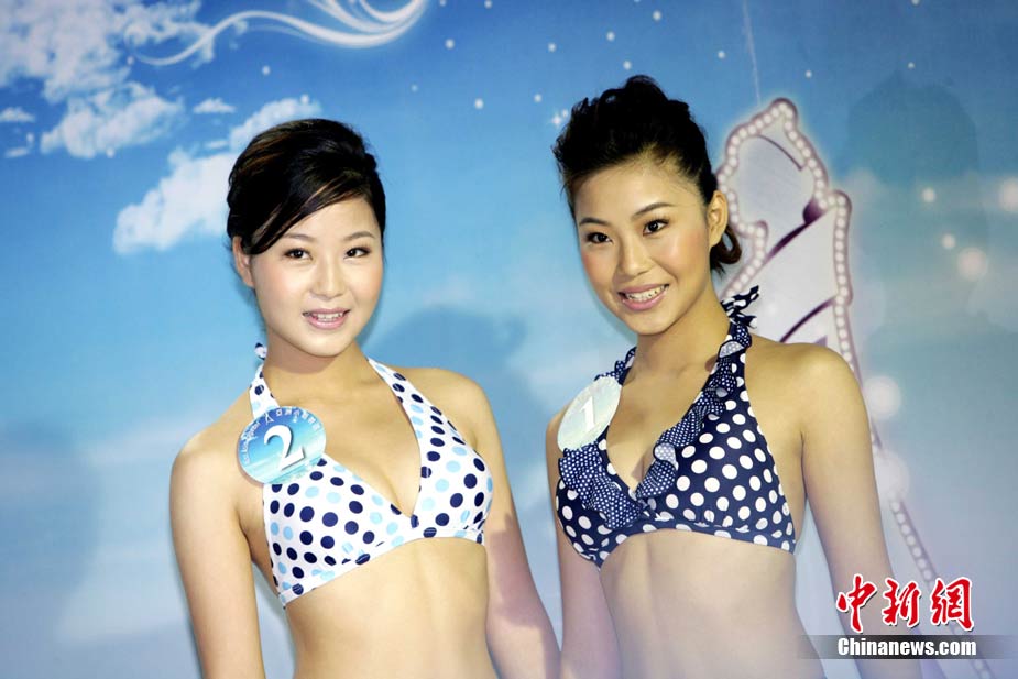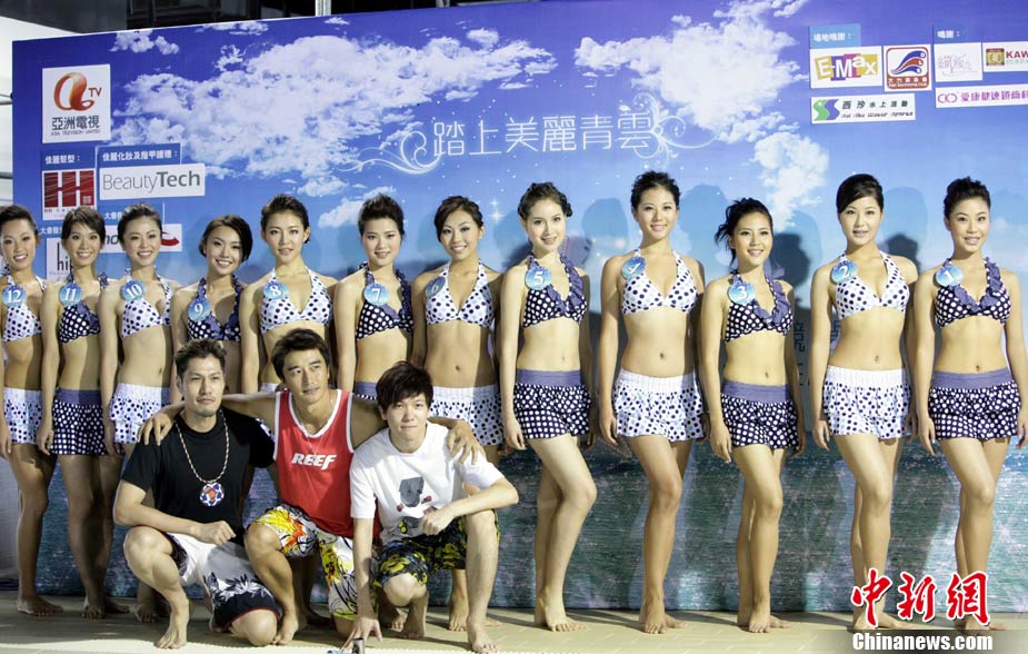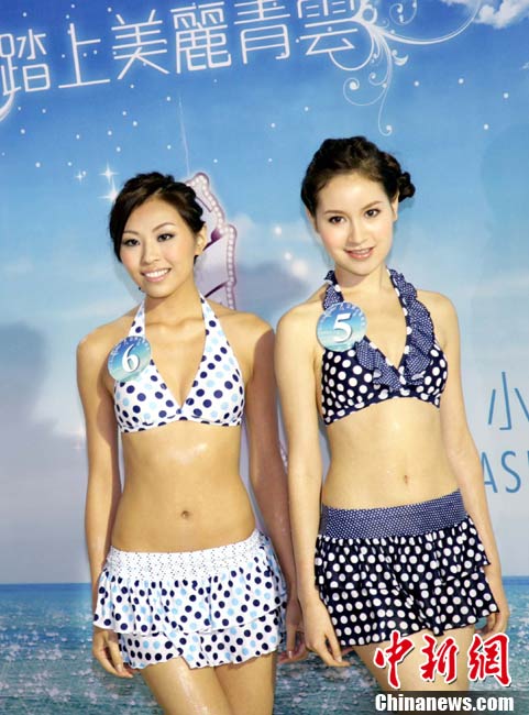 10月19日,參加《2010亞洲小姐競選》(港澳賽區)的9號佳麗陳明月(右)和10號佳麗何婭換上泳裝,進行水上競技,以各種游戲方式放松心情去迎接總決賽。中新社發 洪少葵 攝