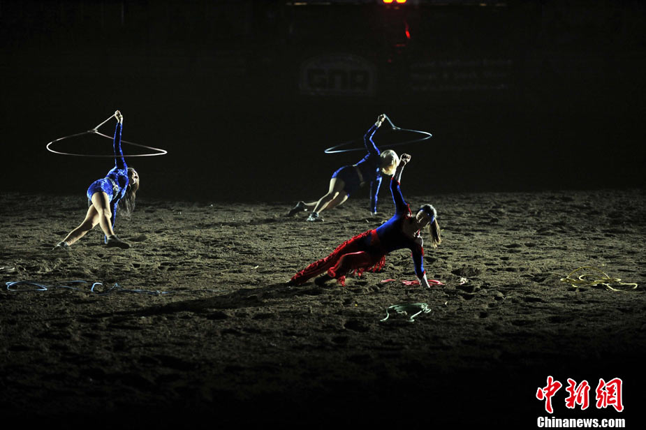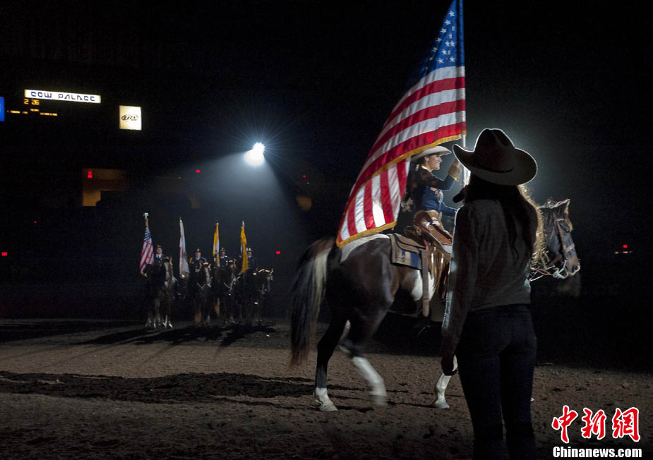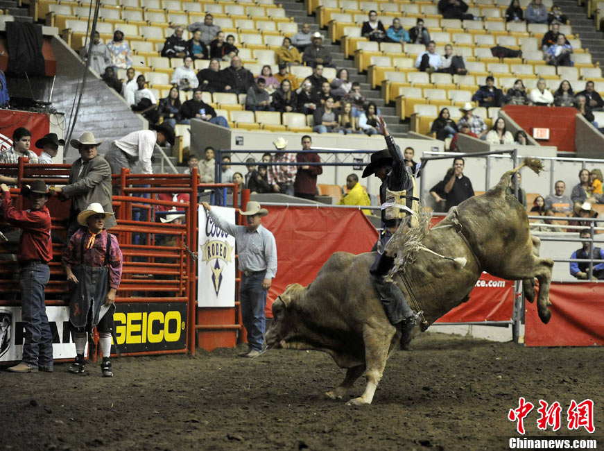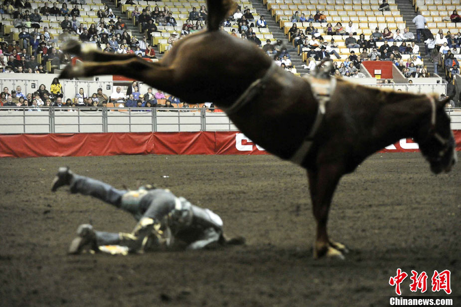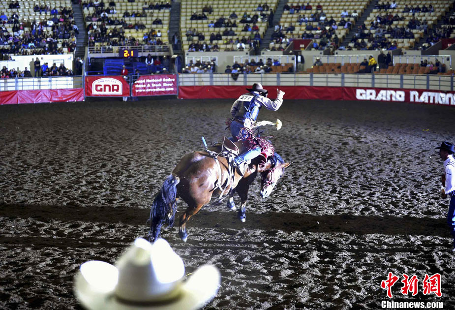 為期四日的全美騎術(shù)大會在舊金山的牛宮(Cow Palace)舉行。來自全美多個州的專業(yè)和草根牛仔參加表演,舉辦者預(yù)測將會吸引兩萬名左右的觀眾前來參觀。舊金山的全美騎術(shù)大會始于1941年,是全美專業(yè)騎術(shù)大會的前奏。圖為一名牛仔在努力馴服烈馬。中新社發(fā) 陳鋼 攝