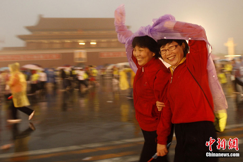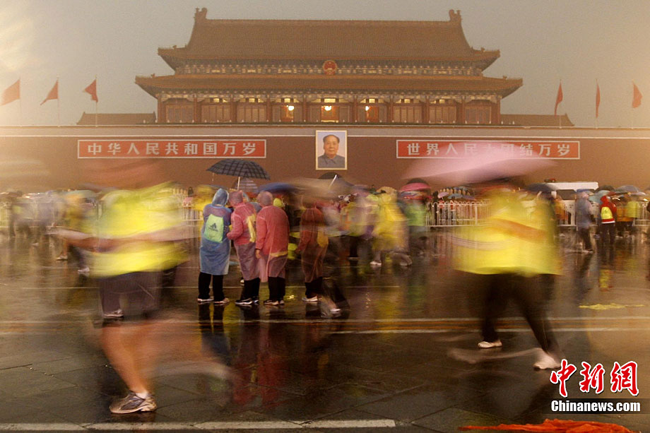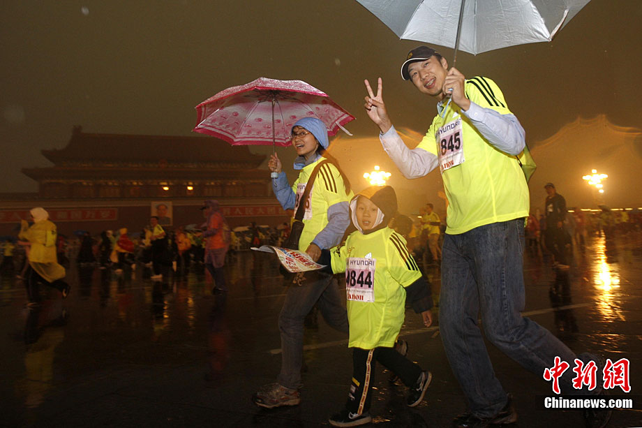 10月24日8時,2010年北京馬拉松正式鳴槍,所有參賽運動員在淅淅瀝瀝的小雨中從天安門廣場出發。今年的北京馬拉松正式與國際接軌,與往年不同的特點是北京馬拉松賽、全國馬拉松錦標賽以及首都高校馬拉松賽“三賽合一”,并采取一次發槍制,所有組別的選手都同時出發。中新社記者 富田 攝