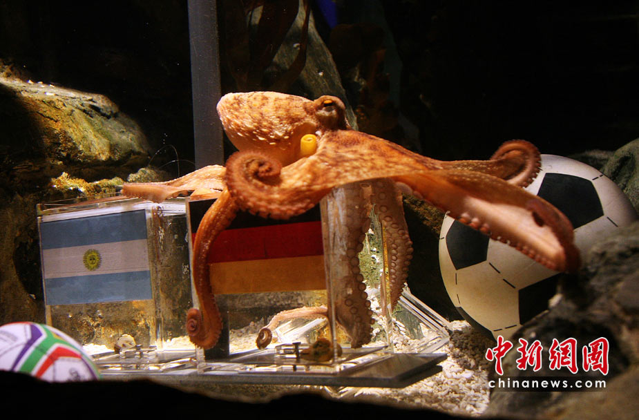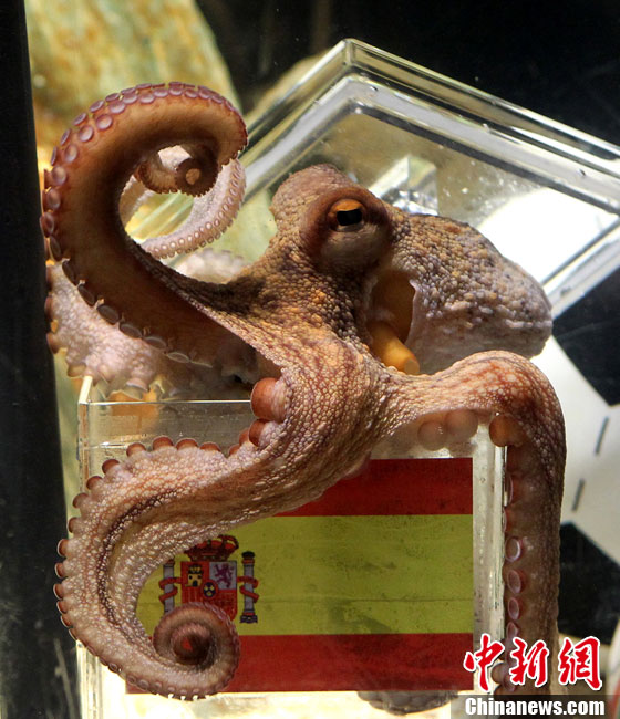 據悉,保羅的尸體目前已被冷藏,水族館正在商討“怎樣以最好的形式紀念”。圖為在世界杯后章魚保羅獲贈一件印有它名字的西班牙隊隊服。