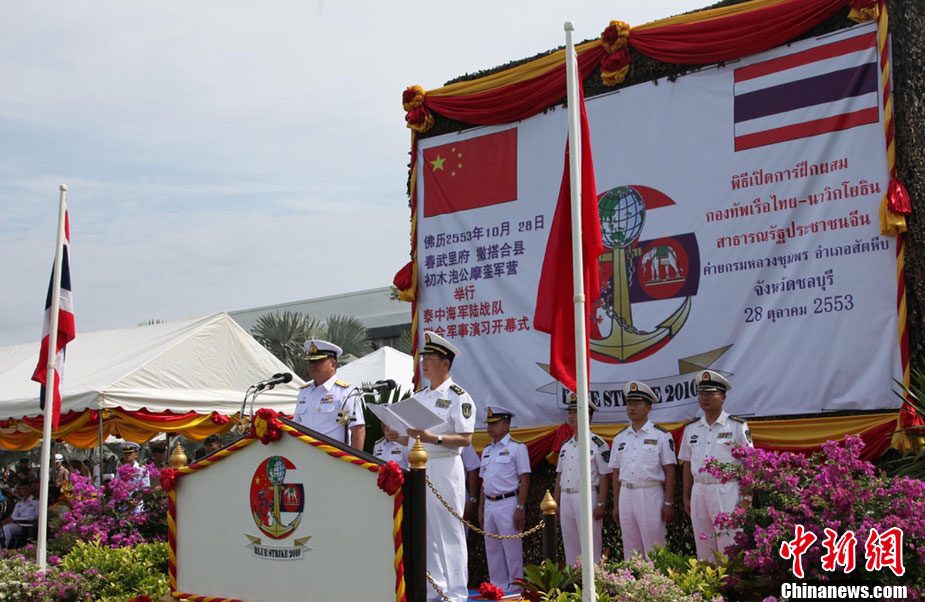 10月28日,代號(hào)為“藍(lán)色突擊—2010”的中、泰海軍陸戰(zhàn)隊(duì)聯(lián)合訓(xùn)練在泰國(guó)梭桃邑海軍基地拉開(kāi)帷幕。圖為中國(guó)海軍陸戰(zhàn)隊(duì)參訓(xùn)官兵在開(kāi)訓(xùn)儀式進(jìn)行技能演示。中新社記者 余顯倫 攝