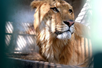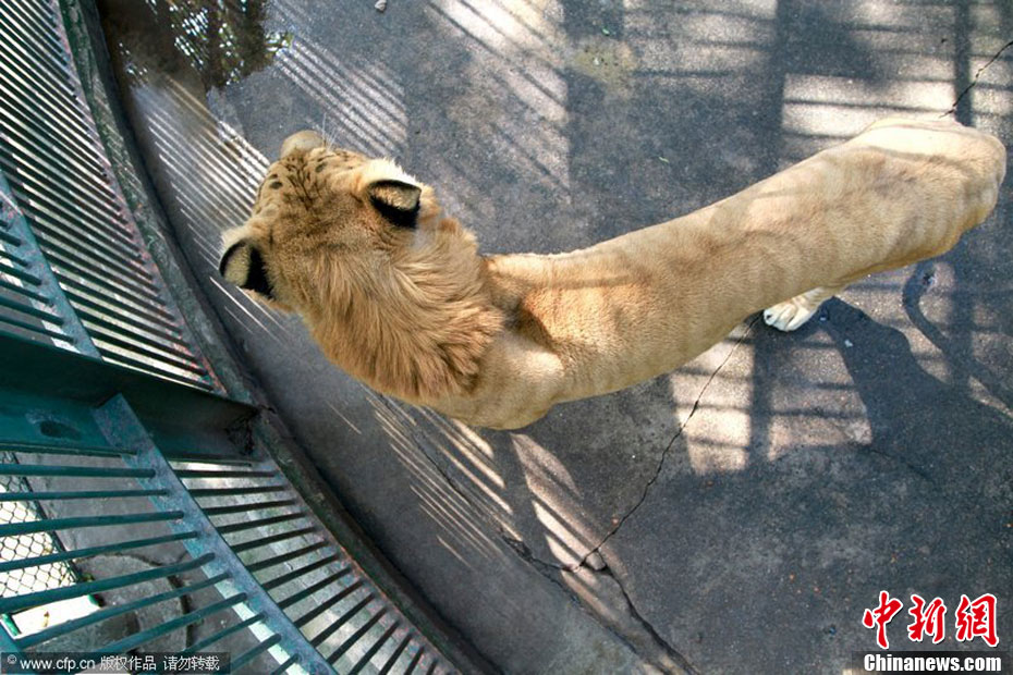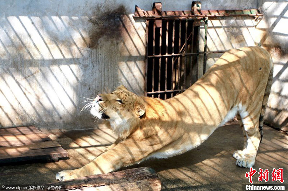 2010年10月27日,江西九江甘棠公園動物園工作人員正隔著鐵欄桿在給一只虎頭獅身的“怪物”撓癢。這只“怪物”名叫獅虎獸,是是雄性獅子和雌性老虎交配產生的后代。此只獅虎獸引進自安徽安慶,目前已三歲,這是獅虎獸首次亮相江西,有關資料顯示,獅虎獸的成活率只有50萬分之一,目前世界上存活的獅虎獸只有20只左右,所以被形容為比熊貓還珍貴的動物。 圖片來源:CFP視覺中國