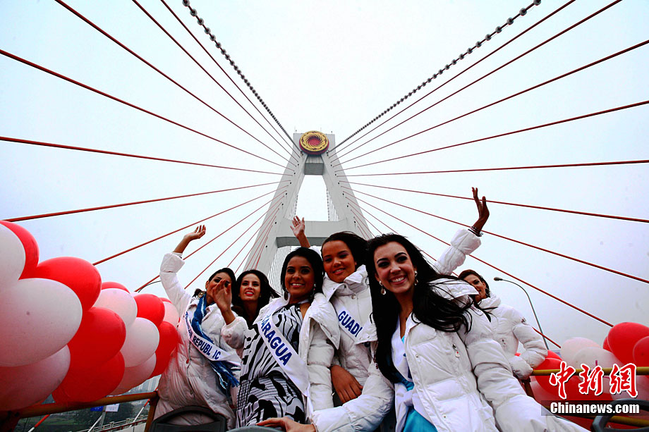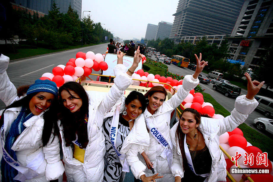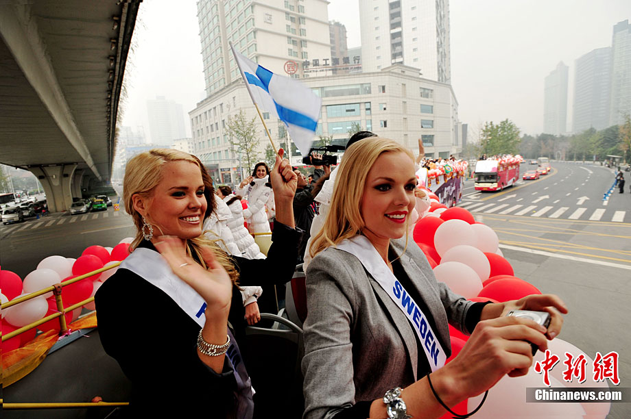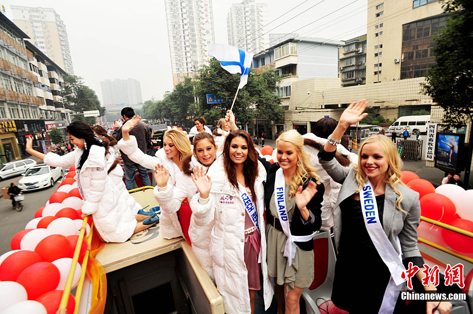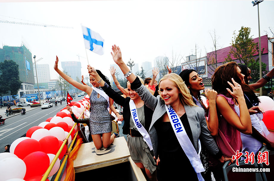 10月31日,國際小姐世界大會全球總決賽的70位參賽佳麗花車巡游成都市區。中新社發 安源 攝