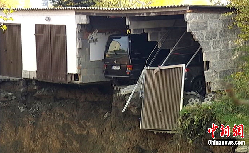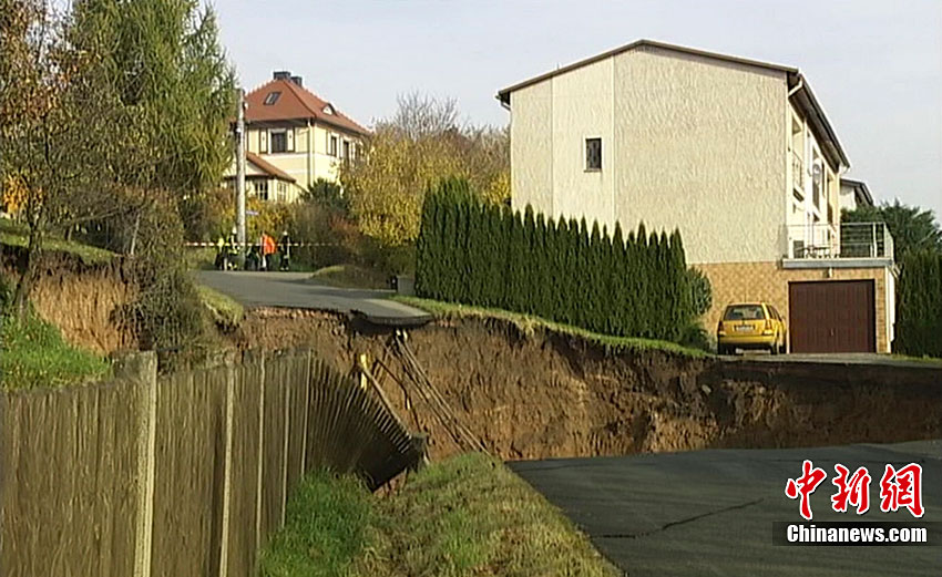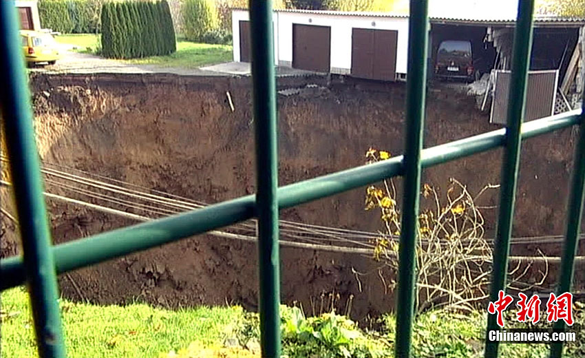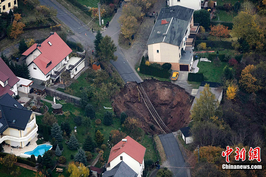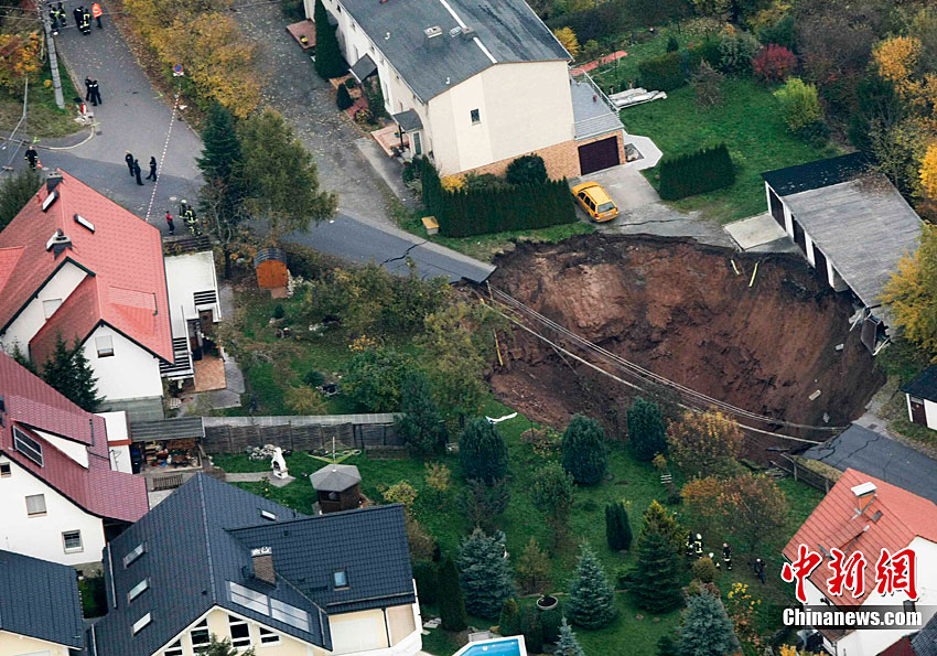 11月1日,在德國東部城鎮施馬爾卡爾登,車輛停在地面塌陷出現的坑洞旁。施馬爾卡爾登地區當日出現地面塌陷情況,部分居民撤離了發生事故的地區,目前無人因地面塌陷事故受傷。