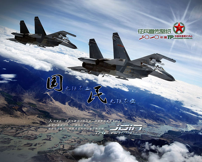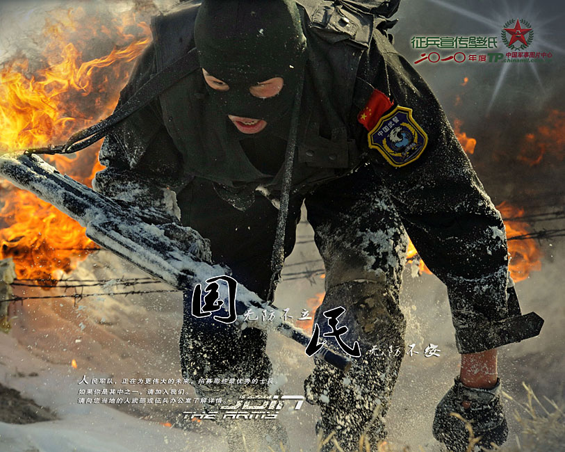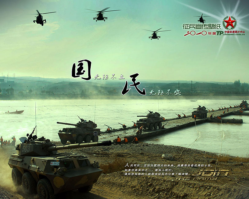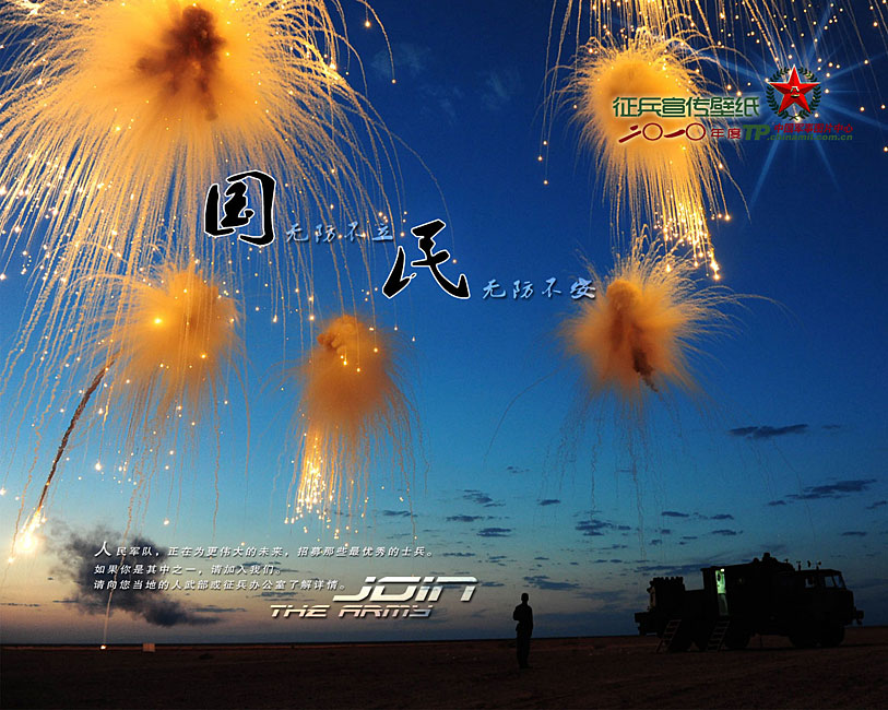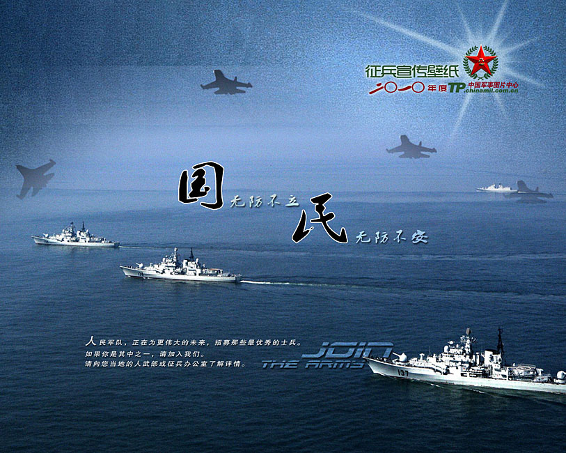 人民軍隊正在為更偉大的未來招募最優(yōu)秀的士兵,如果你是其中之一,請加入我們。”——在今冬征兵工作全面鋪開之際,由中國軍事圖片中心制作的2010年度征兵宣傳壁紙上線發(fā)布。本次推出的征兵壁紙包括陸軍、海軍、空軍、二炮、武警五個主題,每個主題都發(fā)布了兩款壁紙,分別為適應(yīng)普通屏幕的1280×1024分辨率壁紙和適應(yīng)寬屏使用的1440×900分辨率。去年征兵宣傳壁紙首次推出在互聯(lián)網(wǎng)引發(fā)關(guān)注熱潮,十天之內(nèi)下載量超過百萬,引起了包括外媒在內(nèi)的廣泛討論。今年的征兵壁紙主題定為“國無防不立,民無防不安”,精選了來自東海演習(xí)、跨區(qū)軍演等重大題材的圖片。圖為中國陸軍的宣傳壁紙。圖片來源:中國軍網(wǎng)