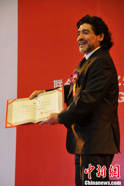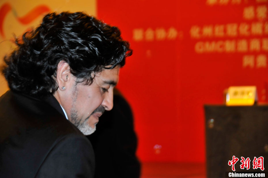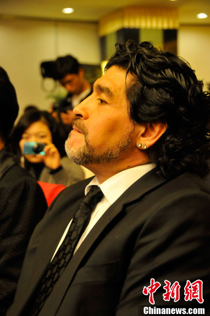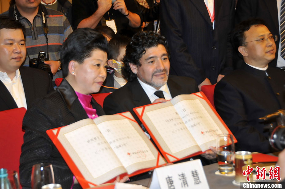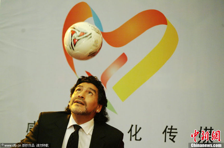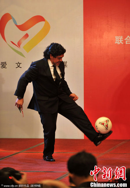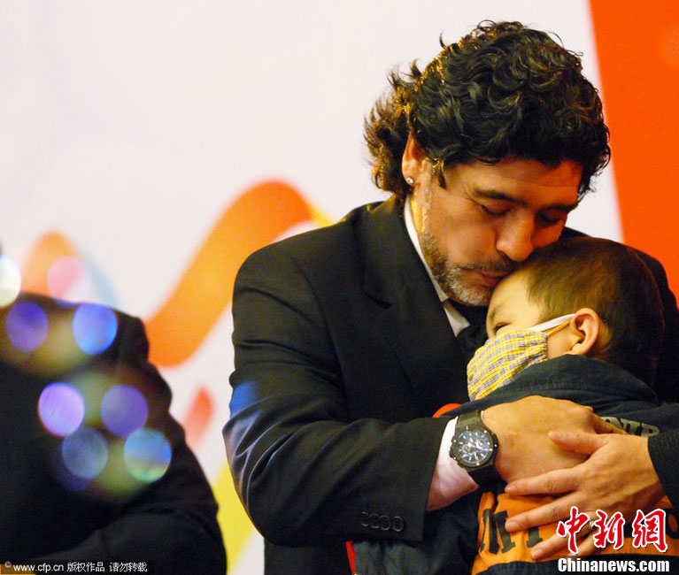 11月4日,馬拉多納溫暖中國行活動進行,老馬本人出席了簽約慈善大使的新聞發布會。 圖為馬拉多納擁吻小患者。圖片來源:CFP視覺中國 麥田 攝