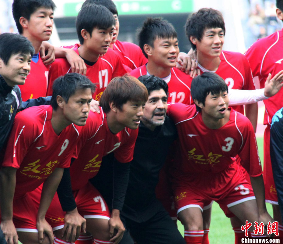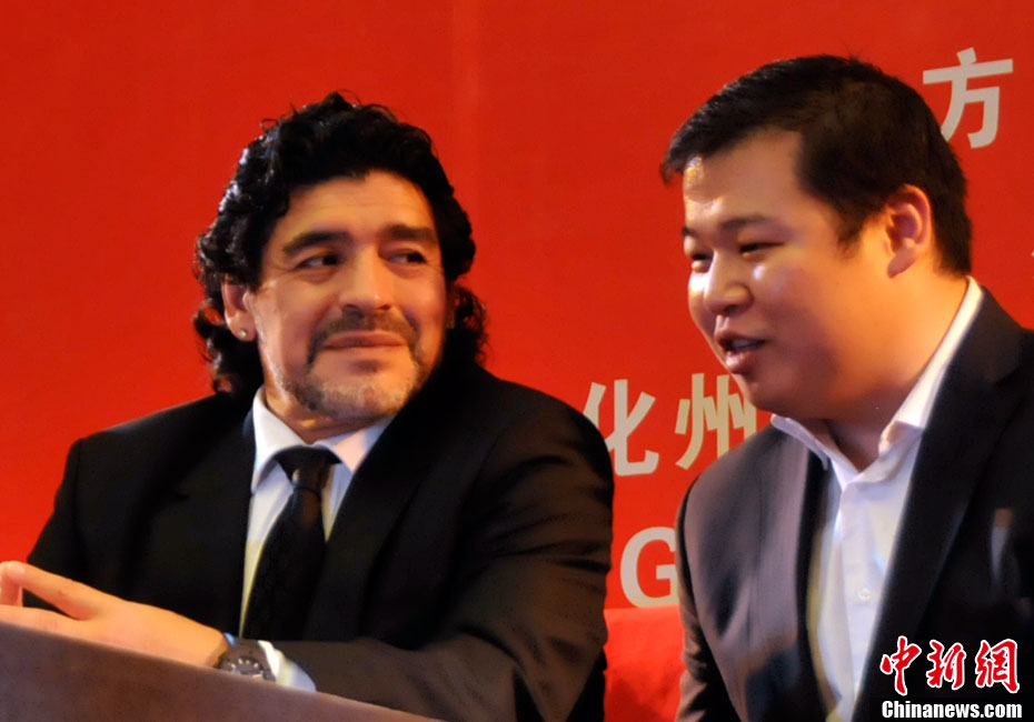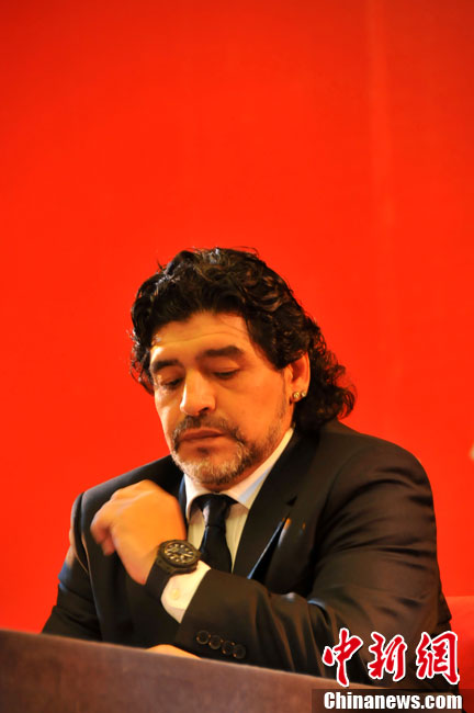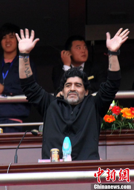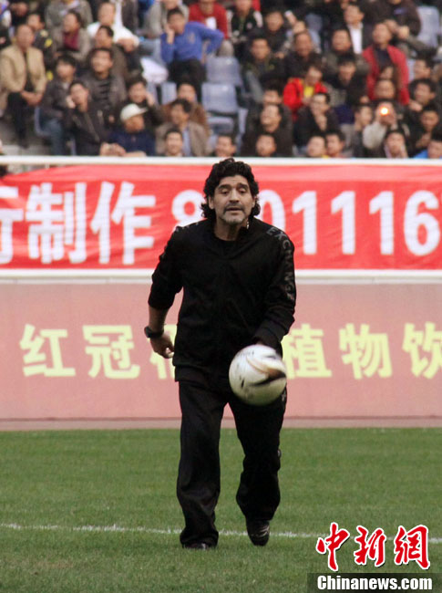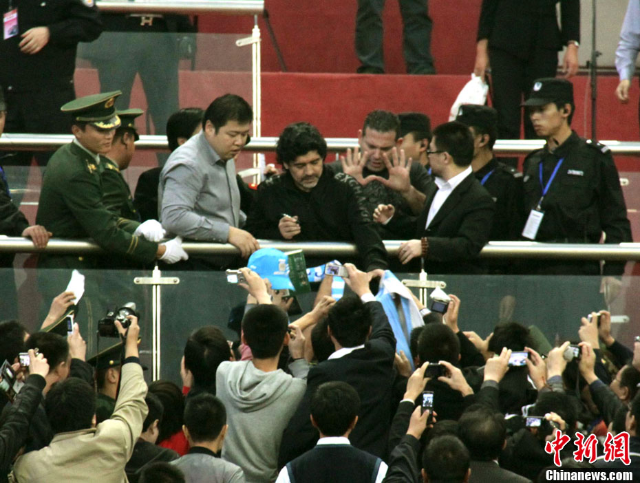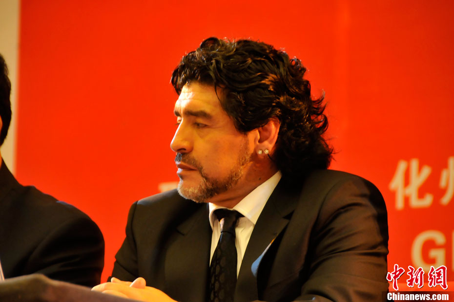 11月4日,馬拉多納溫暖中國行活動進行,老馬本人出席了簽約慈善大使的新聞發布會。 圖為馬拉多納擁吻小患者。圖片來源:CFP視覺中國 麥田 攝