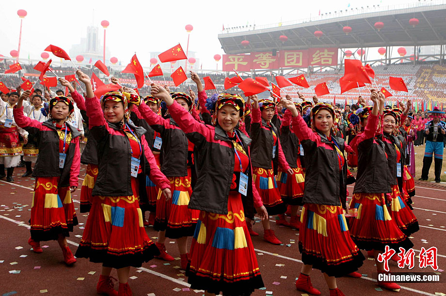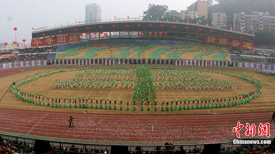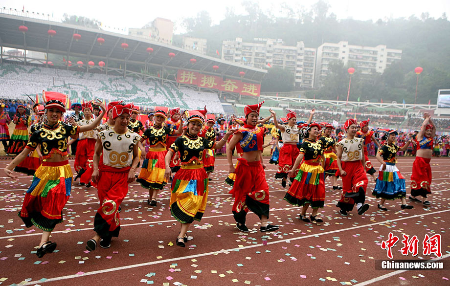 11月10日,四川省第13屆少數民族體育運動會在攀枝花拉開帷幕。來自涼山州、甘孜州、阿壩州、樂山市、雅安市等10個市州以及西南民族大學、成都體育學院共12支代表隊1066名運動員,將參加陀螺、民族式摔跤、田徑等9個競賽項目7天的比賽。本次運動會是四川歷屆少數民族運動會規模最大的一次,所有項目均可免費觀看。中新社發 劉忠俊 攝