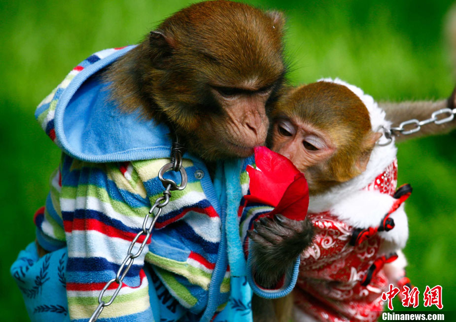 隨著11月11日“光棍節”的臨近,云南野生動物園忙著在園內舉行一次“動物相親大會”,為單身動物們解決終身大事。圖為11月10日,兩只猴子玫瑰花瓣后說“悄悄話”。 中新社記者 劉冉陽 攝