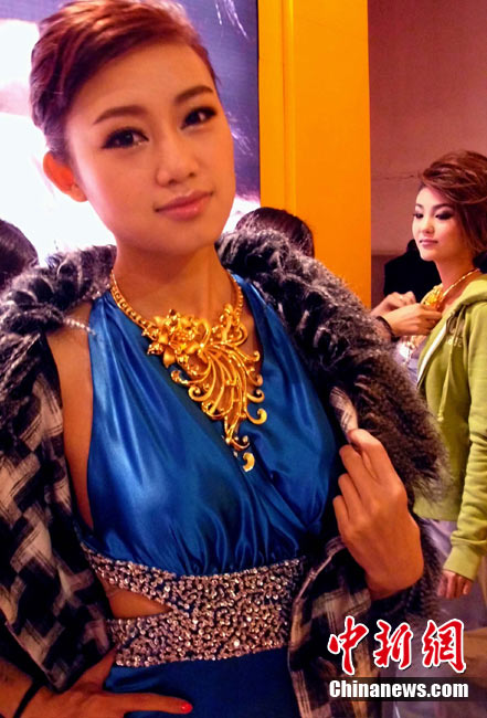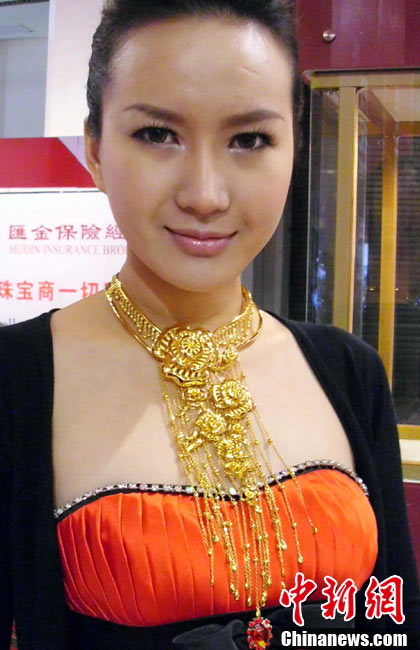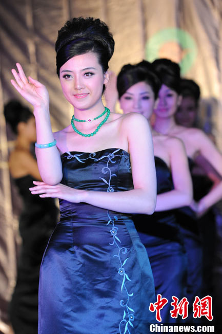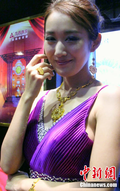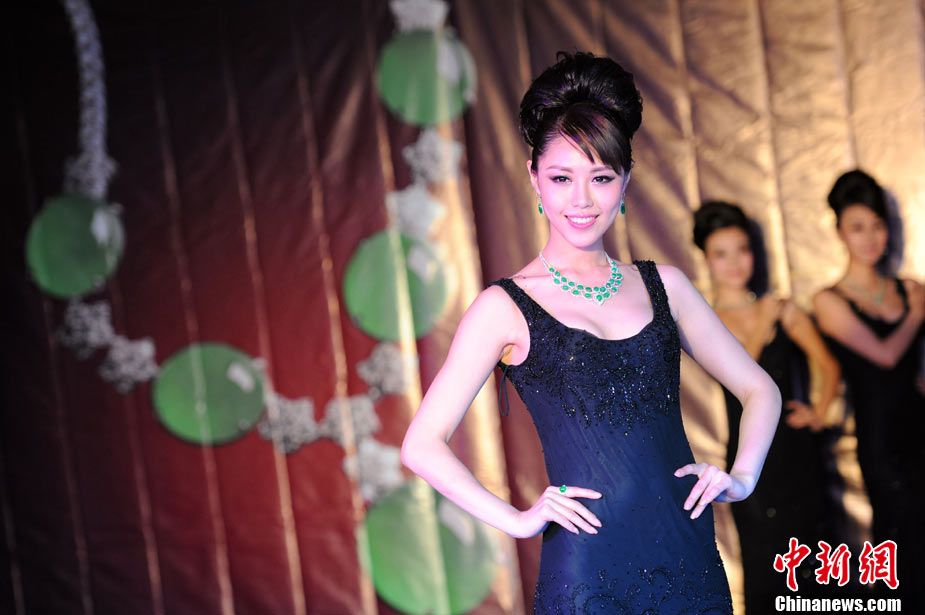 11月11日,2010中國國際珠寶展在北京中國國際展覽中心開幕,本屆展會規(guī)模42000平方米,近2000個(gè)展位,有來自22個(gè)國家和地區(qū)的961家企業(yè)參展,展覽面積比去年同期擴(kuò)大了40%。圖為2010中國國際珠寶展上模特展示珠寶首飾。中新社記者 錢興強(qiáng) 攝