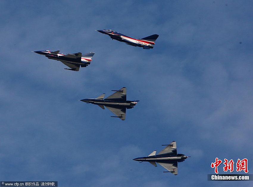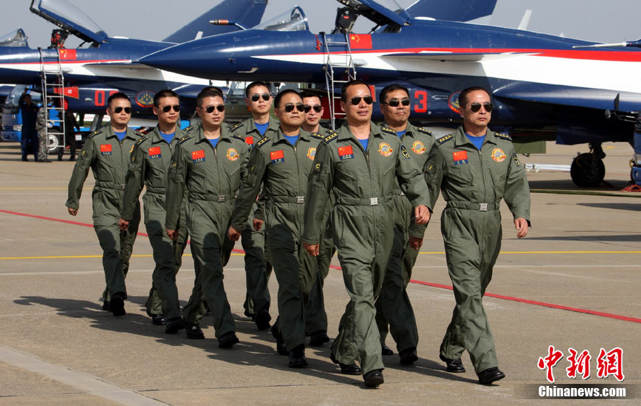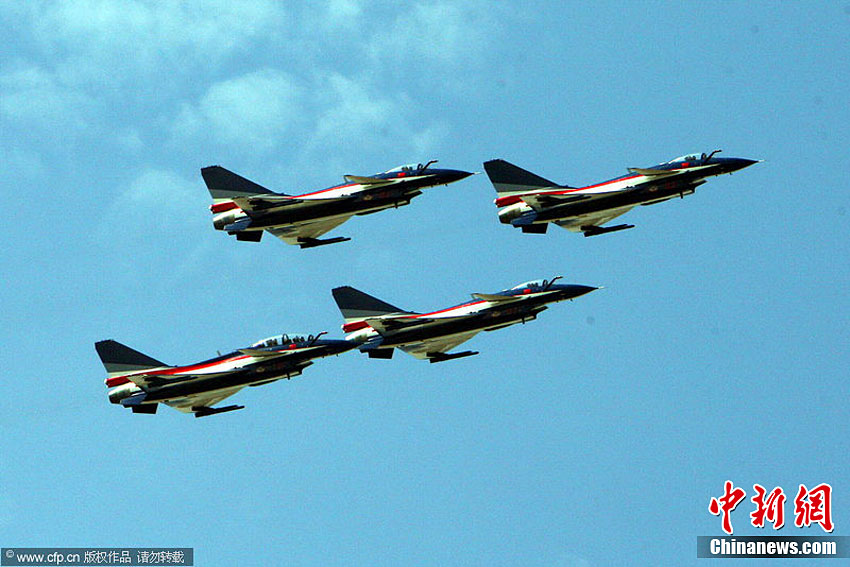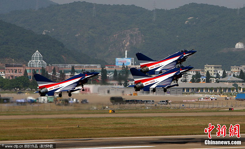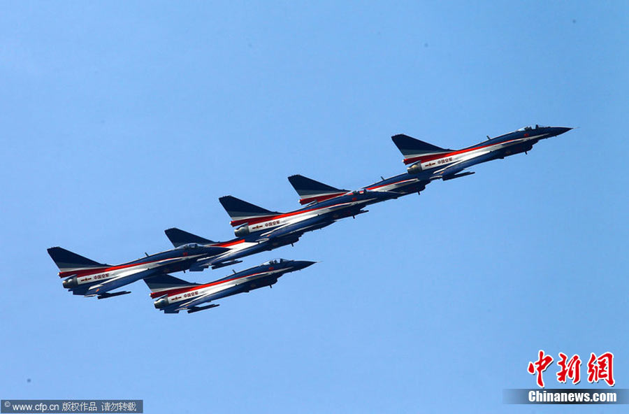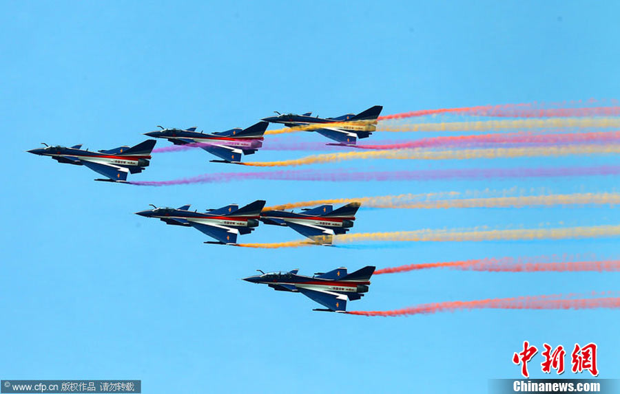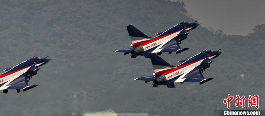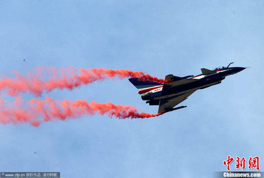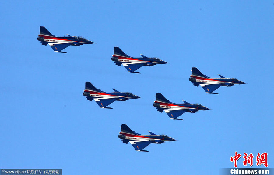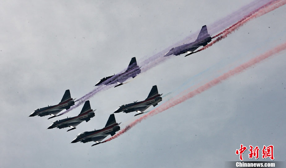 11月11日,珠海,中國空軍八一飛行表演隊首次進行六機編隊演練,同時還進行了拉煙、直立爬行、兩機穿越空中翻滾等高難度動作的演練。第八屆珠海國際航展將于11月16日開幕。于燕敏 攝 圖片來源:CFP視覺中國