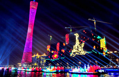 11月12日18時(shí)30分,廣州第十六屆亞運(yùn)會(huì)開幕式啟動(dòng)珠江巡游《一江歡歌》,45個(gè)代表團(tuán)的燈光彩船暢游珠江。中新社記者 陳文 攝