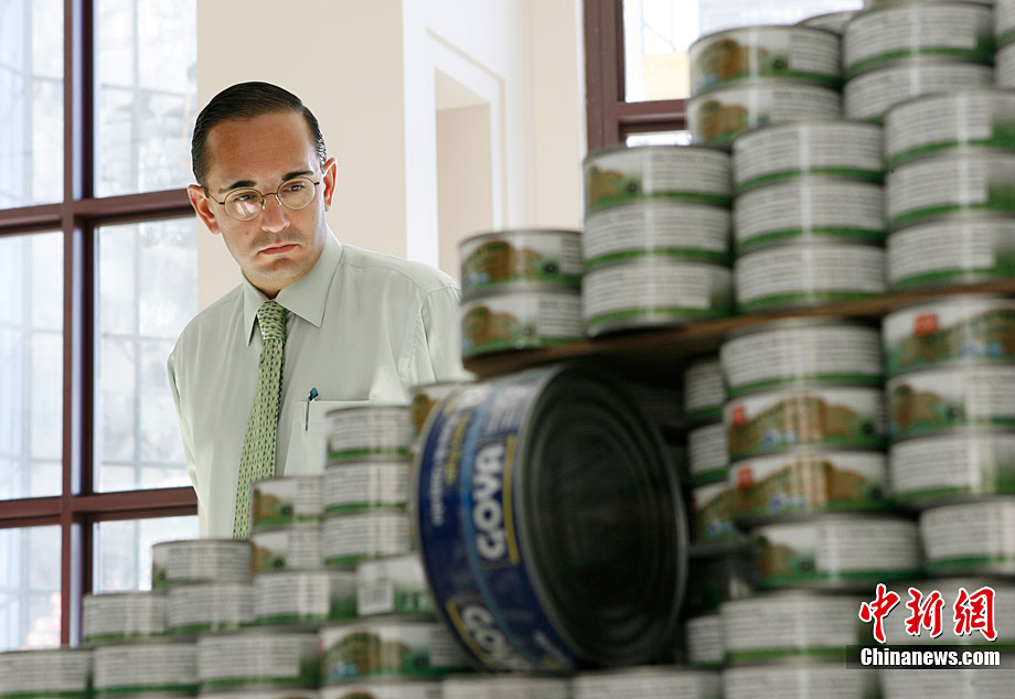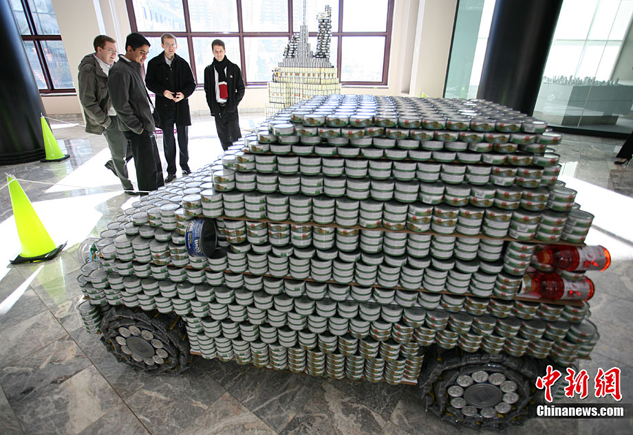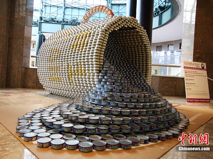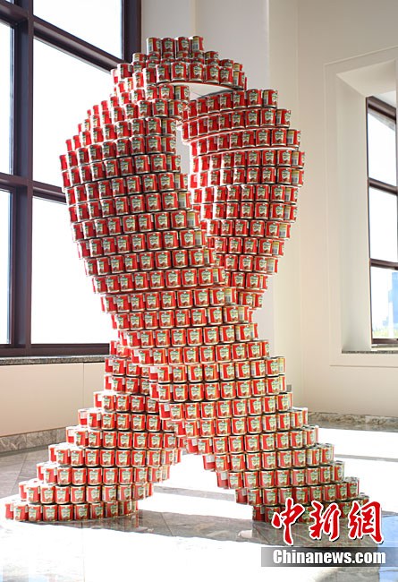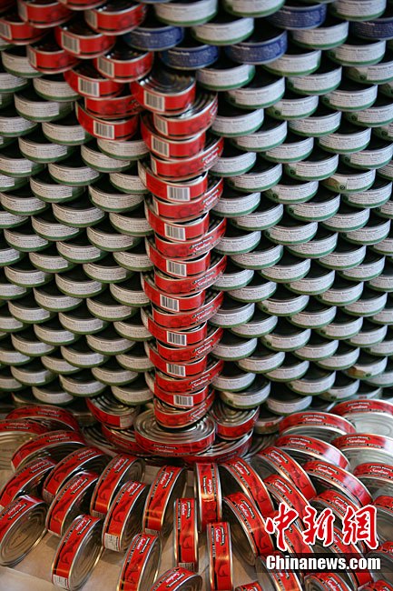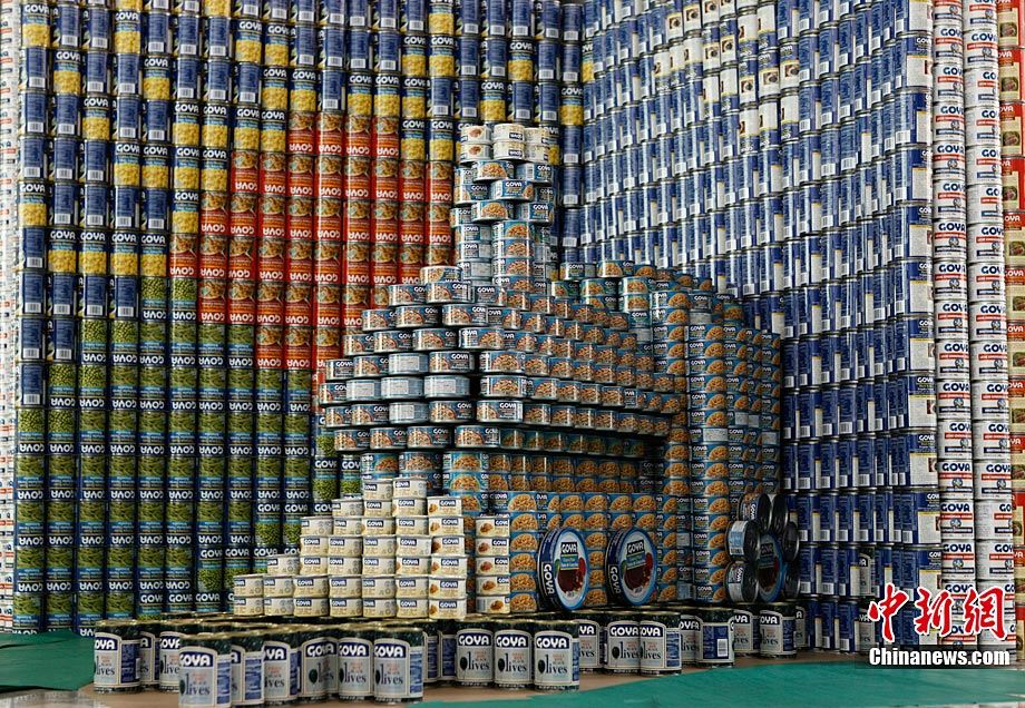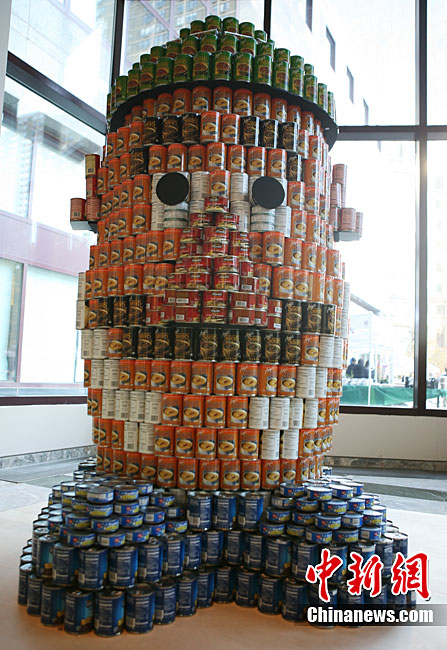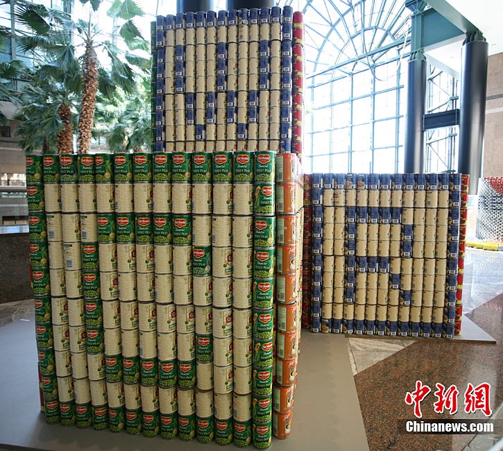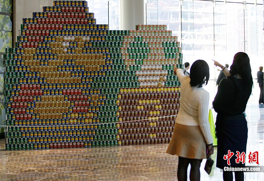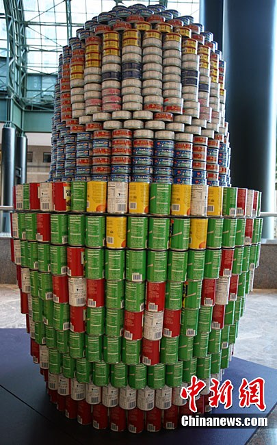 當地時間11月11日,美國紐約世界金融中心的冬園展出了一組用各種食品罐頭組合成的雕塑作品。此次展覽結束后,這些作品將被拆除,所有的罐頭都將被捐給慈善機構“城市收獲”,用來援助仍在忍受饑餓的人。