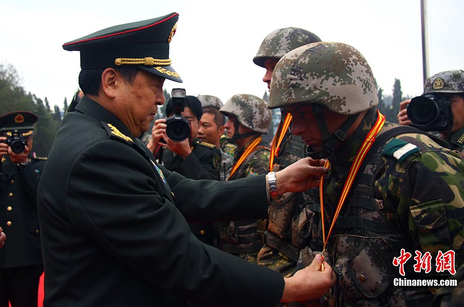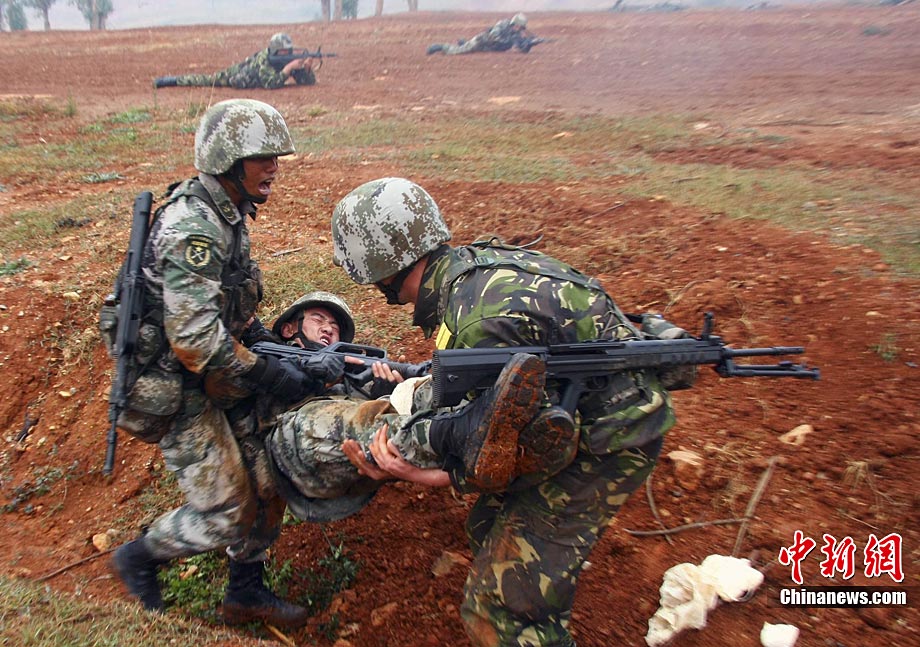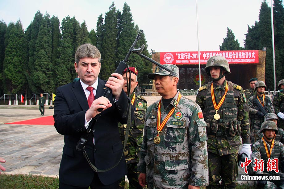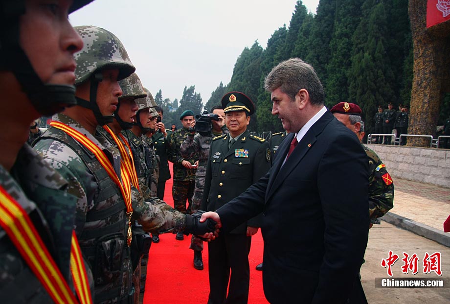 11月13日,“友誼行動-2010”中國與羅馬尼亞陸軍山地部隊在云南昆明進行了9天的聯合訓練后結束。中羅雙方士兵在結訓儀式上進行了步槍、狙擊槍射擊的匯報表演和混合編隊克服山地障礙等戰術綜合演練。圖為中羅雙方士兵表演戰術綜合演練穿過火圈。中新社發 任東 攝
