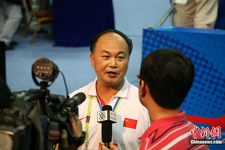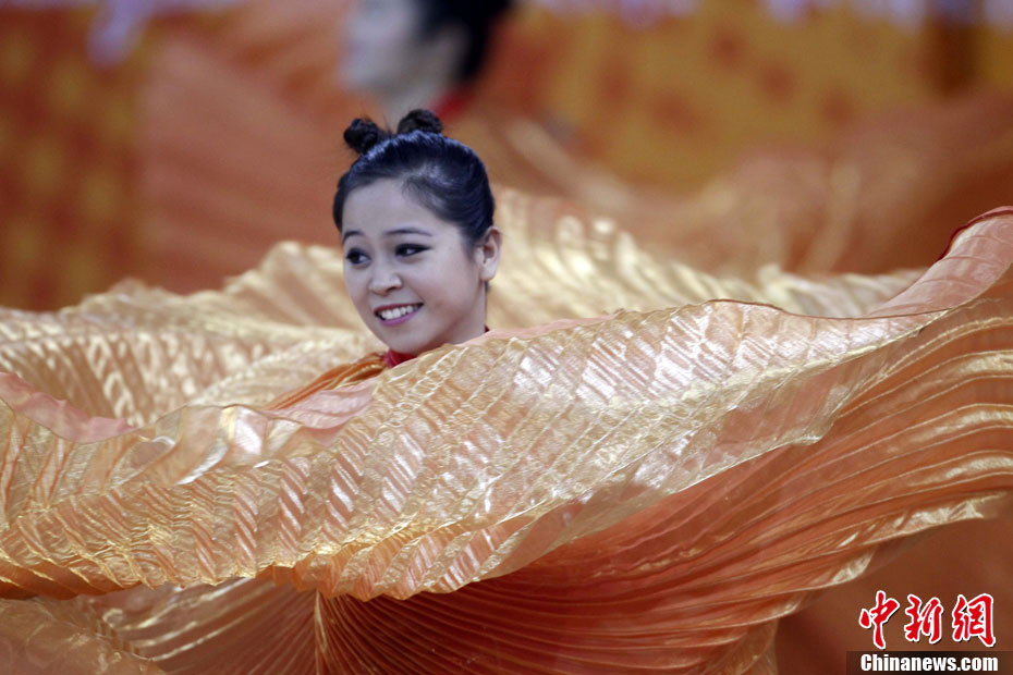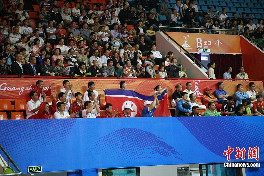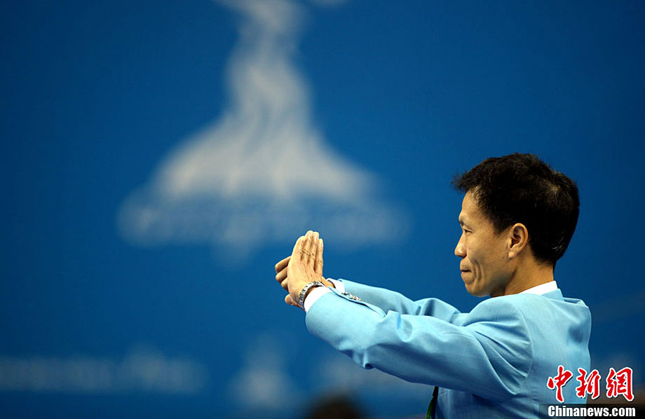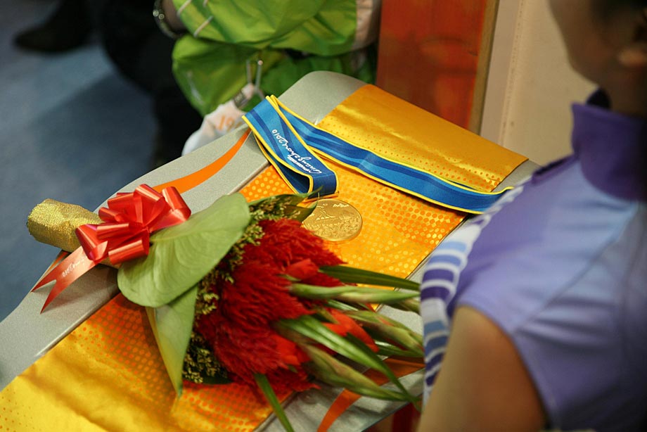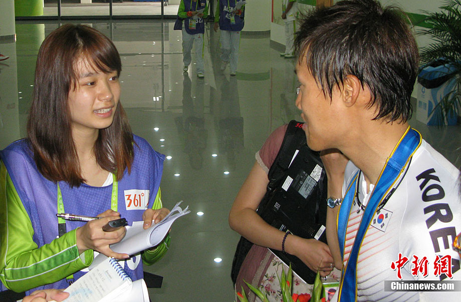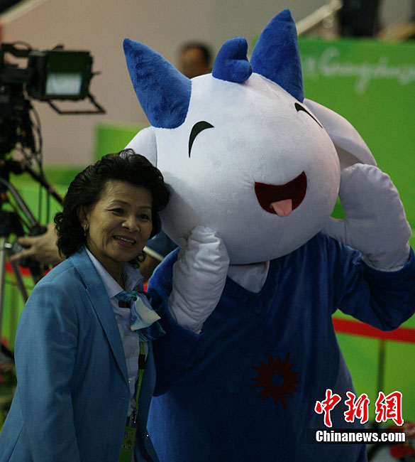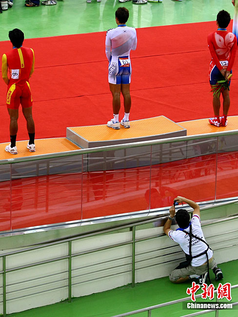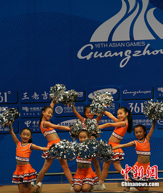 11月14日,在廣州亞運會自行車競速賽中,中國隊的張磊、張淼和成昌松以44秒429的成績戰勝日本隊,為中國代表團再添一枚金牌。圖為在頒獎儀式前,工作人員為頒獎禮儀小姐整理服裝。中新社記者 富田 攝