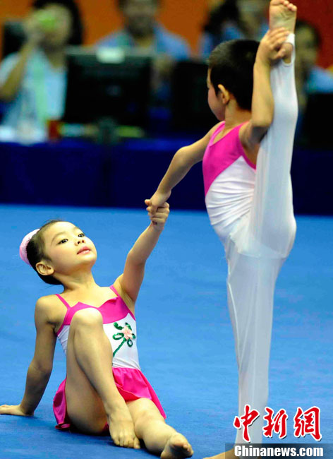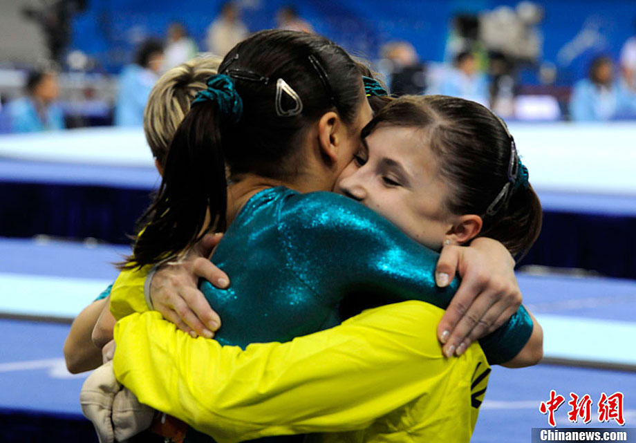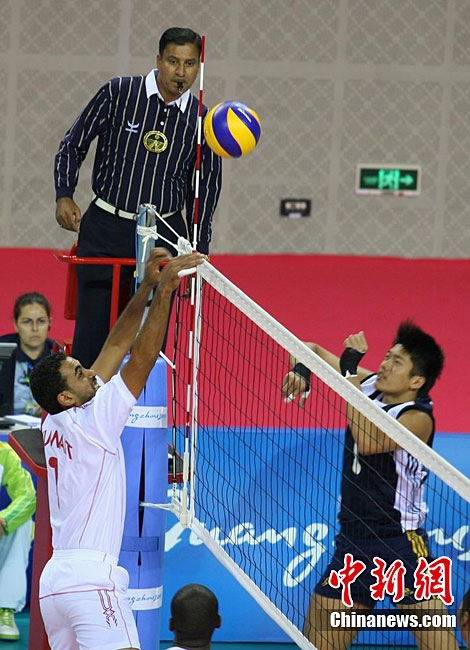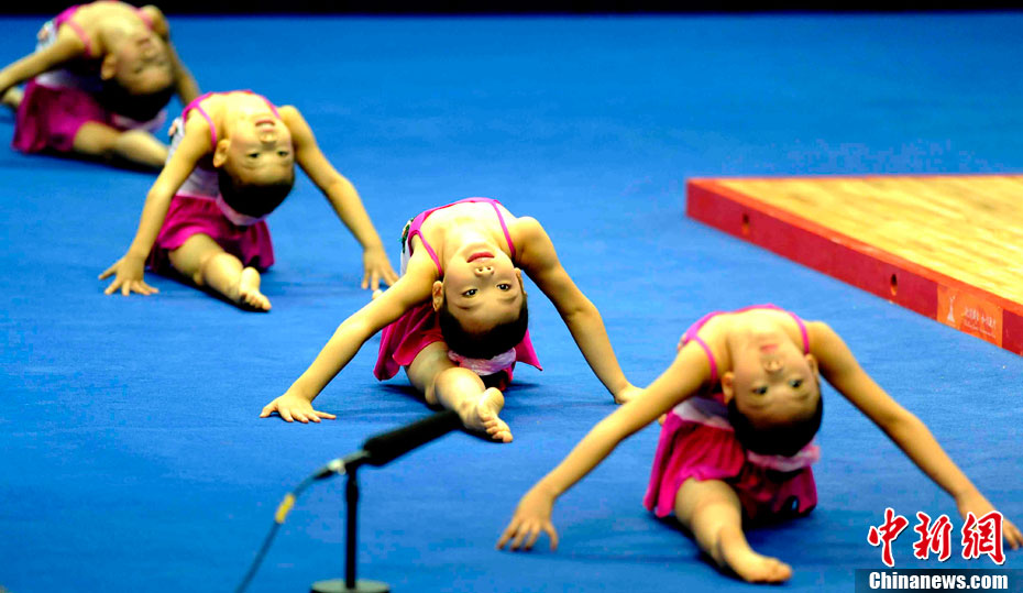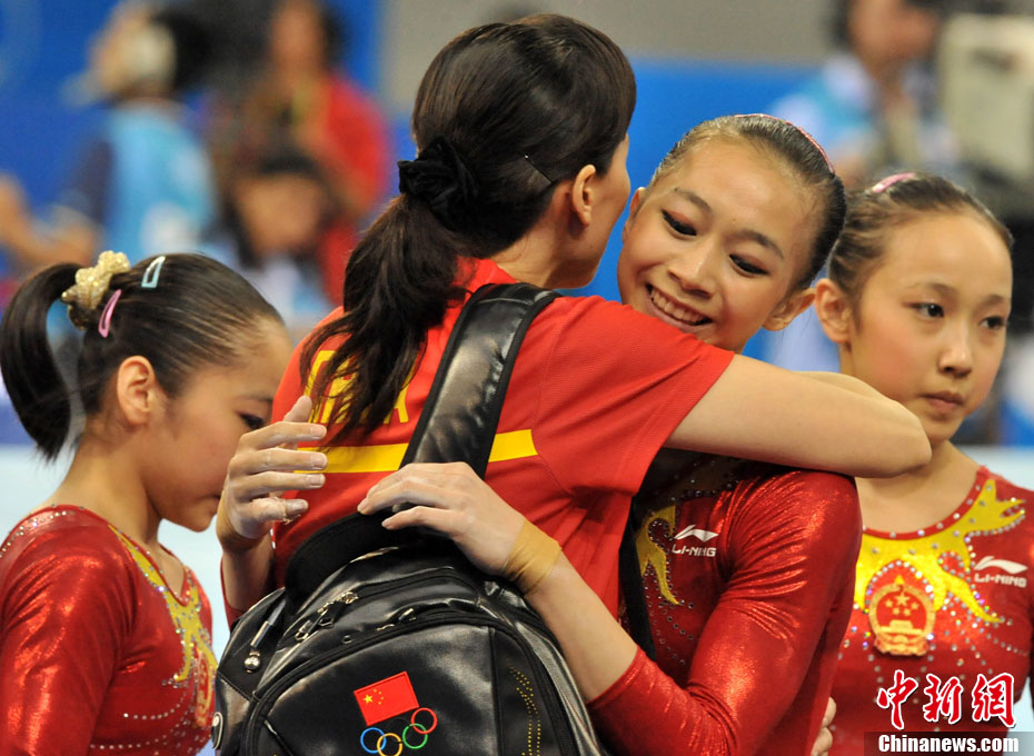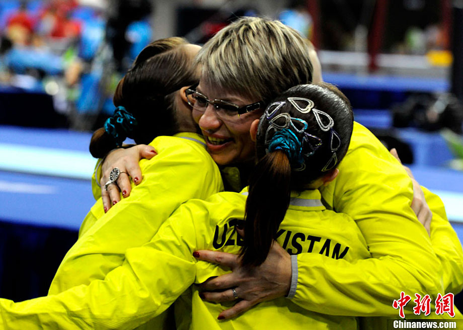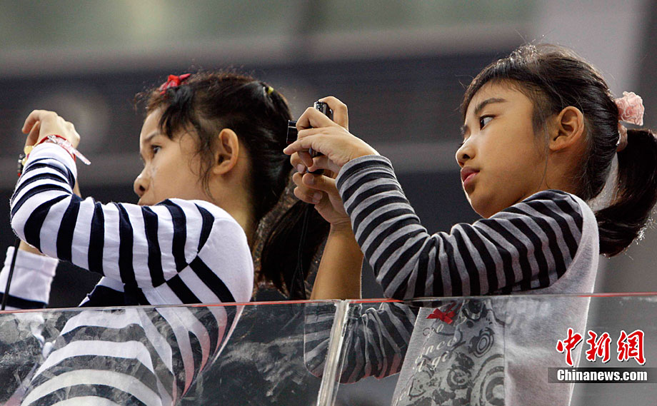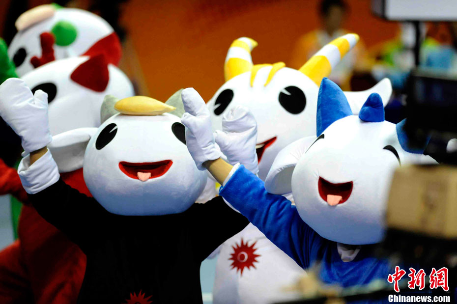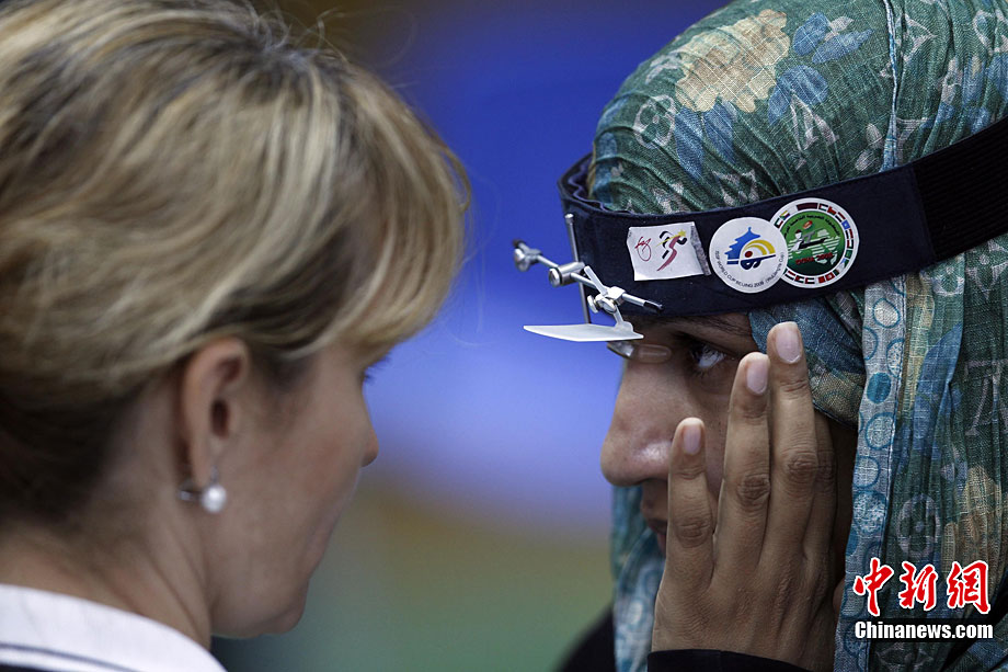 11月14日,在廣州亞運會自行車競速賽中,中國隊的張磊、張淼和成昌松以44秒429的成績戰勝日本隊,為中國代表團再添一枚金牌。圖為在頒獎儀式前,工作人員為頒獎禮儀小姐整理服裝。中新社記者 富田 攝