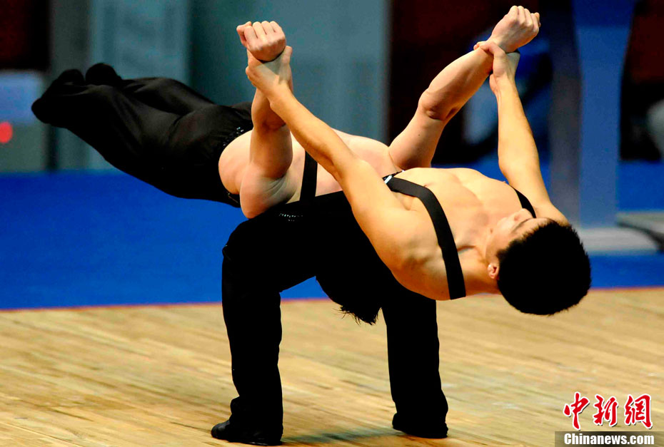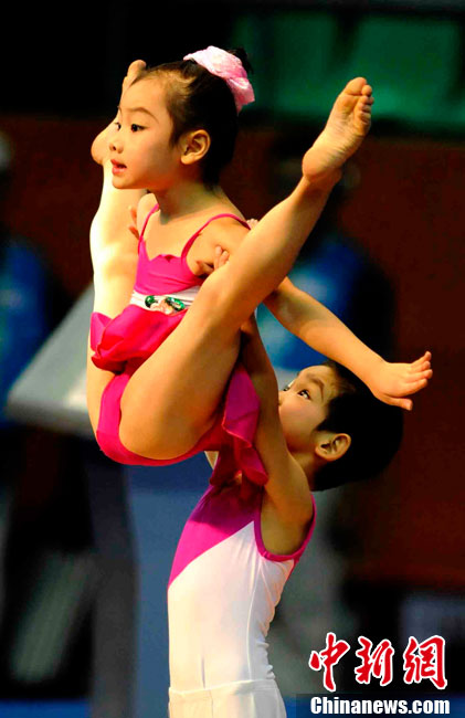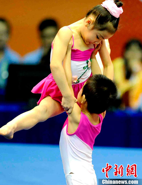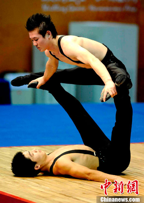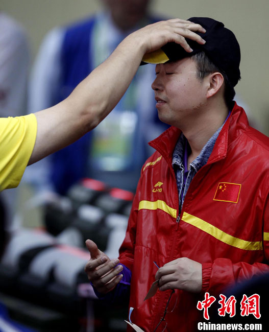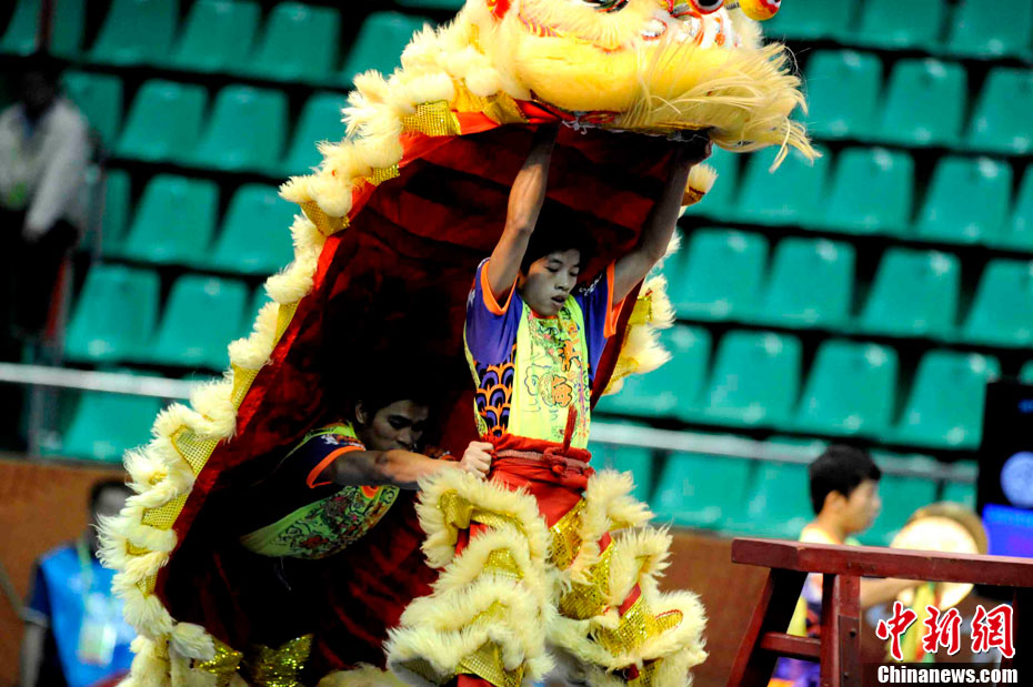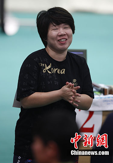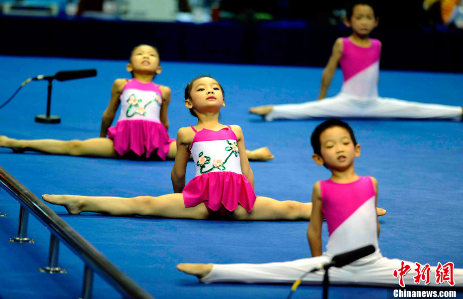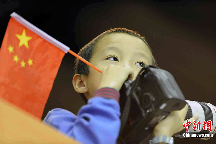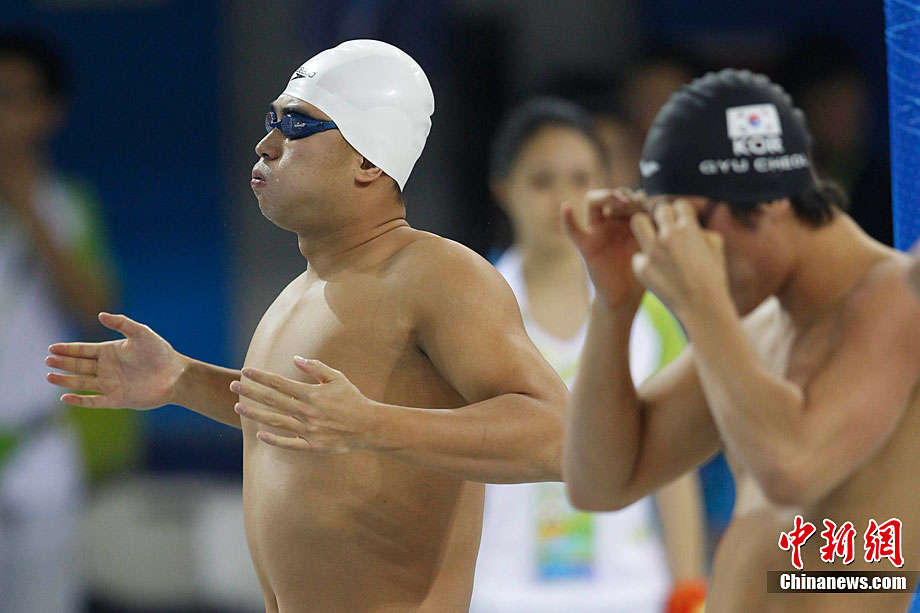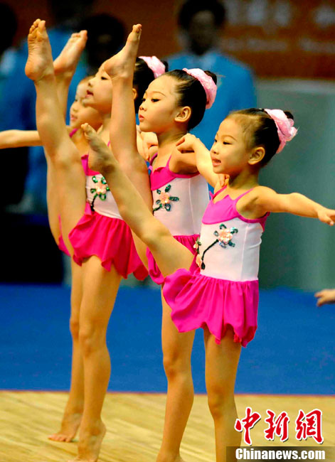 11月14日,在廣州亞運會自行車競速賽中,中國隊的張磊、張淼和成昌松以44秒429的成績戰勝日本隊,為中國代表團再添一枚金牌。圖為在頒獎儀式前,工作人員為頒獎禮儀小姐整理服裝。中新社記者 富田 攝