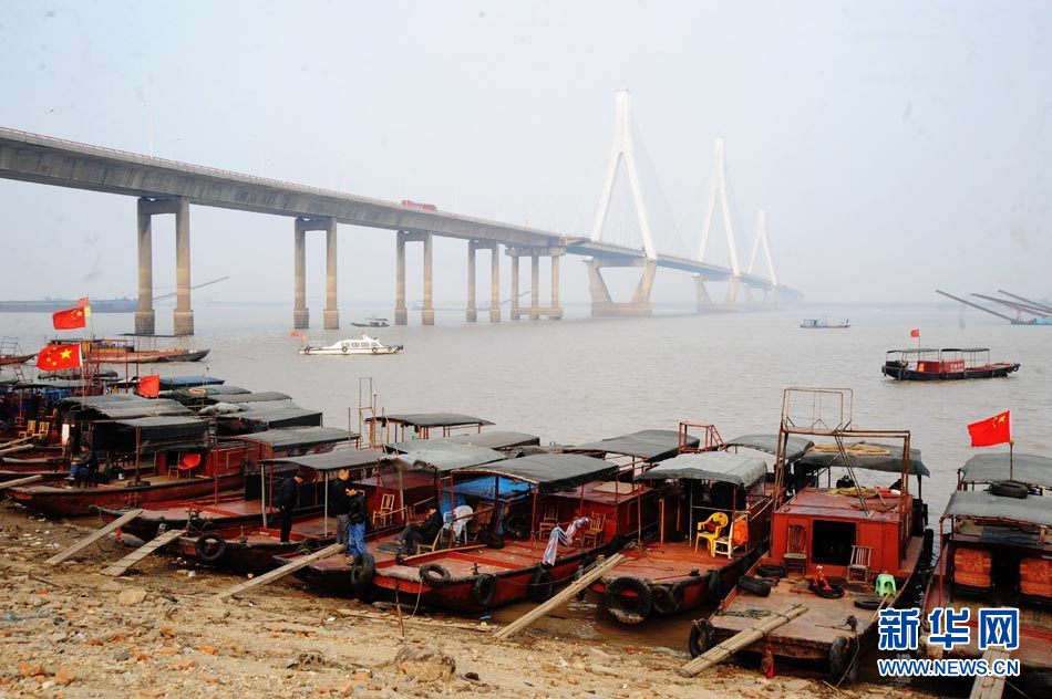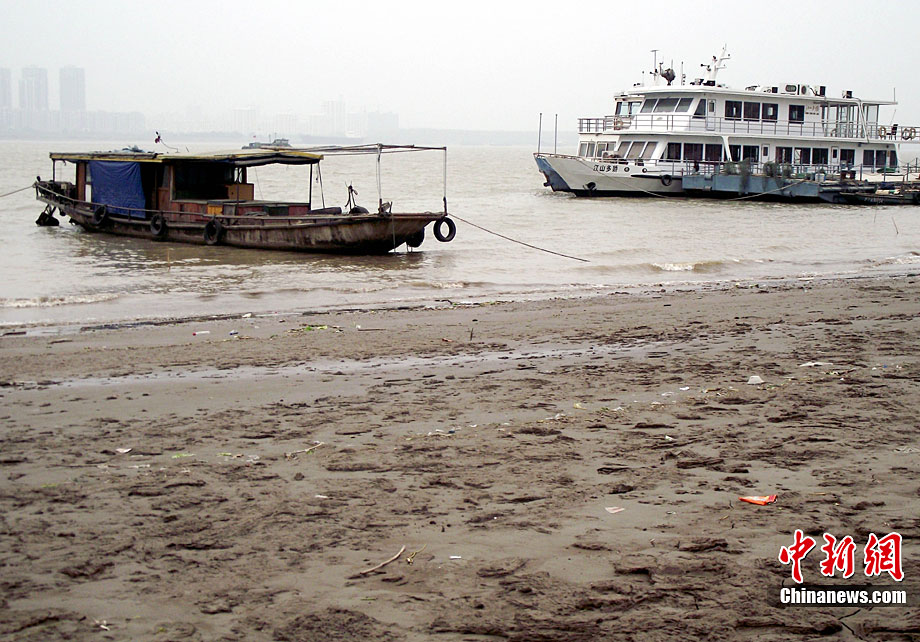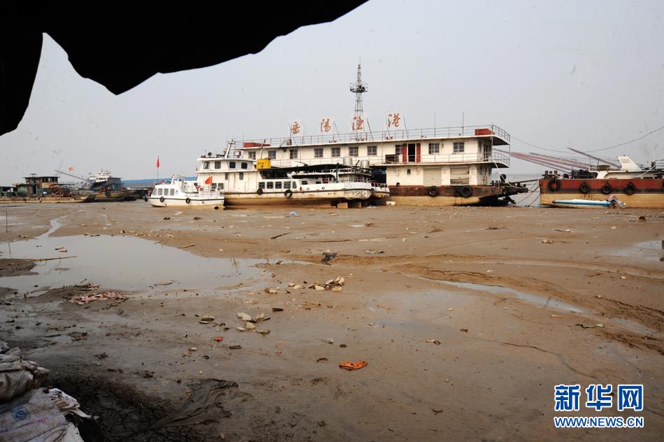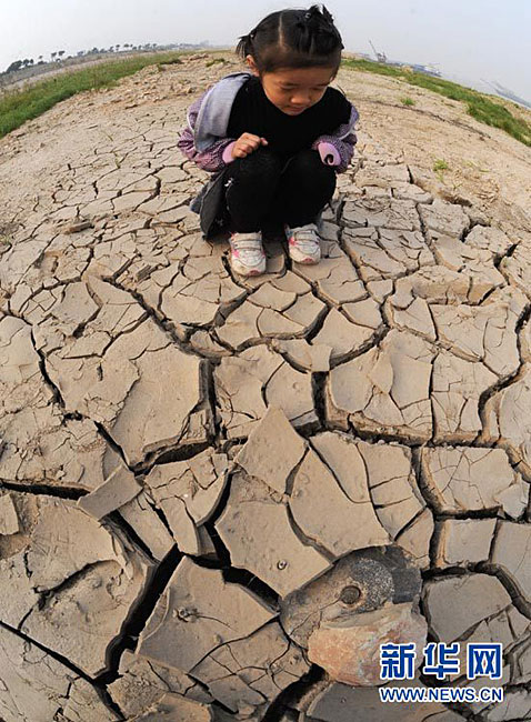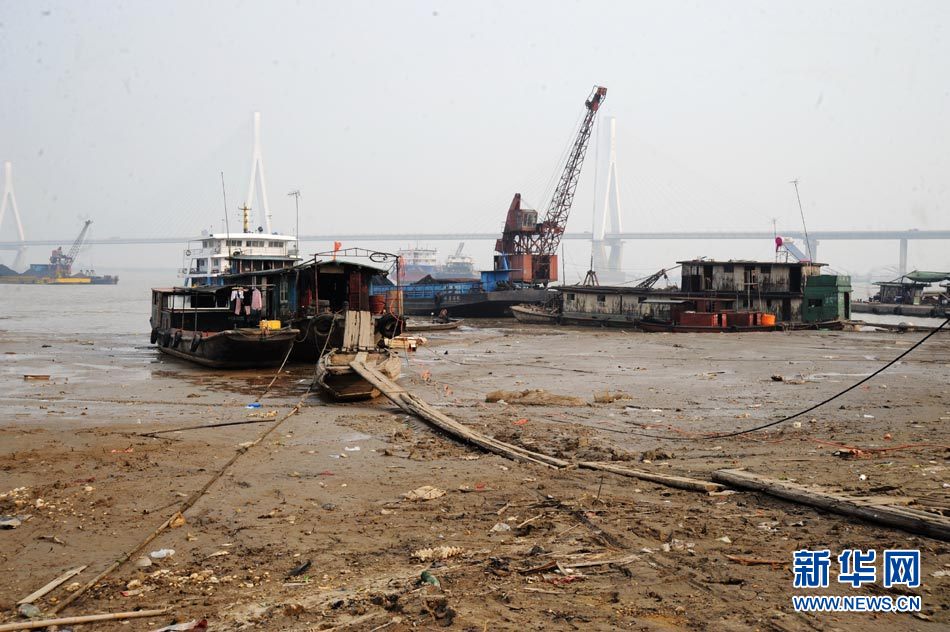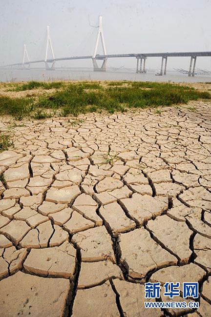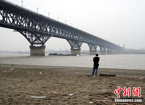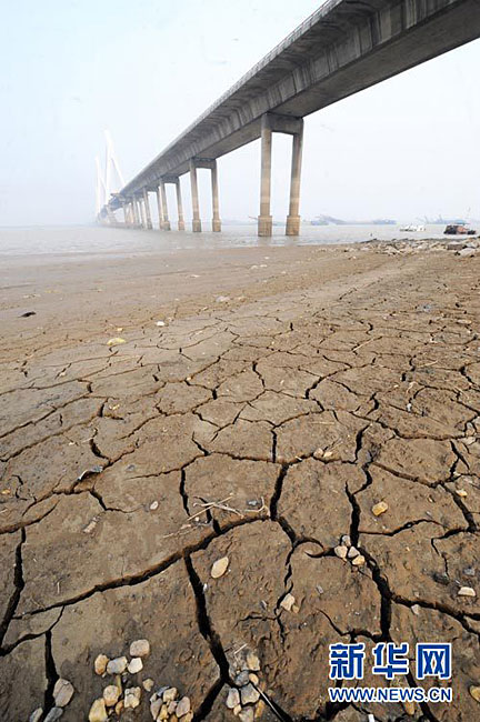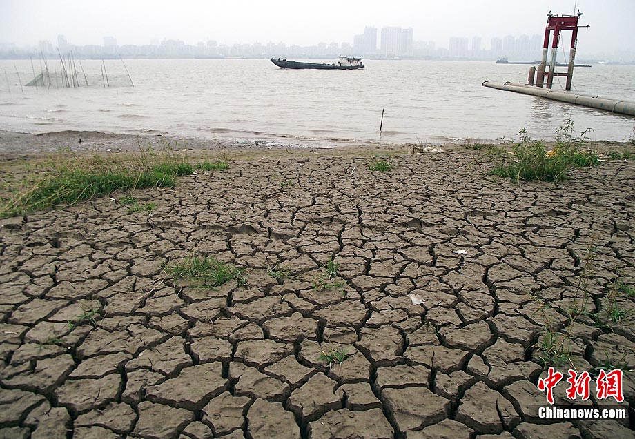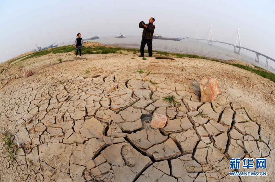 截至2010年11月14日17時,長江南京段水位降至4.08米,大片江岸河床裸露。近期,受中上游枯水和區域降雨量減少等因素影響,長江南京段水位連續下降。圖為11月14日,長江南京段南側江岸河床裸露,土層龜裂。圖片來源:CNSPHOTO 安東 攝