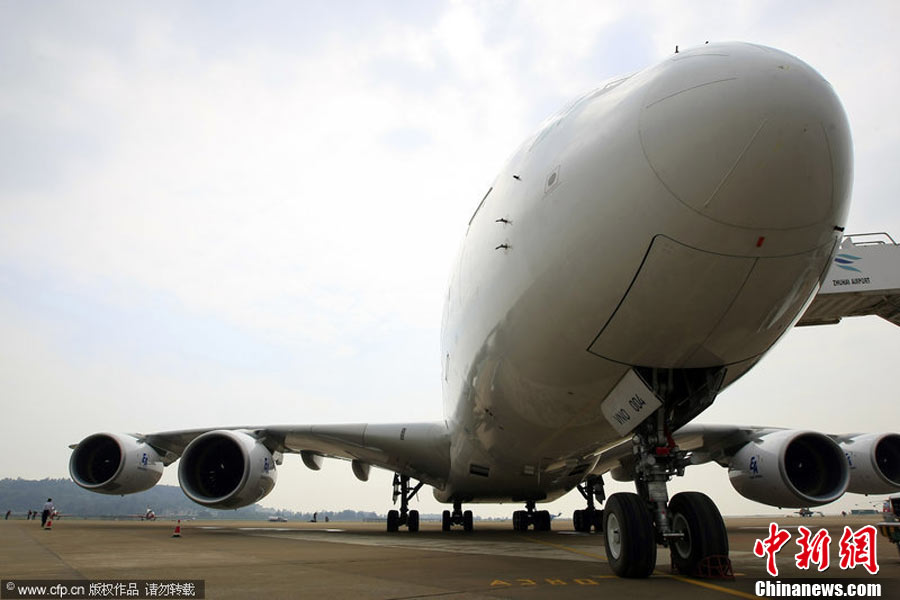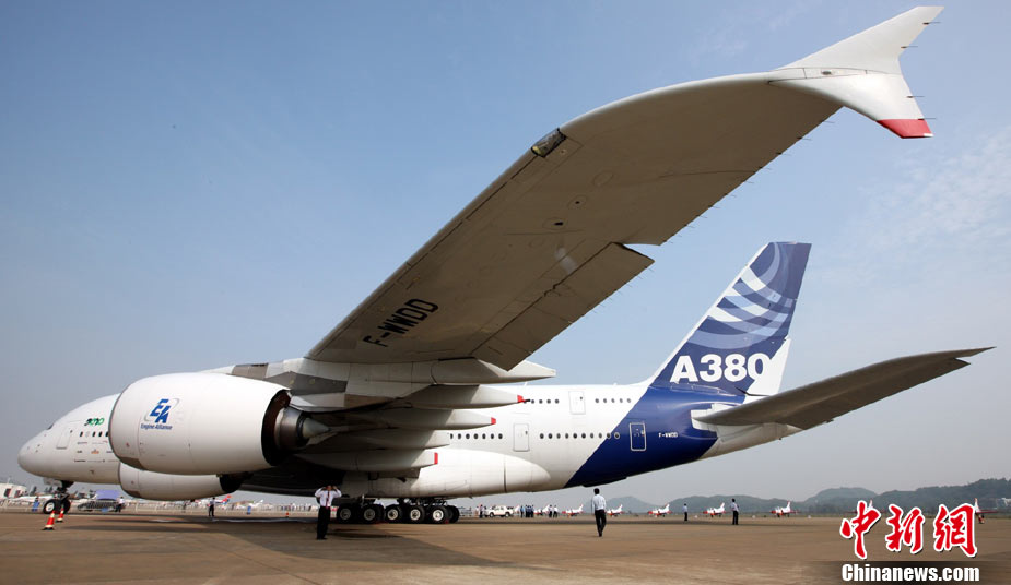 第八屆中國國際航空航天博覽會16日將在珠海開幕。圖為將在航展上亮相的“空中巨無霸”空中客車A380。中新社發 喬天富 攝 圖片來源:CNSPHOTO