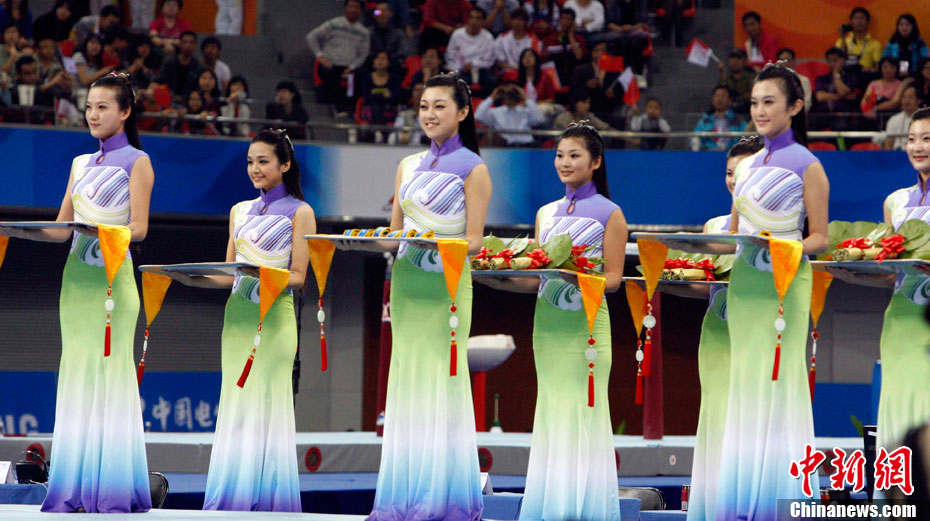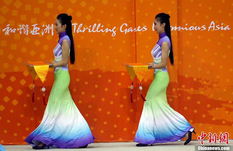 廣州亞運(yùn)會比賽開始后,對于這些美麗的姑娘們“戰(zhàn)斗”才剛剛打響,她們每天早上6點(diǎn)半就起床,趕到賽場,開始4個(gè)小時(shí)的準(zhǔn)備工作——化妝、做頭發(fā)、整體造型,這一切都為頒獎(jiǎng)典禮的那短短一刻。