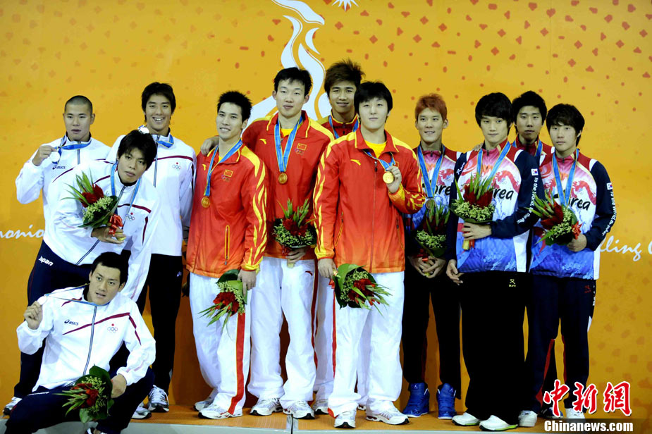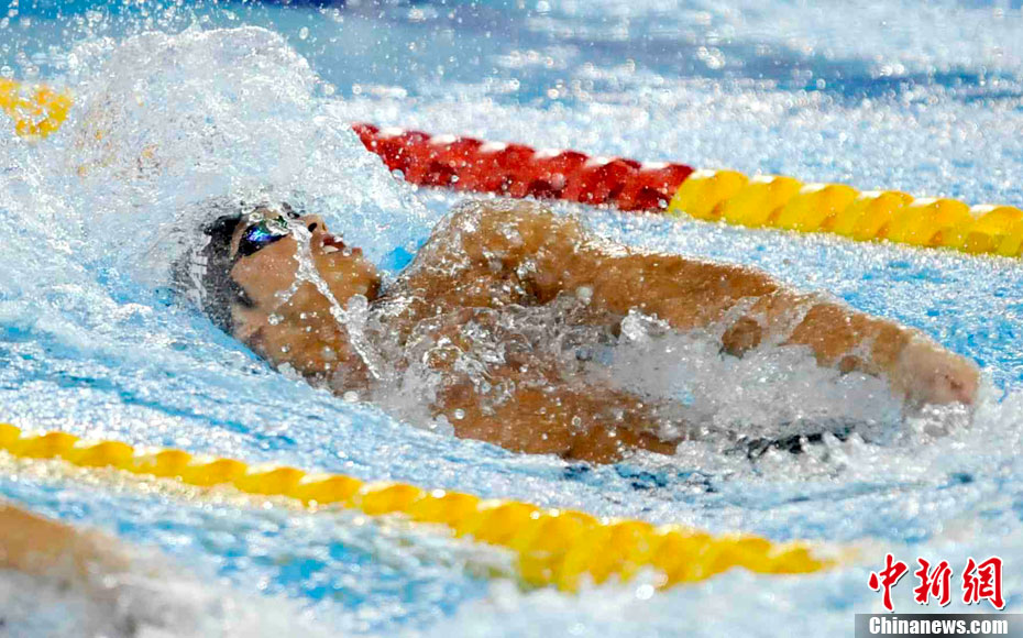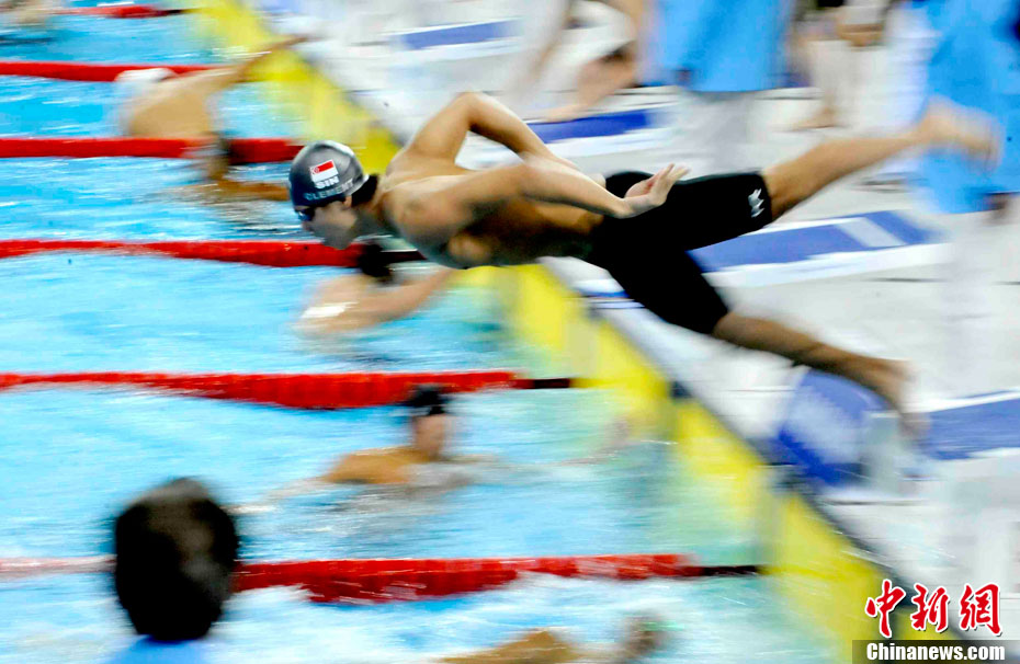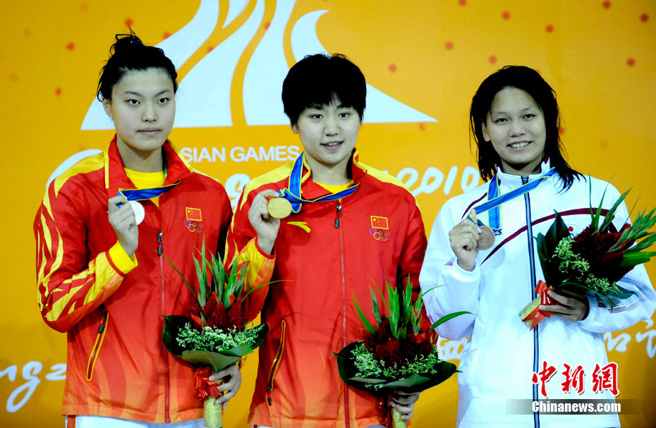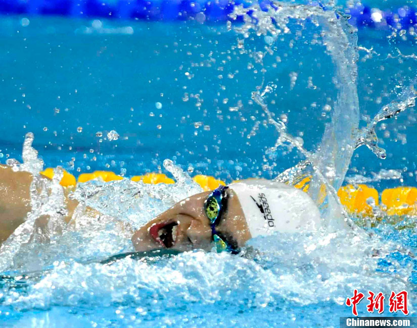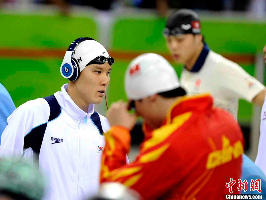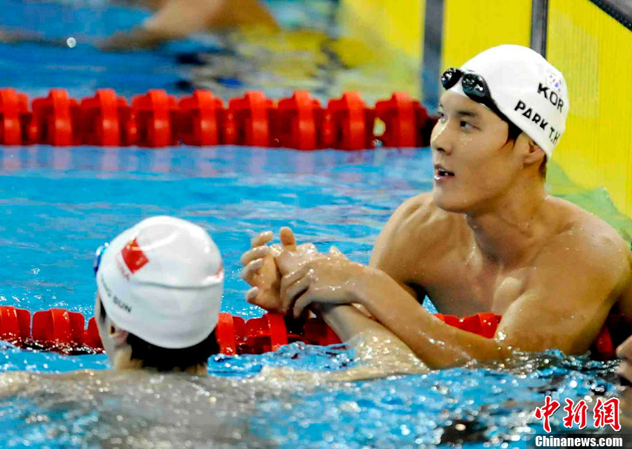 11月16日,韓國(guó)選手樸泰桓力壓中國(guó)張琳、孫楊獲得亞運(yùn)會(huì)男子400米自由泳金牌。中新社記者 王東明 攝