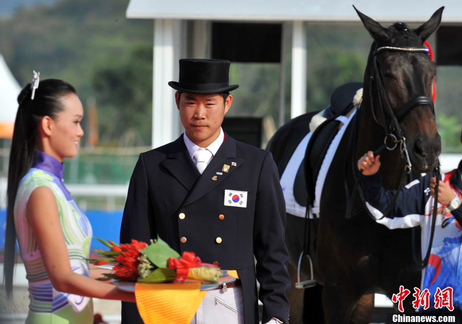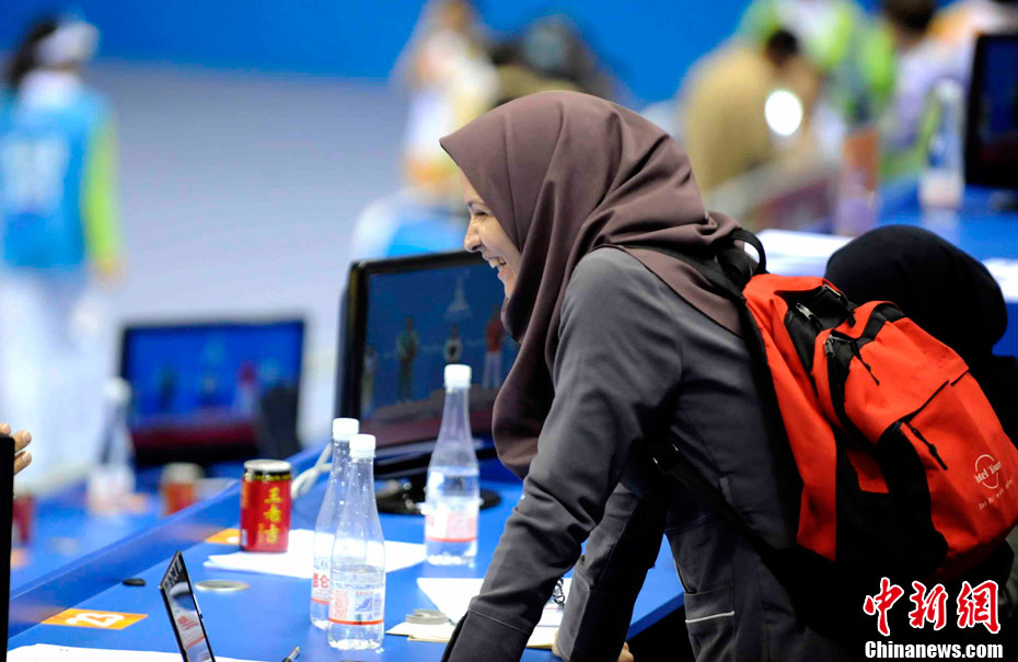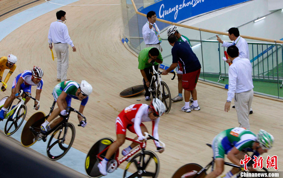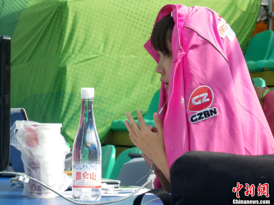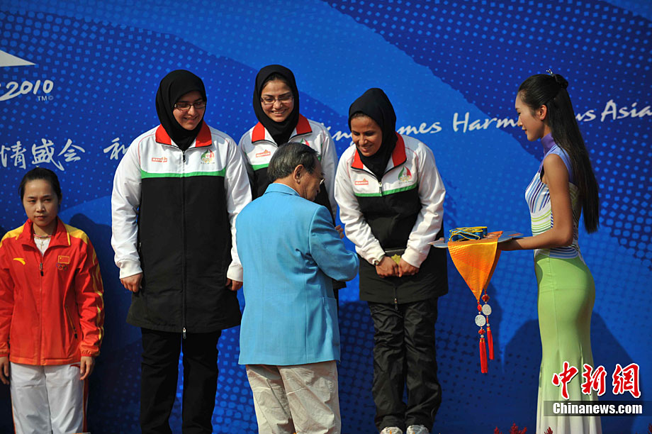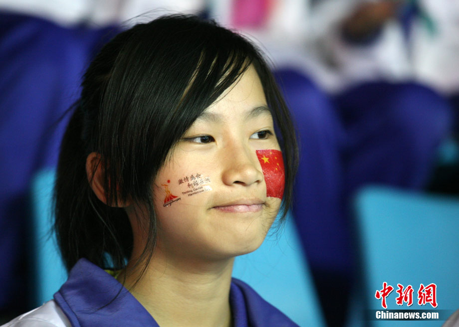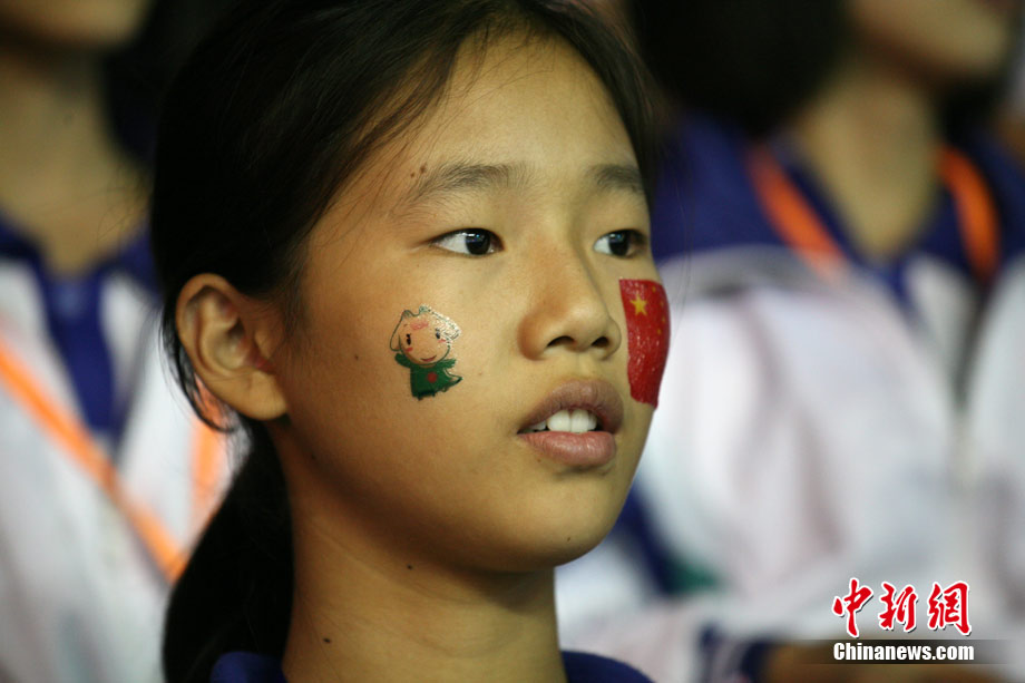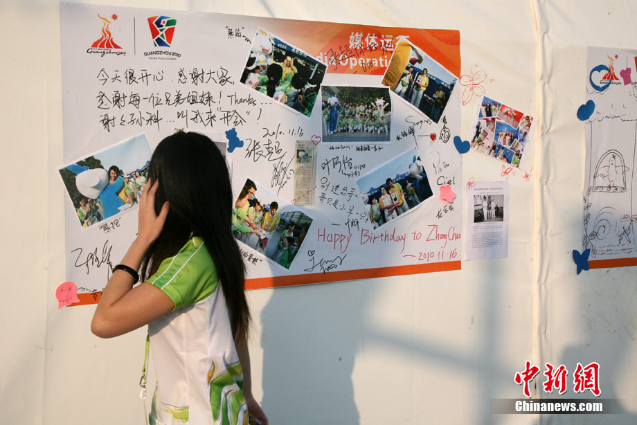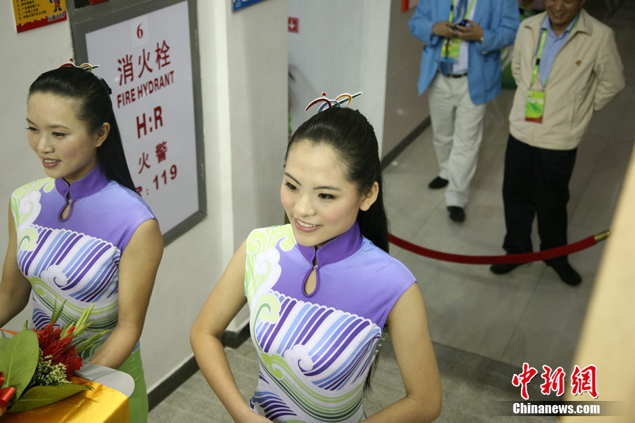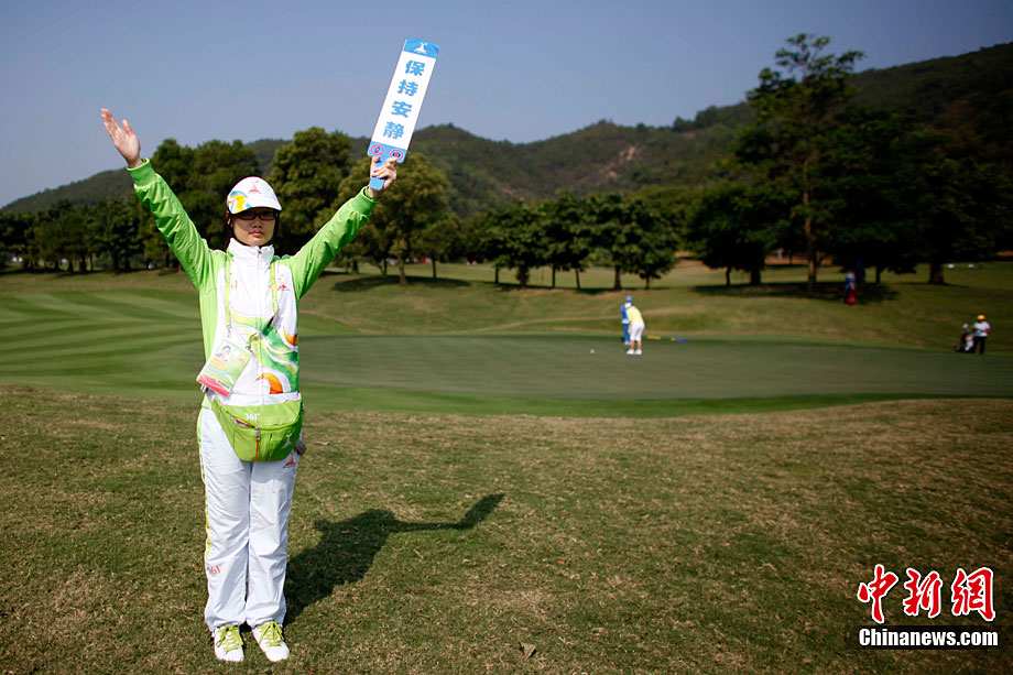 11月17日,廣州亞運會高爾夫球賽在廣州九龍湖高爾夫球會開賽,當日共進行男子個人、男子團體和女子個人、女子團體四個項目的第一輪比賽。圖為志愿者在賽場舉牌維護秩序。 中新社記者 盛佳鵬 攝