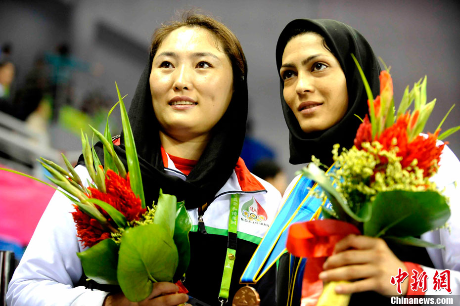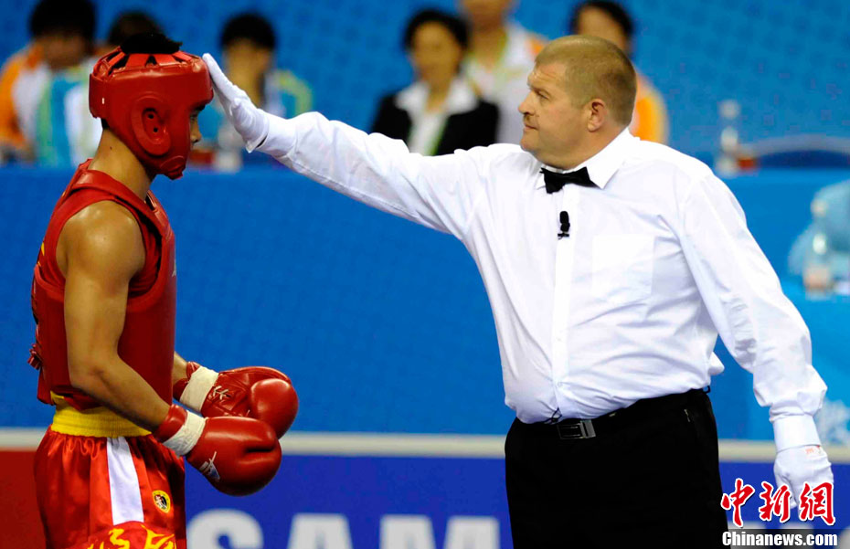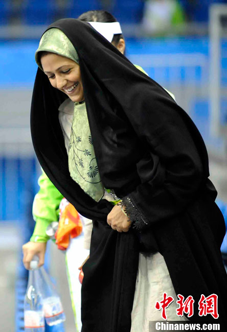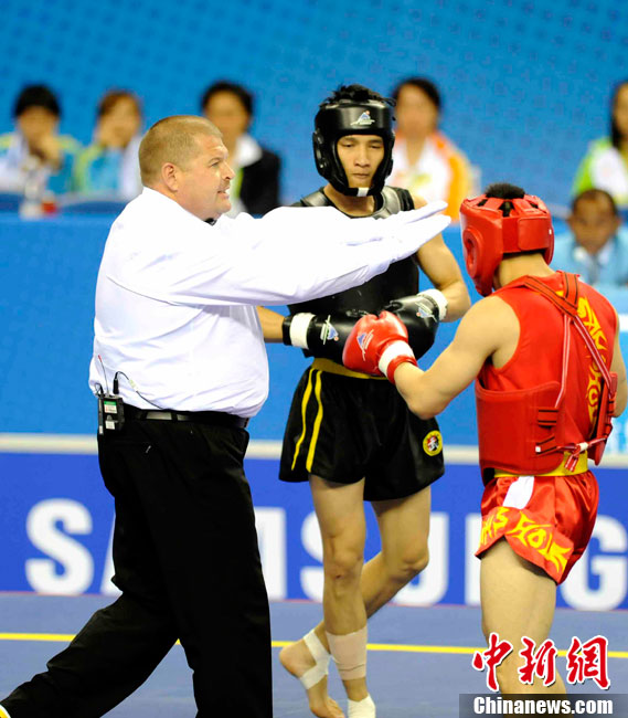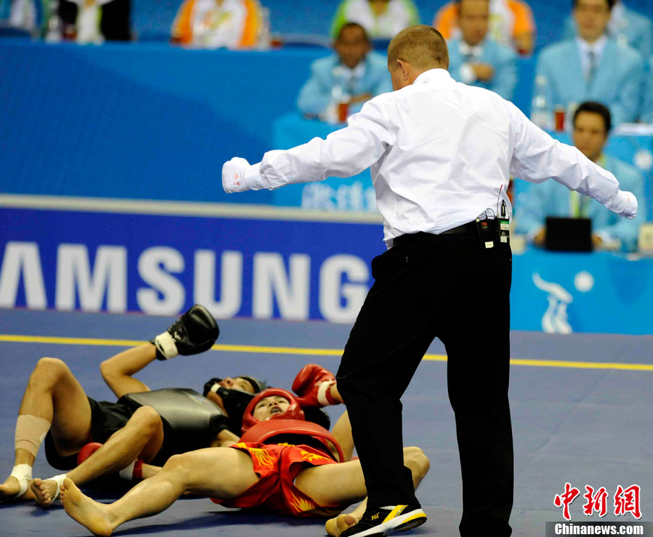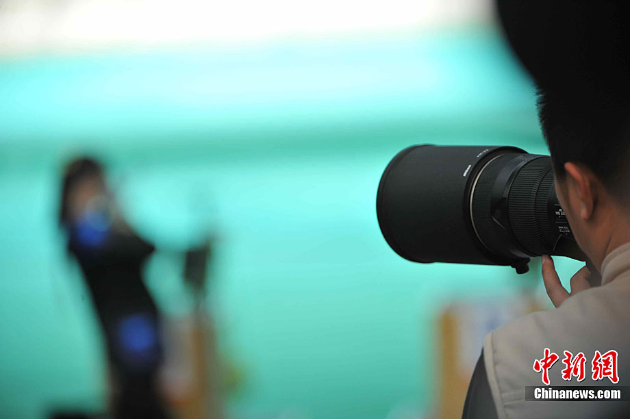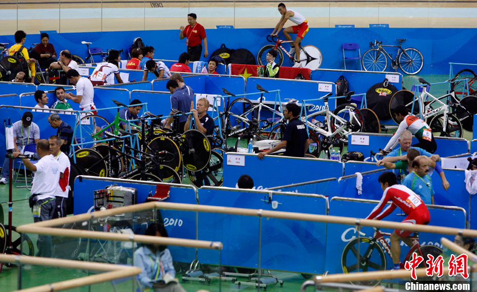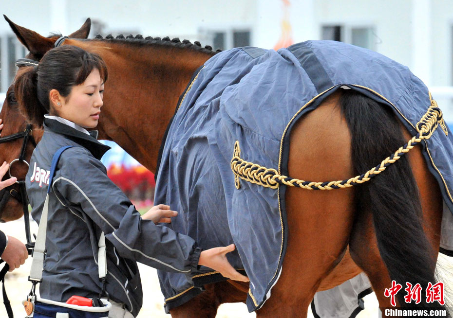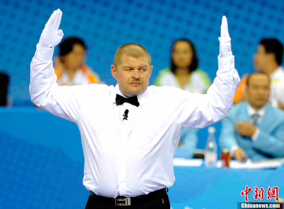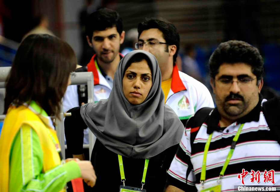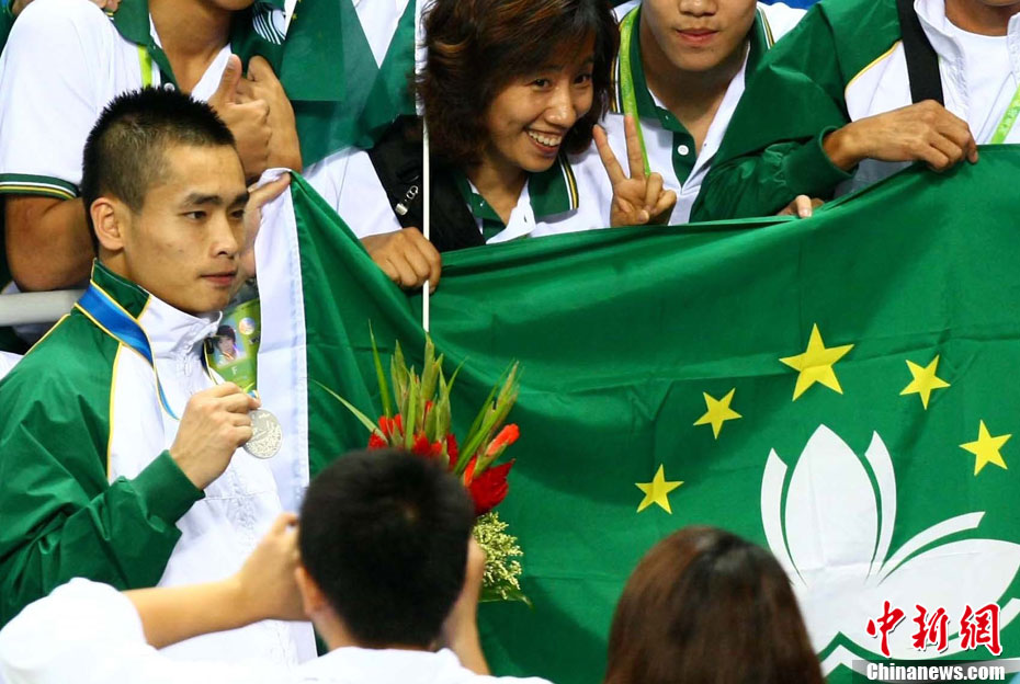 11月17日,廣州亞運會高爾夫球賽在廣州九龍湖高爾夫球會開賽,當日共進行男子個人、男子團體和女子個人、女子團體四個項目的第一輪比賽。圖為志愿者在賽場舉牌維護秩序。 中新社記者 盛佳鵬 攝