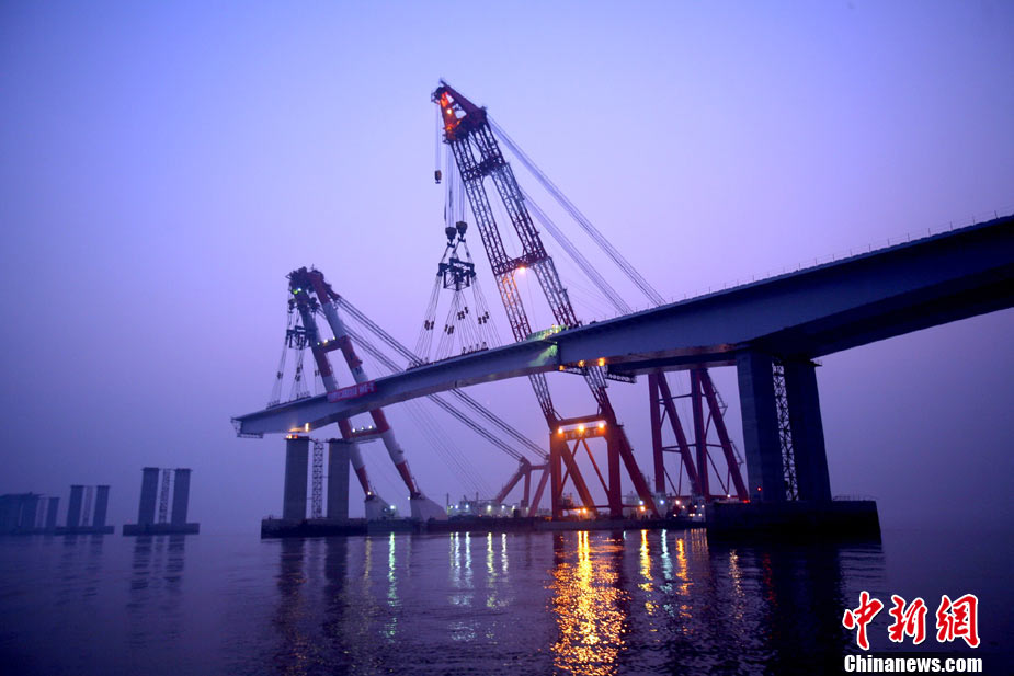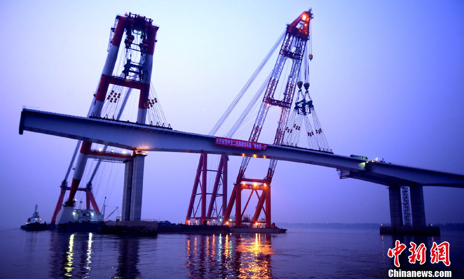11月19日17時58分,堪稱“神州第一梁”的崇啟大橋首節(jié)185米鋼箱梁吊裝成功。崇啟大橋位于江蘇啟東和上海崇明島之間,長185米、寬16米的主橋變截面鋼箱梁精確吊放標(biāo)志著崇啟大橋施工難度最大、技術(shù)最復(fù)雜、安全風(fēng)險最高的吊裝工程取得關(guān)鍵性勝利,創(chuàng)造了國內(nèi)橋用鋼箱梁架設(shè)在單節(jié)起吊規(guī)模上的新記錄。 中新社發(fā) 崇啟橋指 供圖