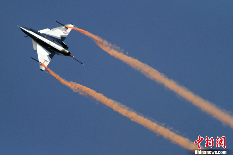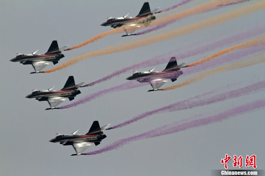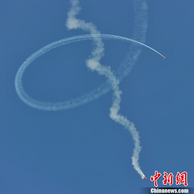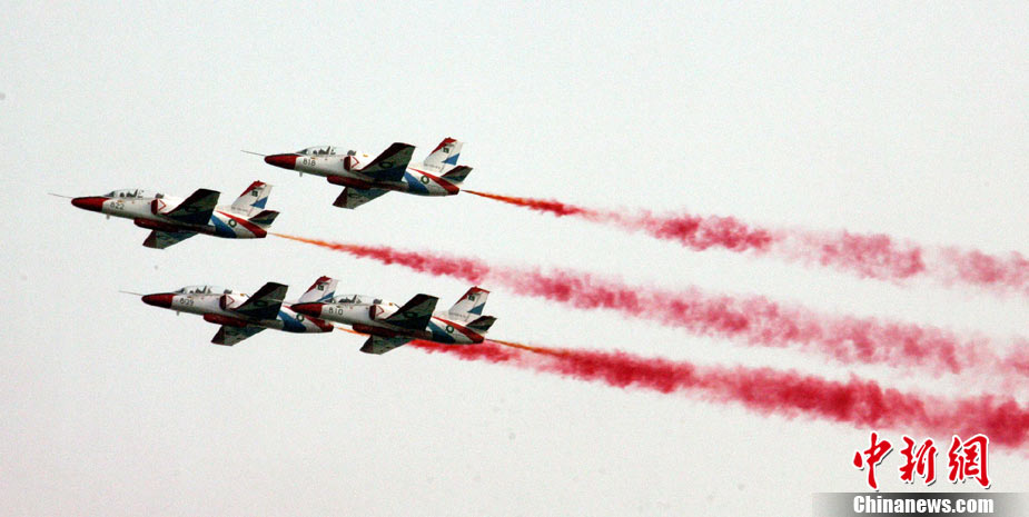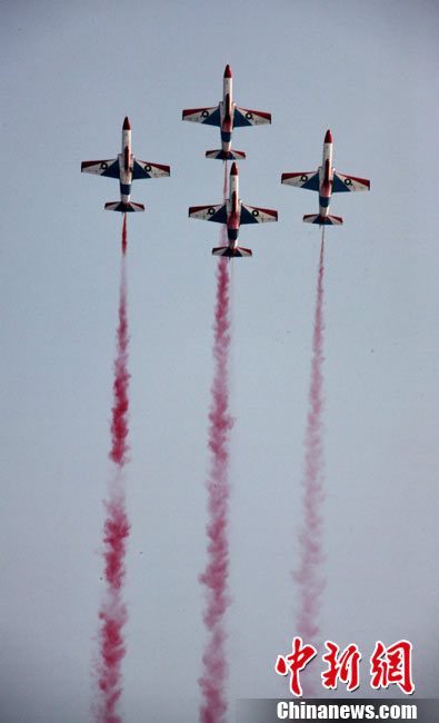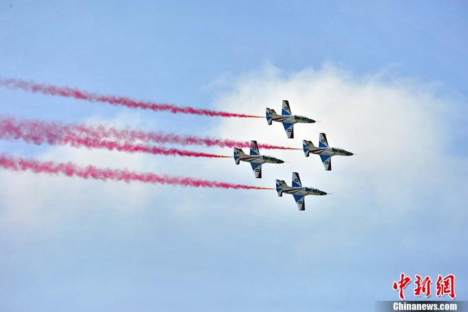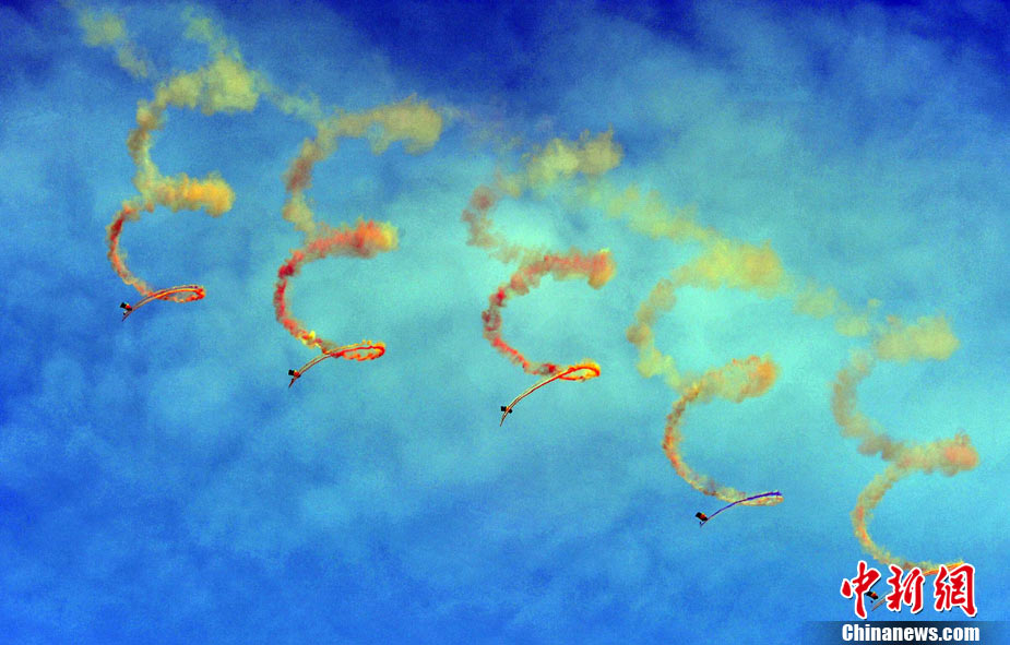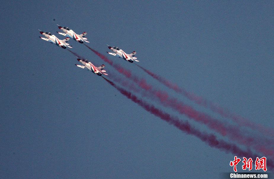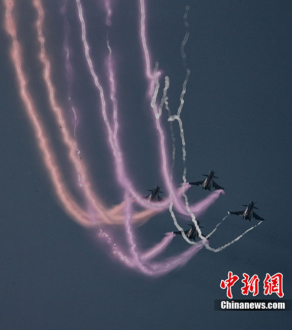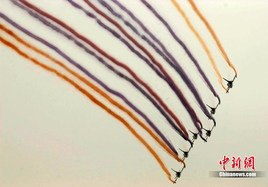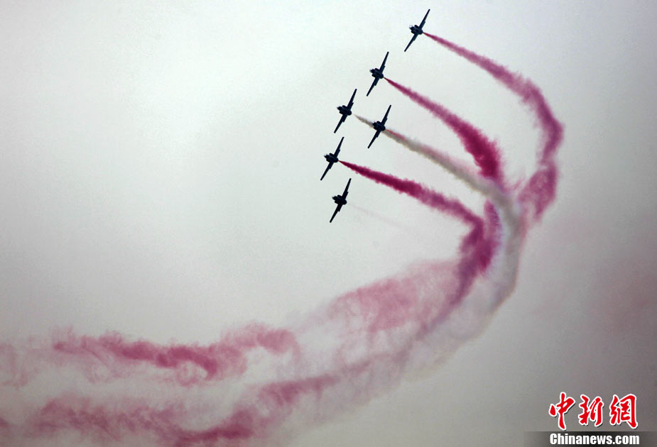 11月19日,在珠海第8屆中國國際航空航天博覽會上,巴基斯坦空軍雄獅飛行表演隊的空中英豪們駕駛k8教練機,憑借高超的飛行技藝,以珠海機場上空為舞臺,承、轉、啟、合,任意揮灑,給觀看的中外賓客以視覺享受。中新社發 喬天富 攝 圖片來源:CNSPHOTO