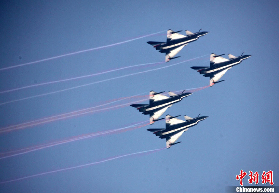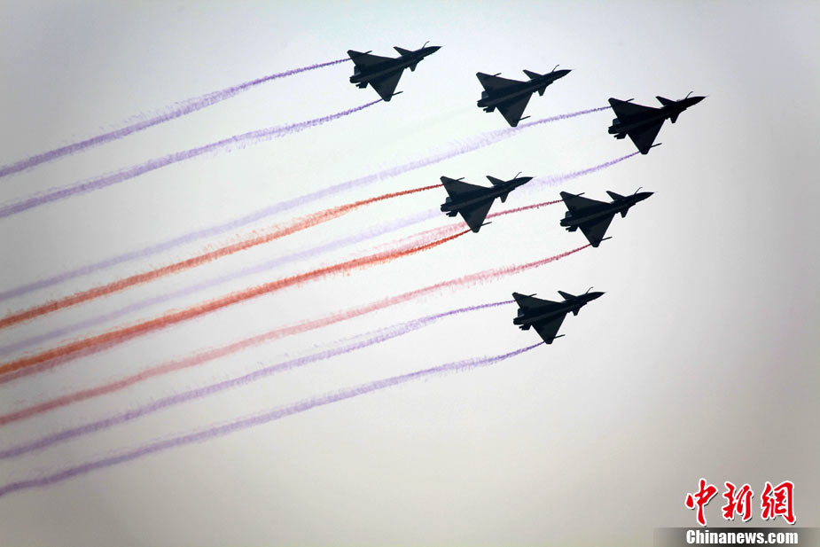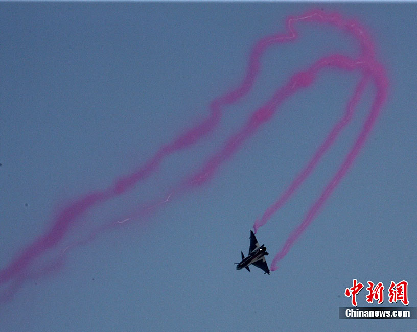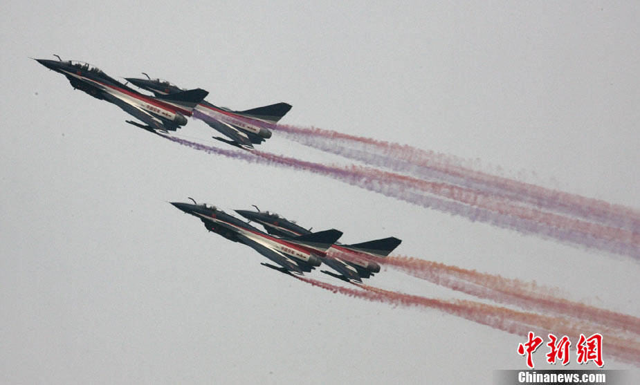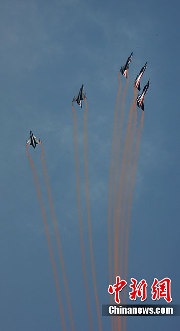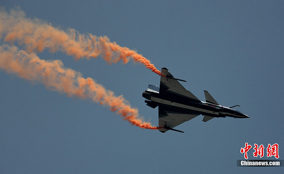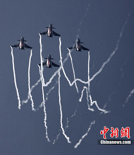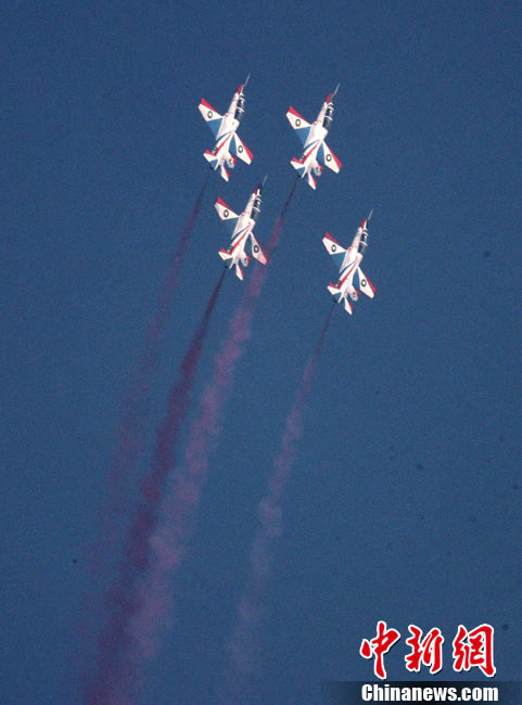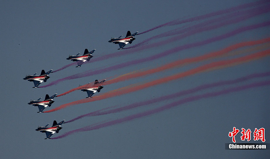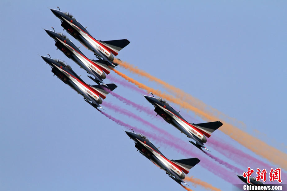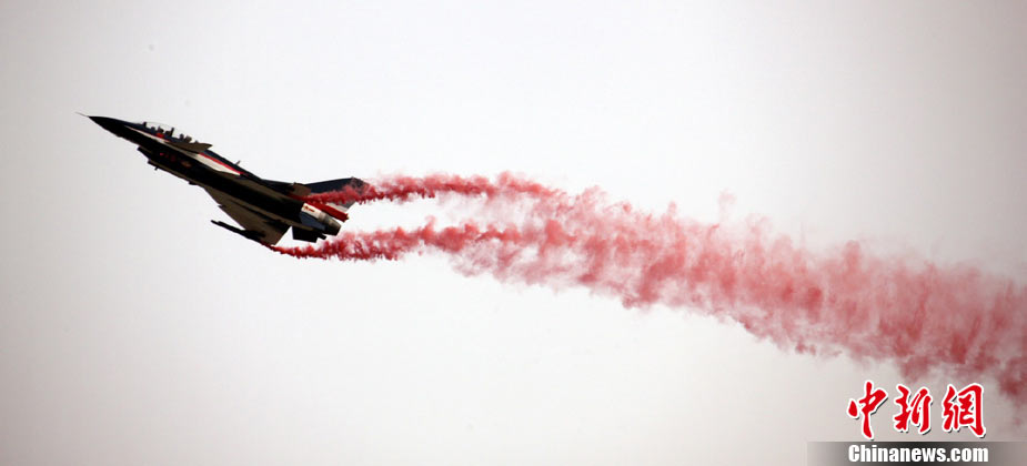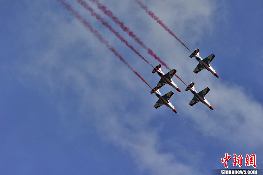 11月19日,在珠海第8屆中國國際航空航天博覽會上,巴基斯坦空軍雄獅飛行表演隊的空中英豪們駕駛k8教練機,憑借高超的飛行技藝,以珠海機場上空為舞臺,承、轉、啟、合,任意揮灑,給觀看的中外賓客以視覺享受。中新社發 喬天富 攝 圖片來源:CNSPHOTO