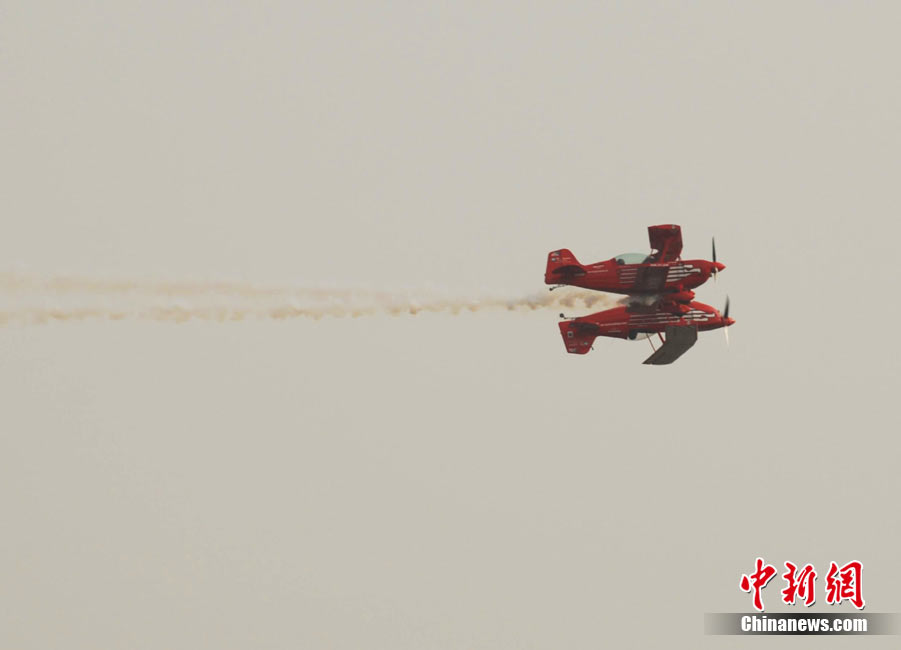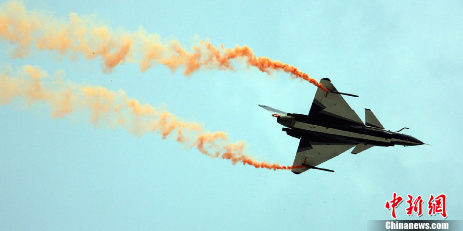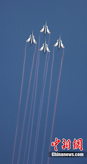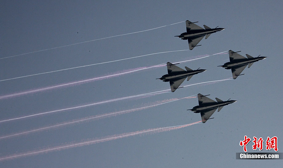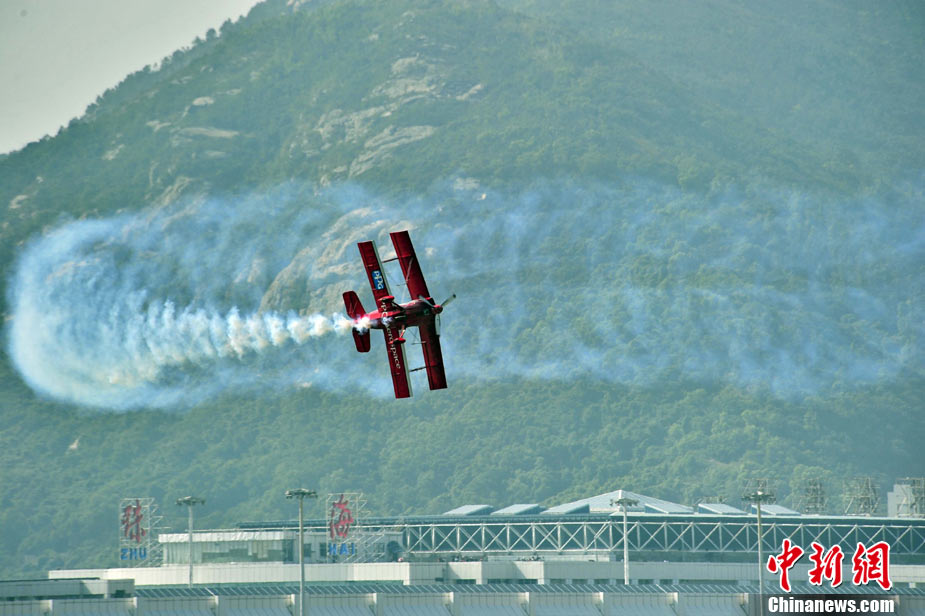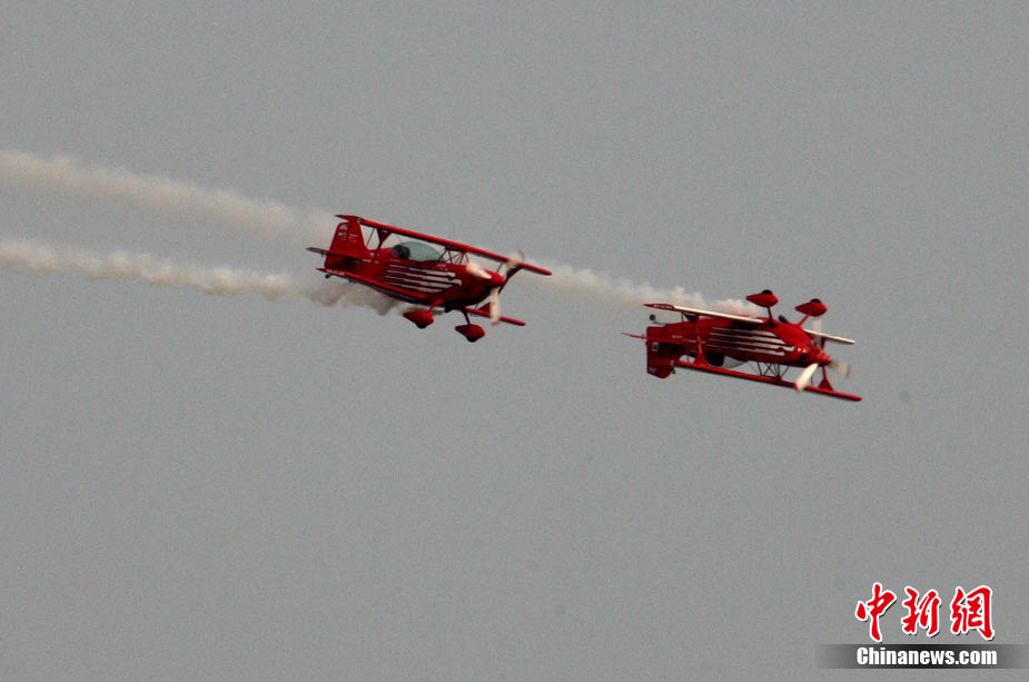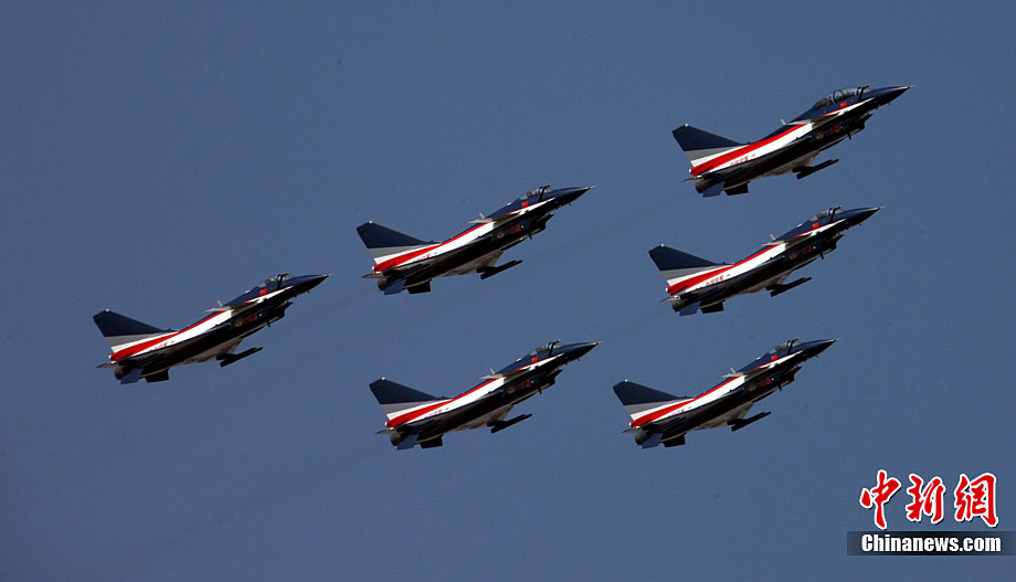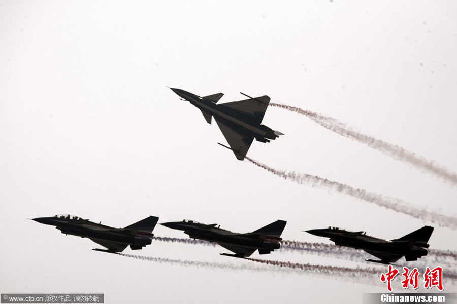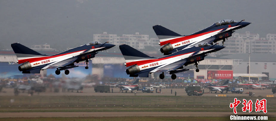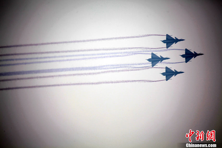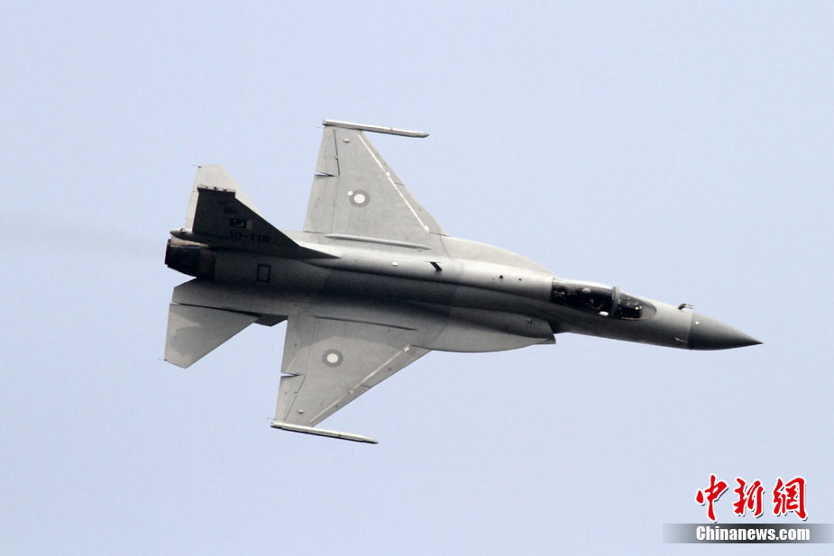 11月19日,在珠海第8屆中國國際航空航天博覽會上,巴基斯坦空軍雄獅飛行表演隊的空中英豪們駕駛k8教練機,憑借高超的飛行技藝,以珠海機場上空為舞臺,承、轉、啟、合,任意揮灑,給觀看的中外賓客以視覺享受。中新社發 喬天富 攝 圖片來源:CNSPHOTO