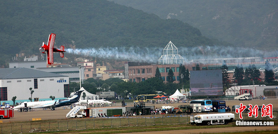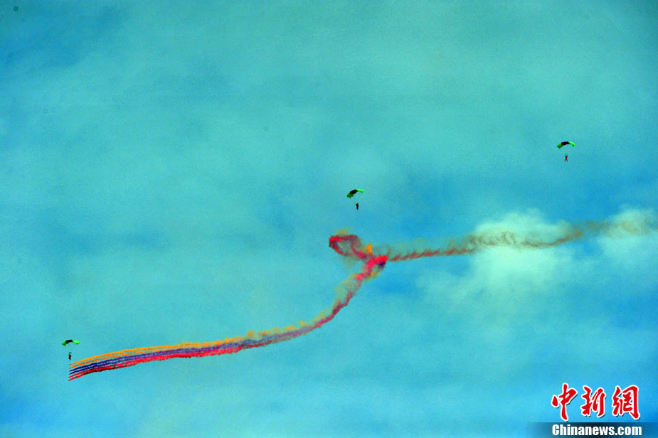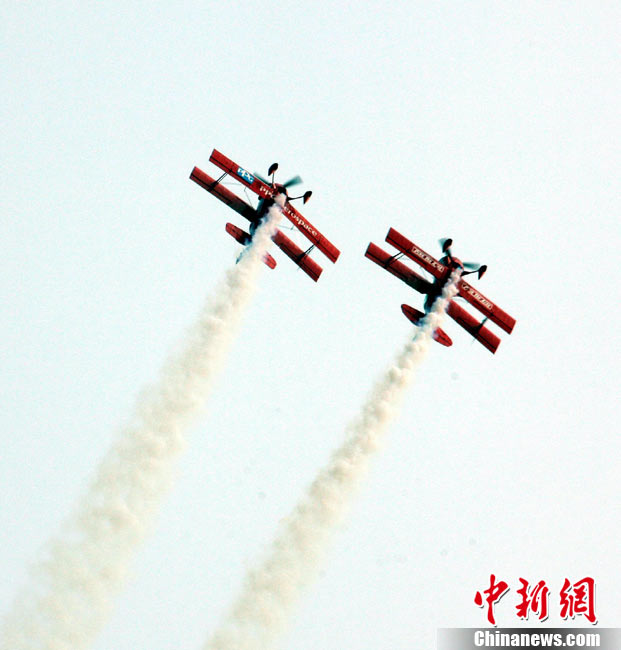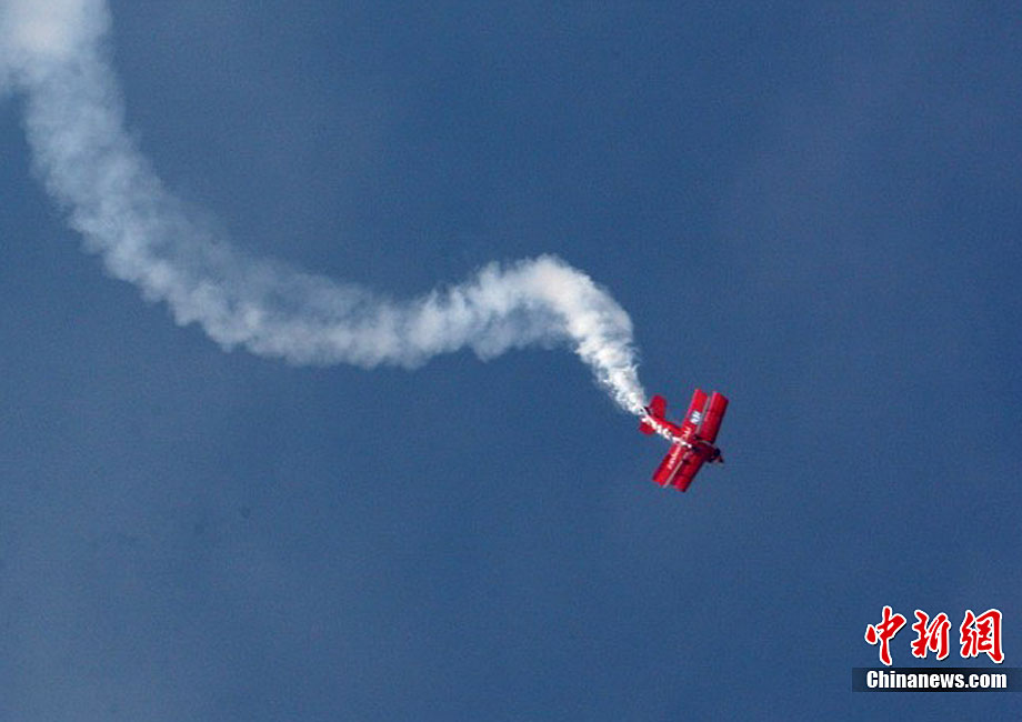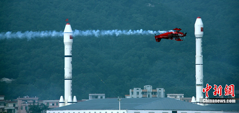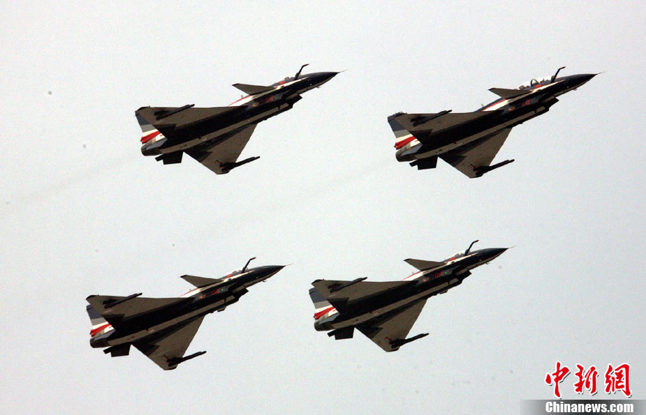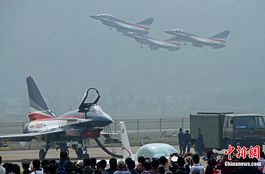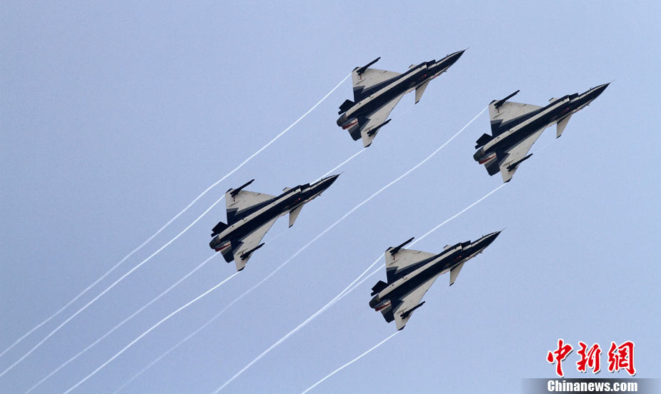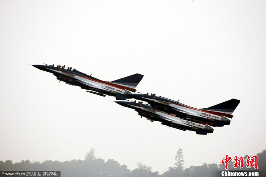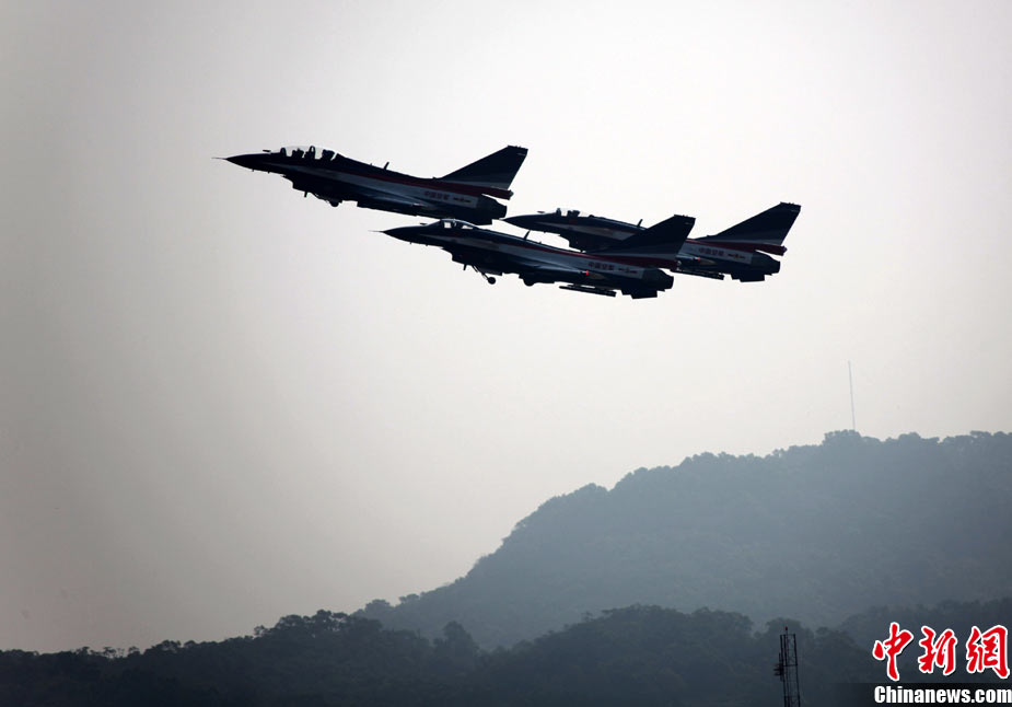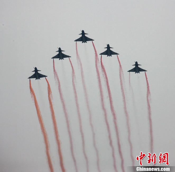 11月19日,在珠海第8屆中國國際航空航天博覽會上,巴基斯坦空軍雄獅飛行表演隊的空中英豪們駕駛k8教練機,憑借高超的飛行技藝,以珠海機場上空為舞臺,承、轉、啟、合,任意揮灑,給觀看的中外賓客以視覺享受。中新社發 喬天富 攝 圖片來源:CNSPHOTO